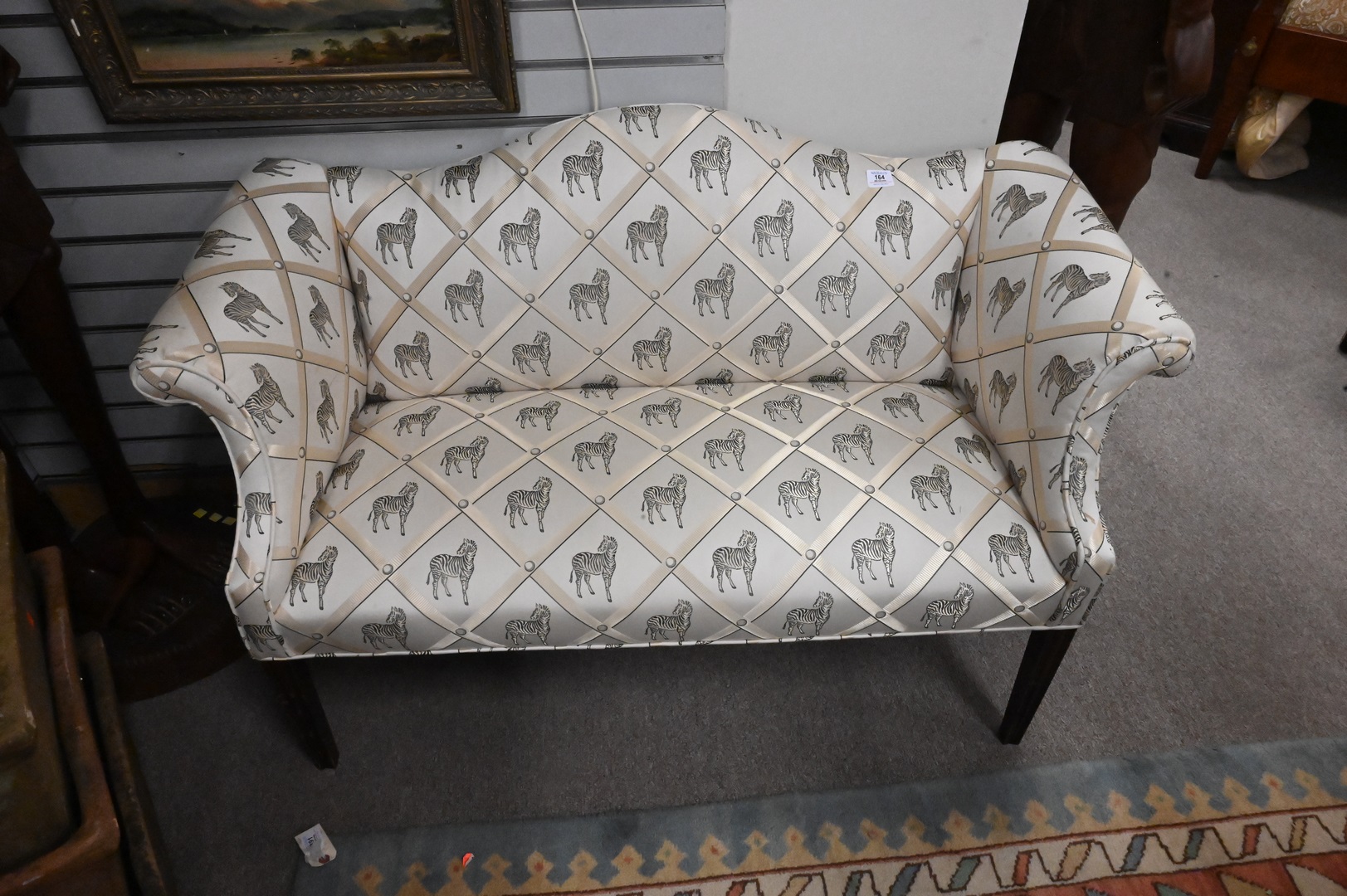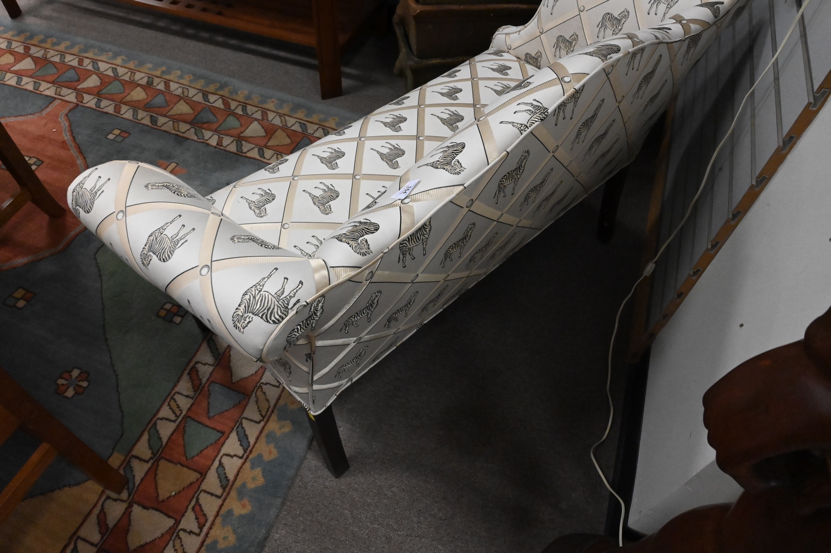 Contemporary Custom Upholstered Diminutive Bench, having zebra print upholstery, height 30 inches, length 48 inches.