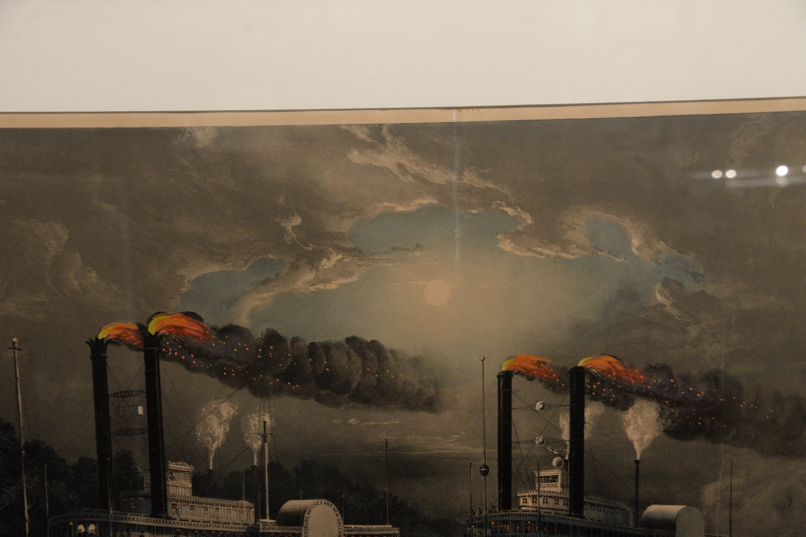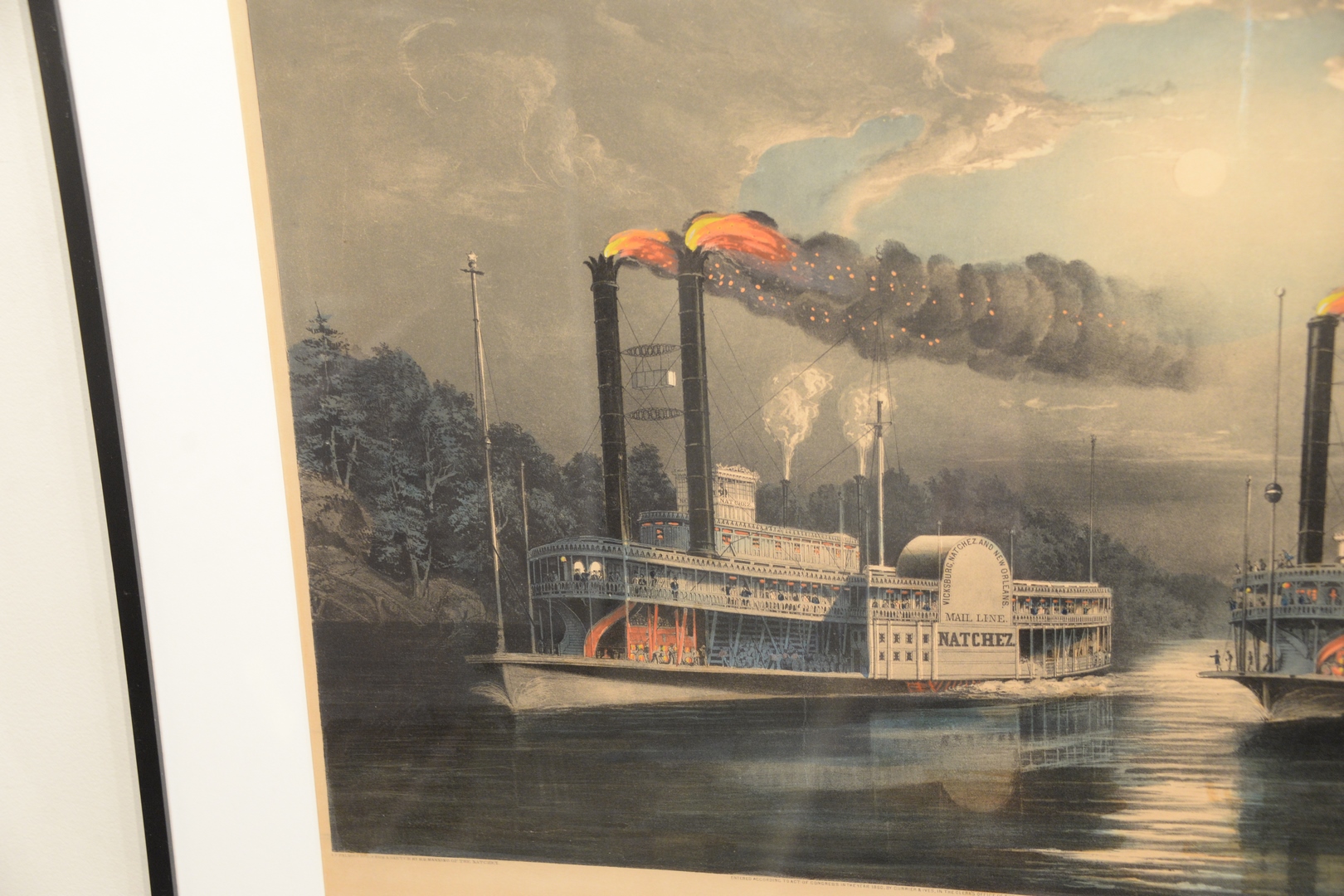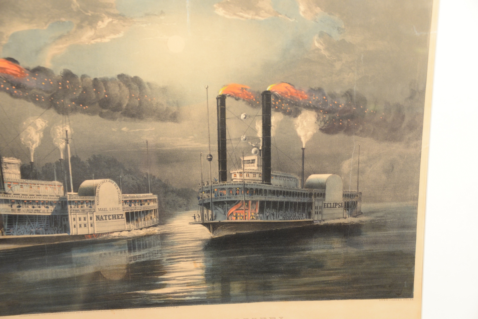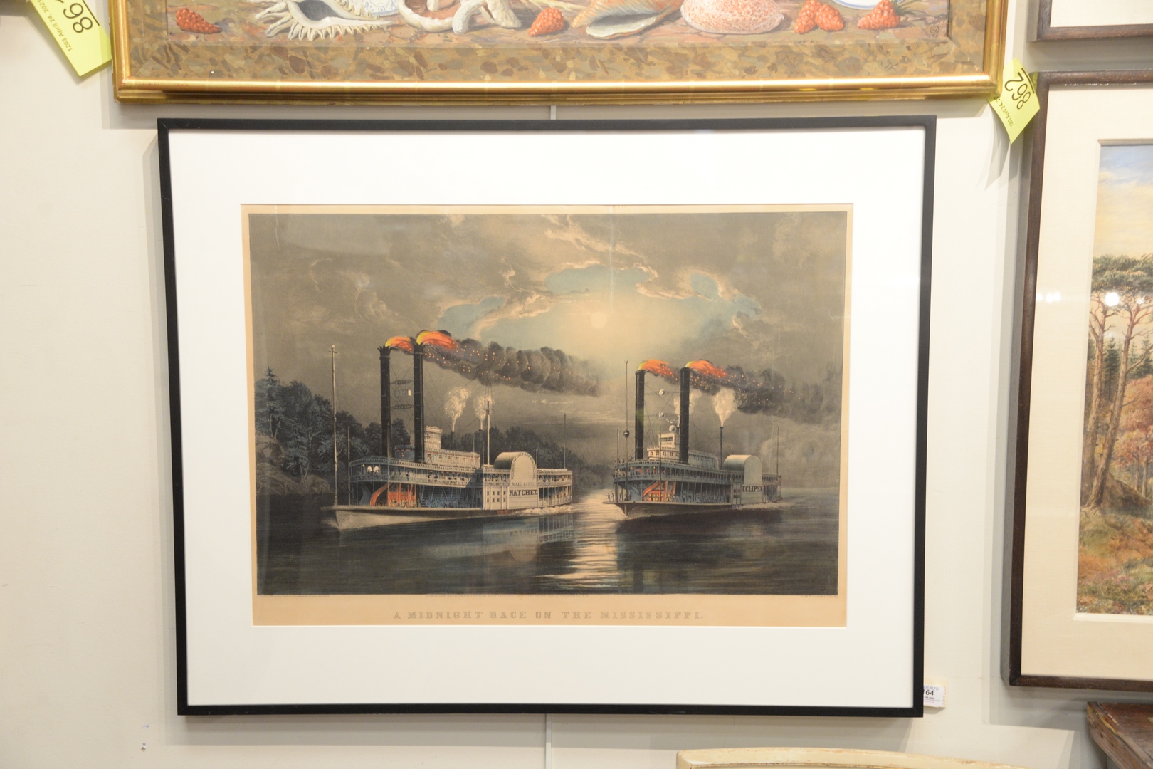 Lot 164: Currier and Ives Hand-Colored Lithograph on Paper, A Midnight Race on the Mississippi, credit lines in plate along the lower margin, image size: 18 1/4 x 27 1/2, as is with several repaired tears and heavy toning.
