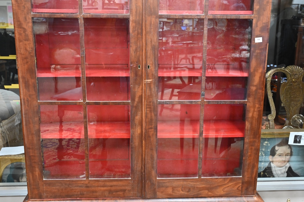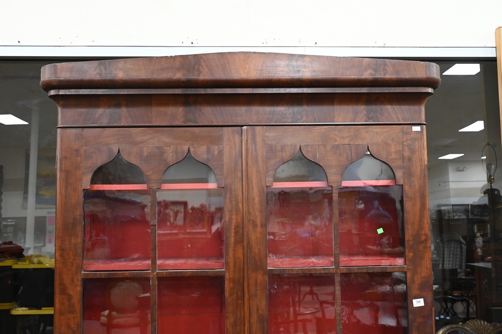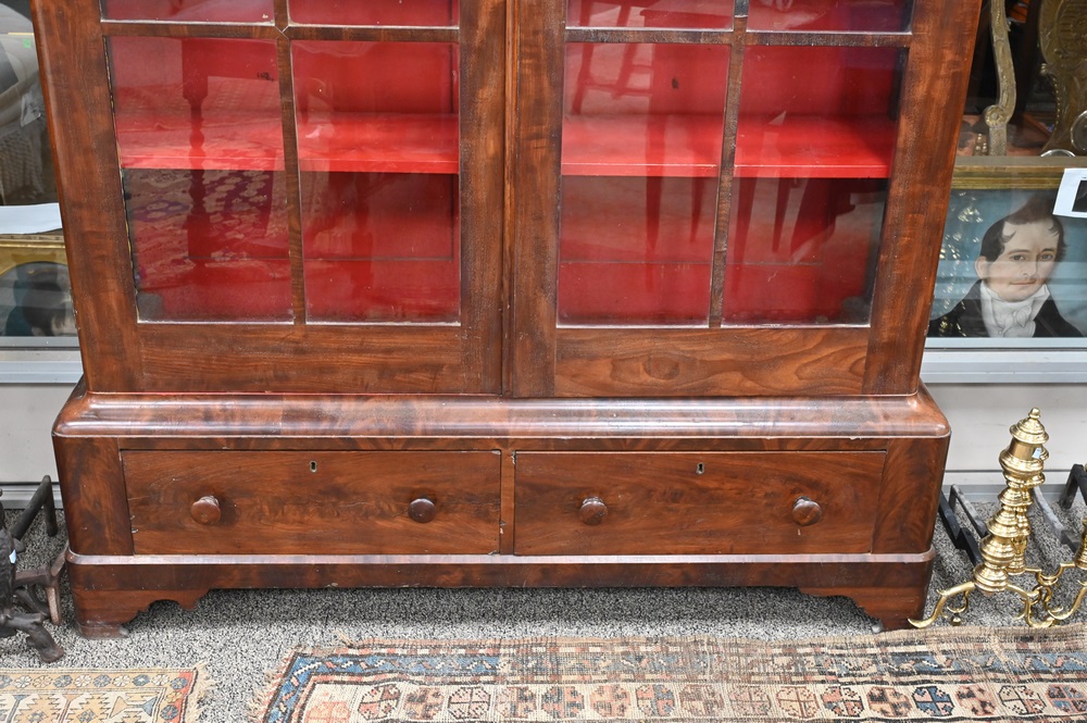 Lot 164: Empire Mahogany Three Part Bookcase/Cabinet, with two arched top doors over two drawers, circa 1840, height 90 inches, width 53 1/2 inches, depth 15 1/2 inches.