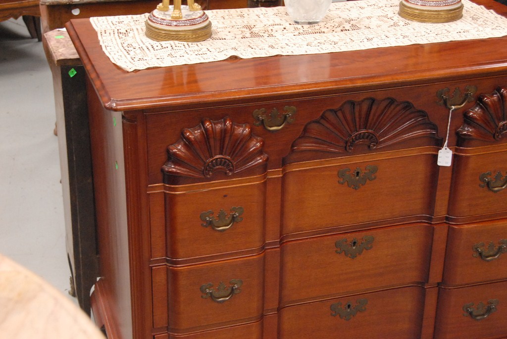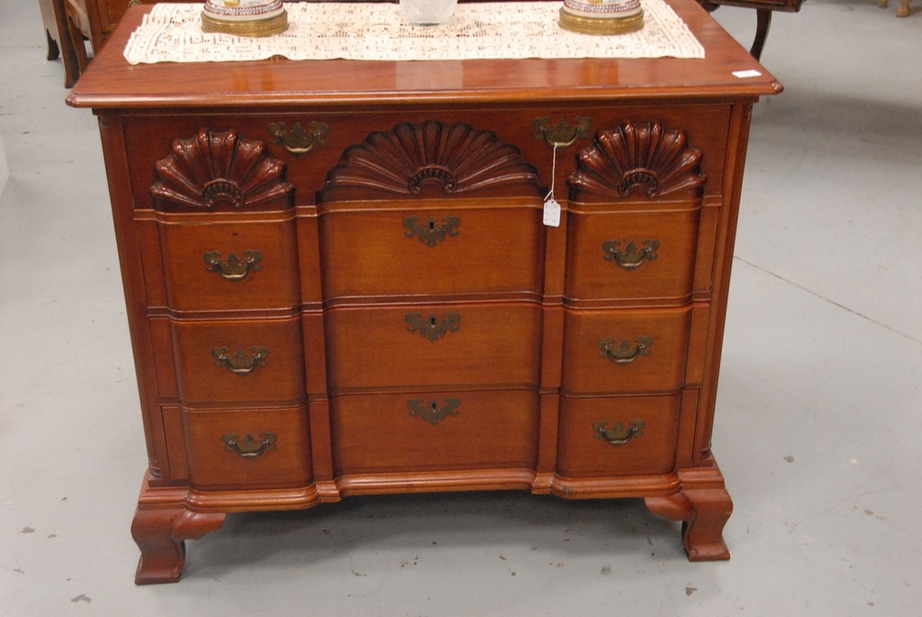 Lot 164: Fineberg mahogany block front chest having rectangular top over four drawers with triple shell carvings flanked by fluted quarter co…