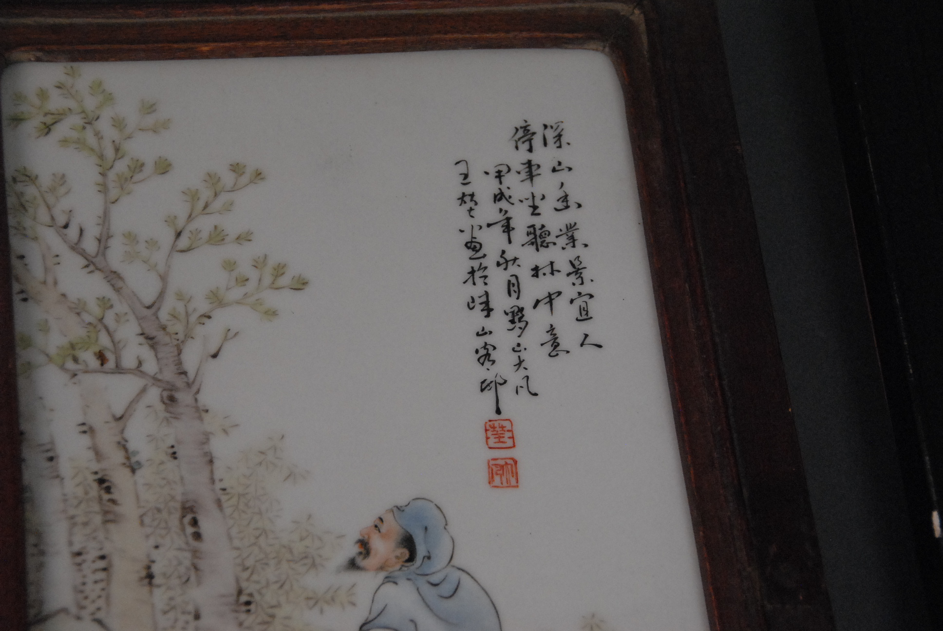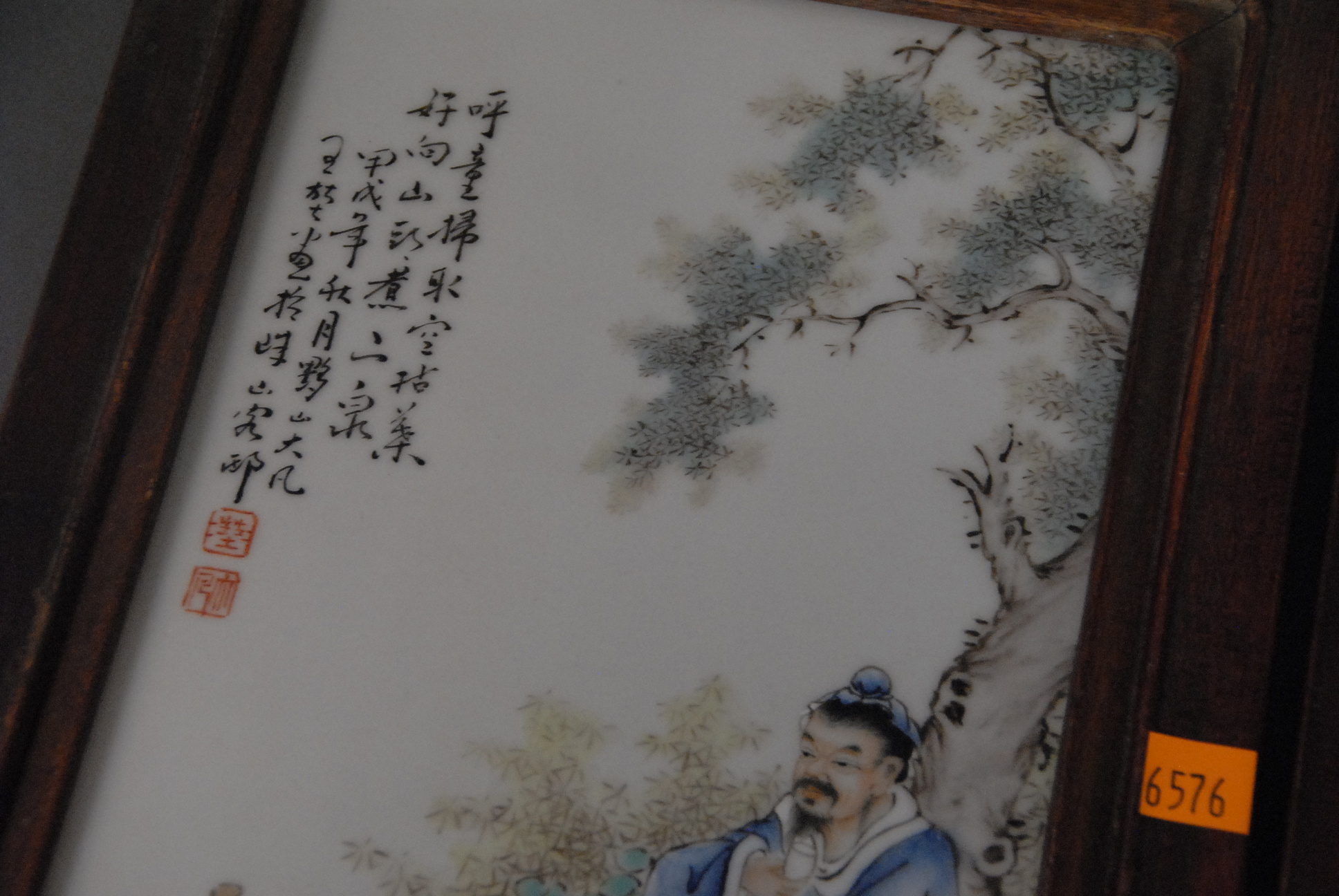 Pair of Famille rose framed Oriental plaques of scholar with a young girl, 14 x 7 1/2.