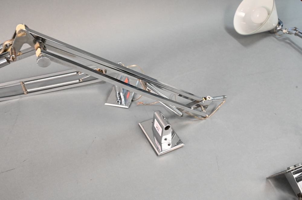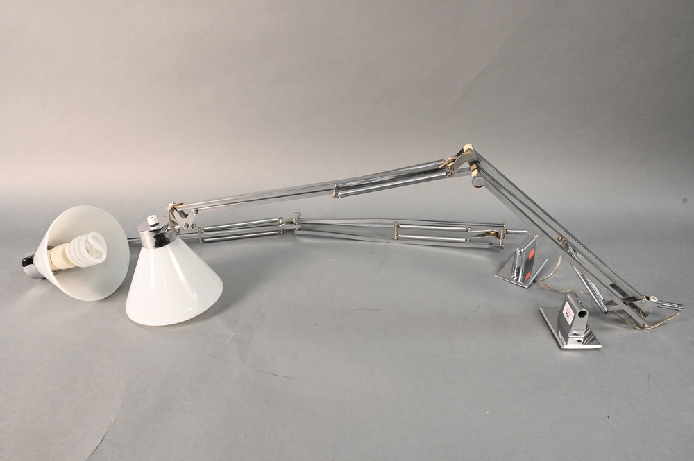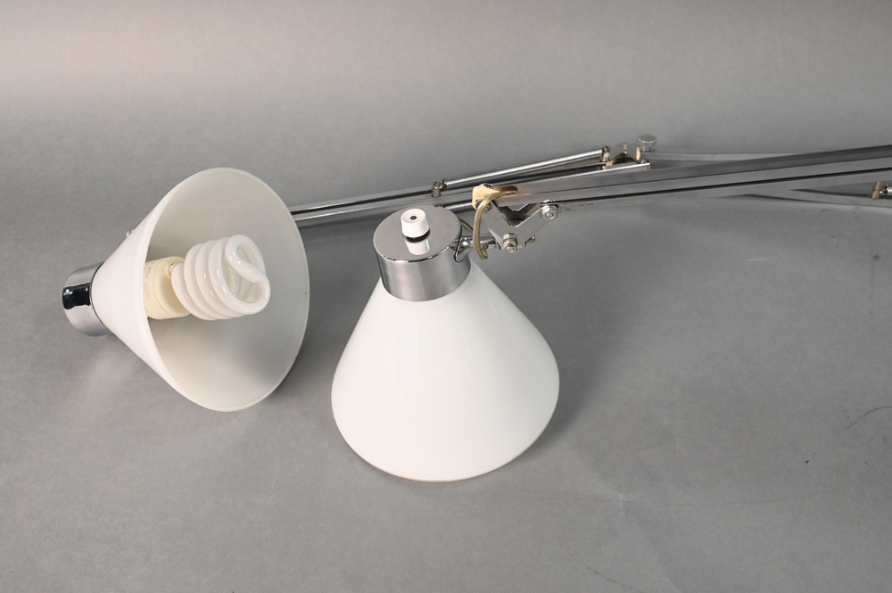 Lot 164: Pair of Luxo Chrome Wall Lamps, adjustable articulating bedside or desk style with white glass shades.