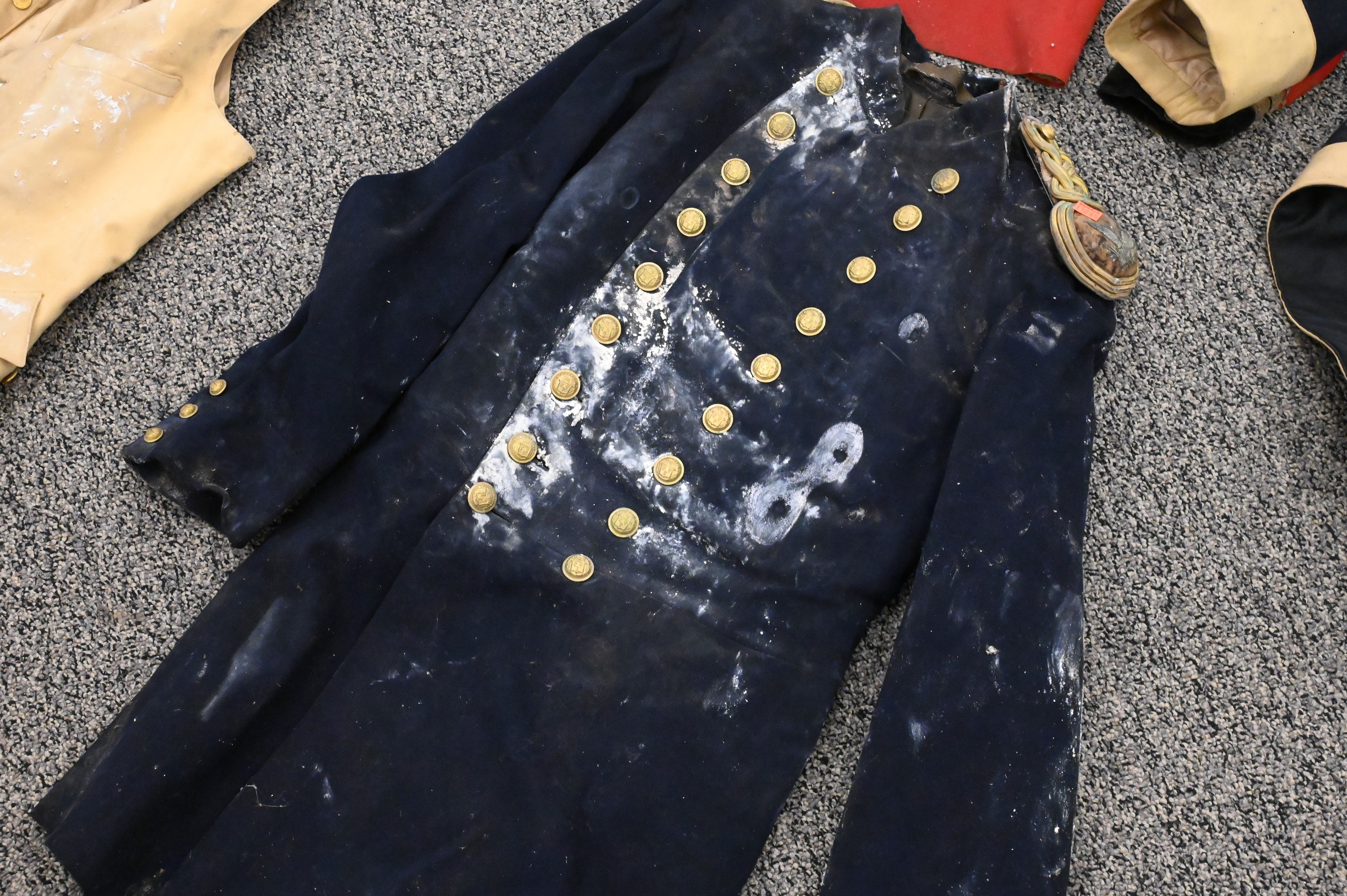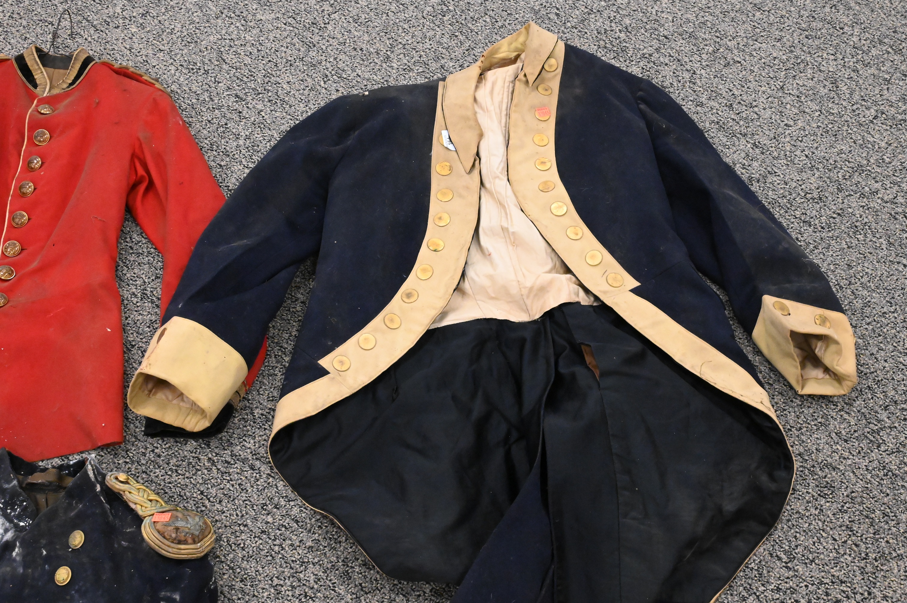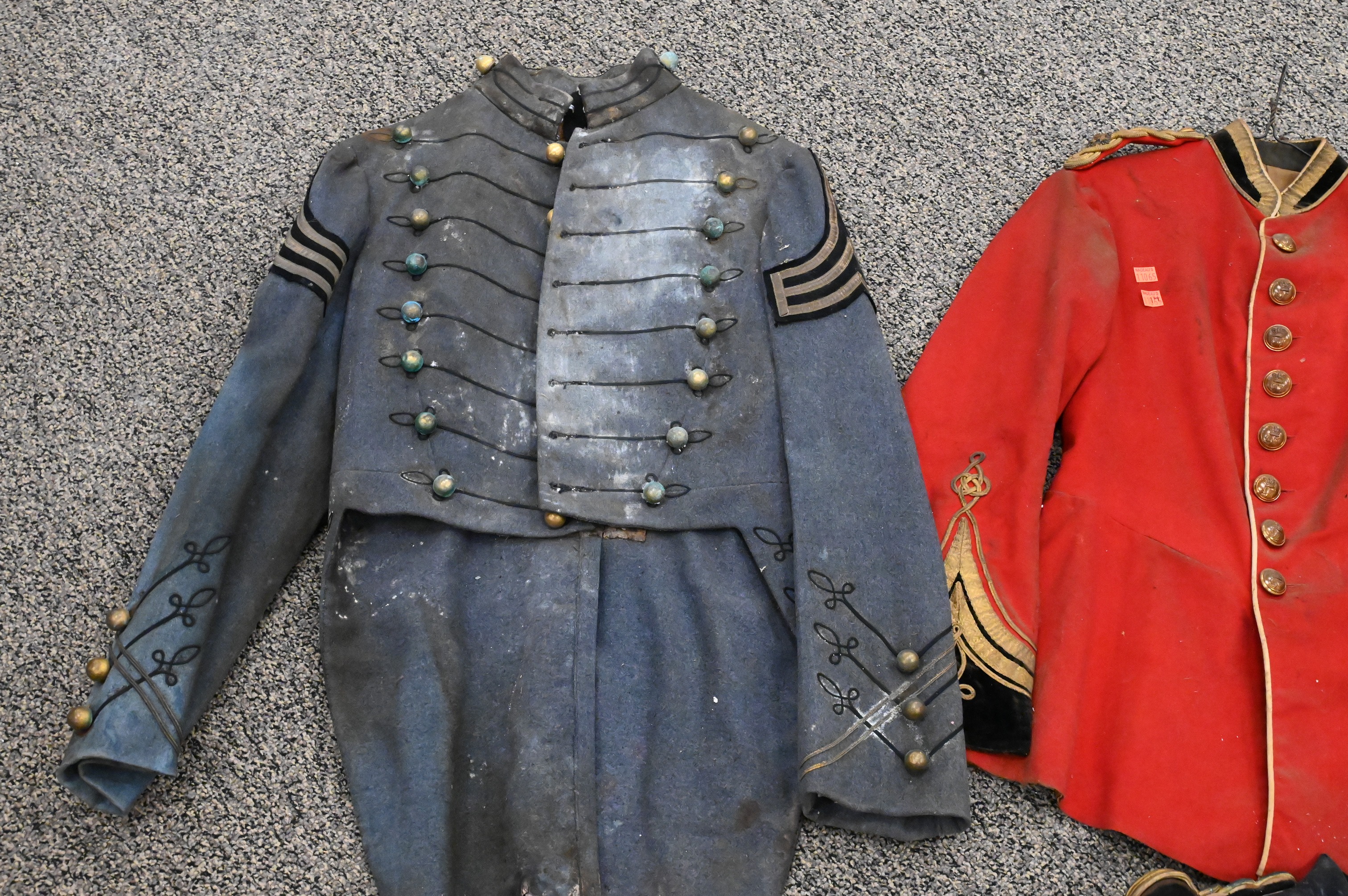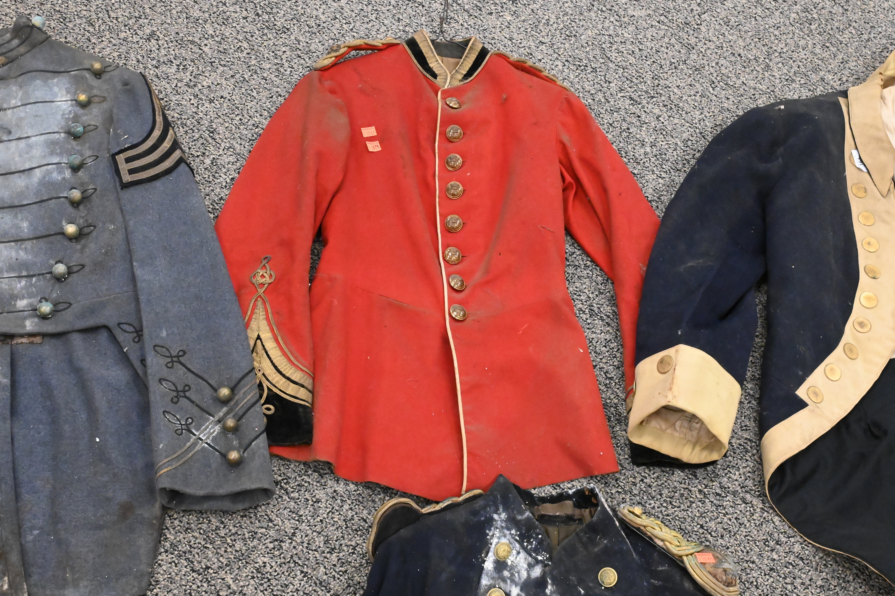 A British officer’s red wool tunic with black velvet collar and cuffs, decorated with gilt buttons and bullion epaulettes