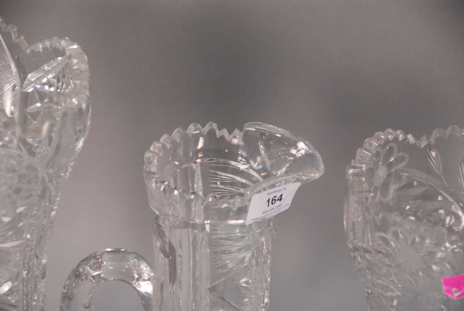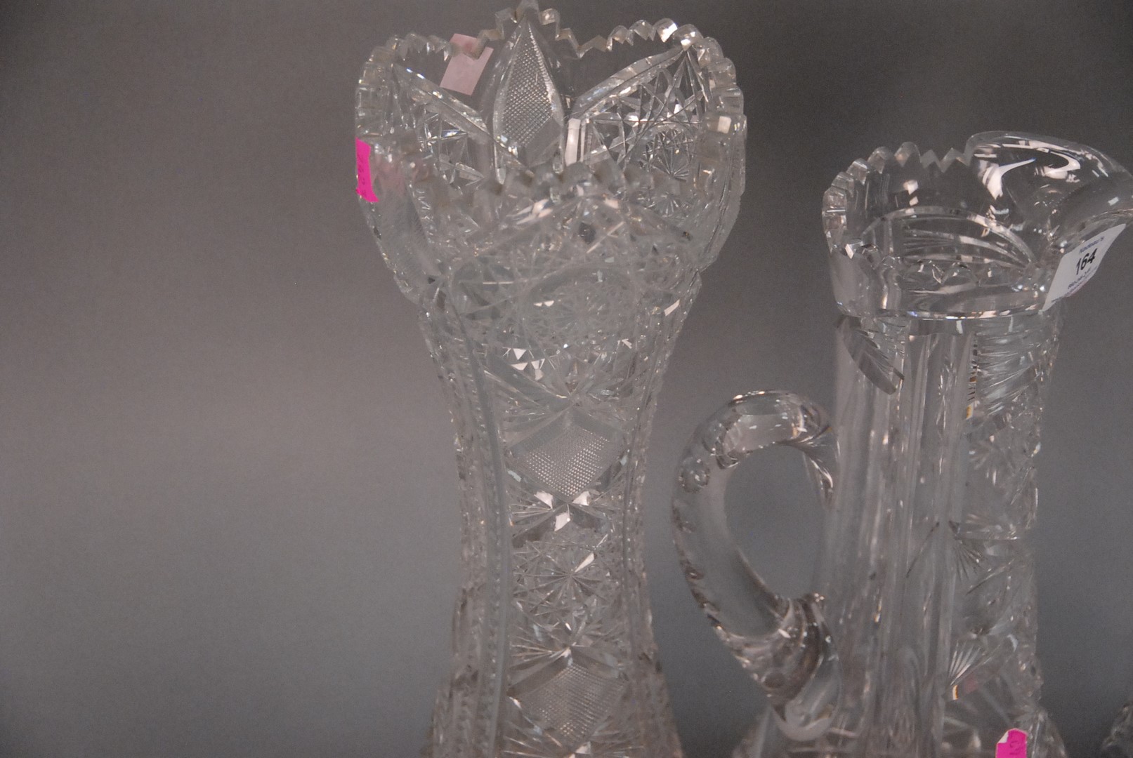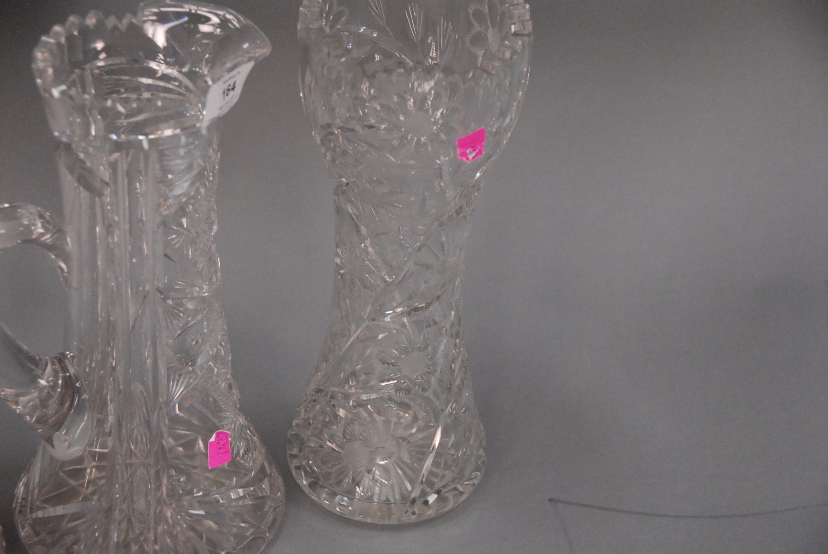 Lot 164: Three piece cut glass lot including pitcher and two vases one tooth chipped on one vase. pitcher: