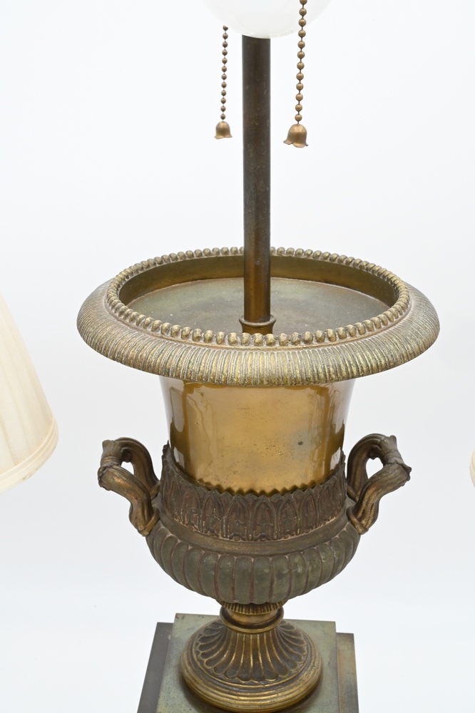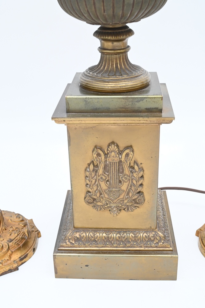 Three Table Lamps, to include a pair of French gold gilt candlestick lamps, having all over scrollwork design, height 17 1/2 inches; along with an urn on brass pedestal base, height 30 inches.