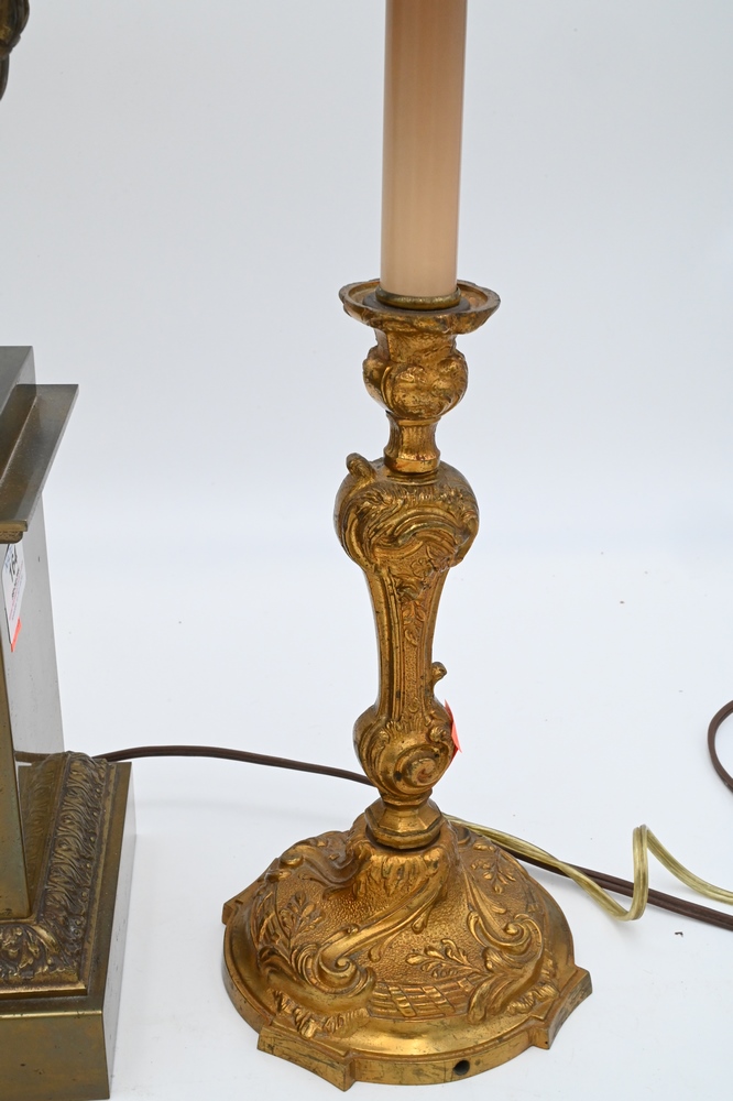 Lot 164: Three Table Lamps, to include a pair of French gold gilt candlestick lamps, having all over scrollwork design, height 17 1/2 inches; along with an urn on brass pedestal base, height 30 inches.