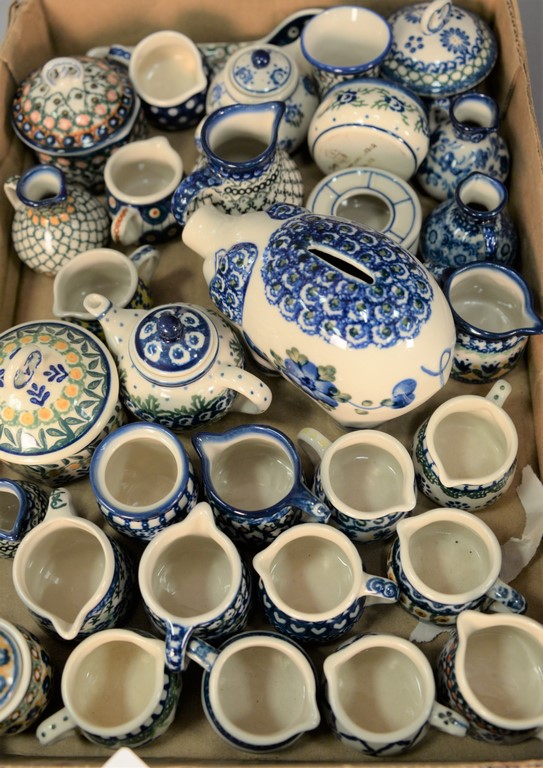 Tray lot of miniature handmade Polish pottery pieces including mugs, creamers, piggy bank, sugars, covered jars, etc. hand painted and all marked handmade in Poland, most marked Unikat. ht. 1 1/2in. to 3 1/2in.