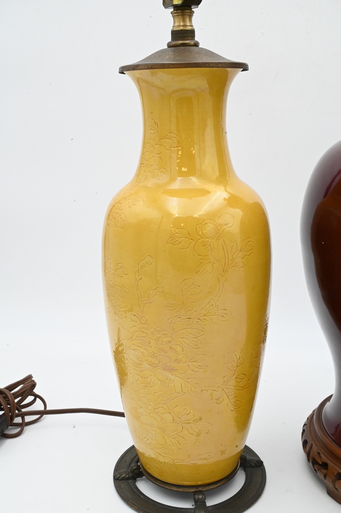 Two Chinese Glazed Vases, to include a yellow glaze vase having incised flowers and bird design, height 13 1/2 inches; along with a red glazed lobed vase, height 14 1/2 inches; both made into table lamps.