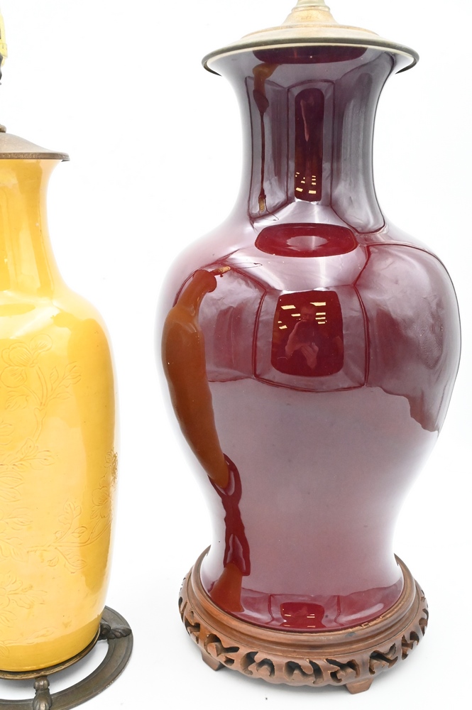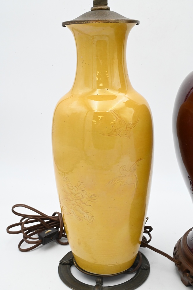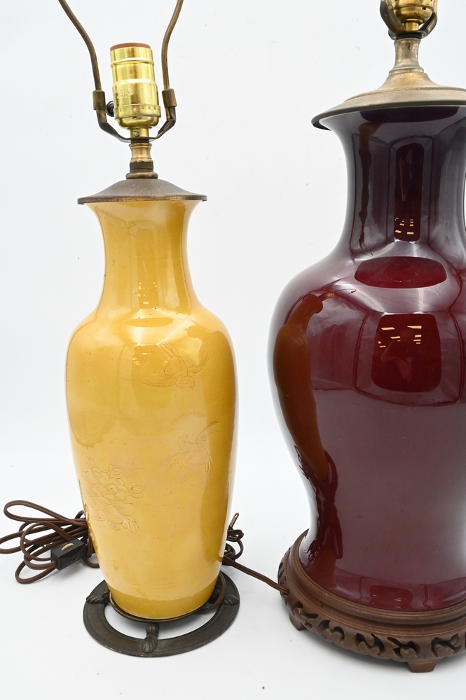 Lot 164: Two Chinese Glazed Vases, to include a yellow glaze vase having incised flowers and bird design, height 13 1/2 inches; along with a red glazed lobed vase, height 14 1/2 inches; both made into table lamps.