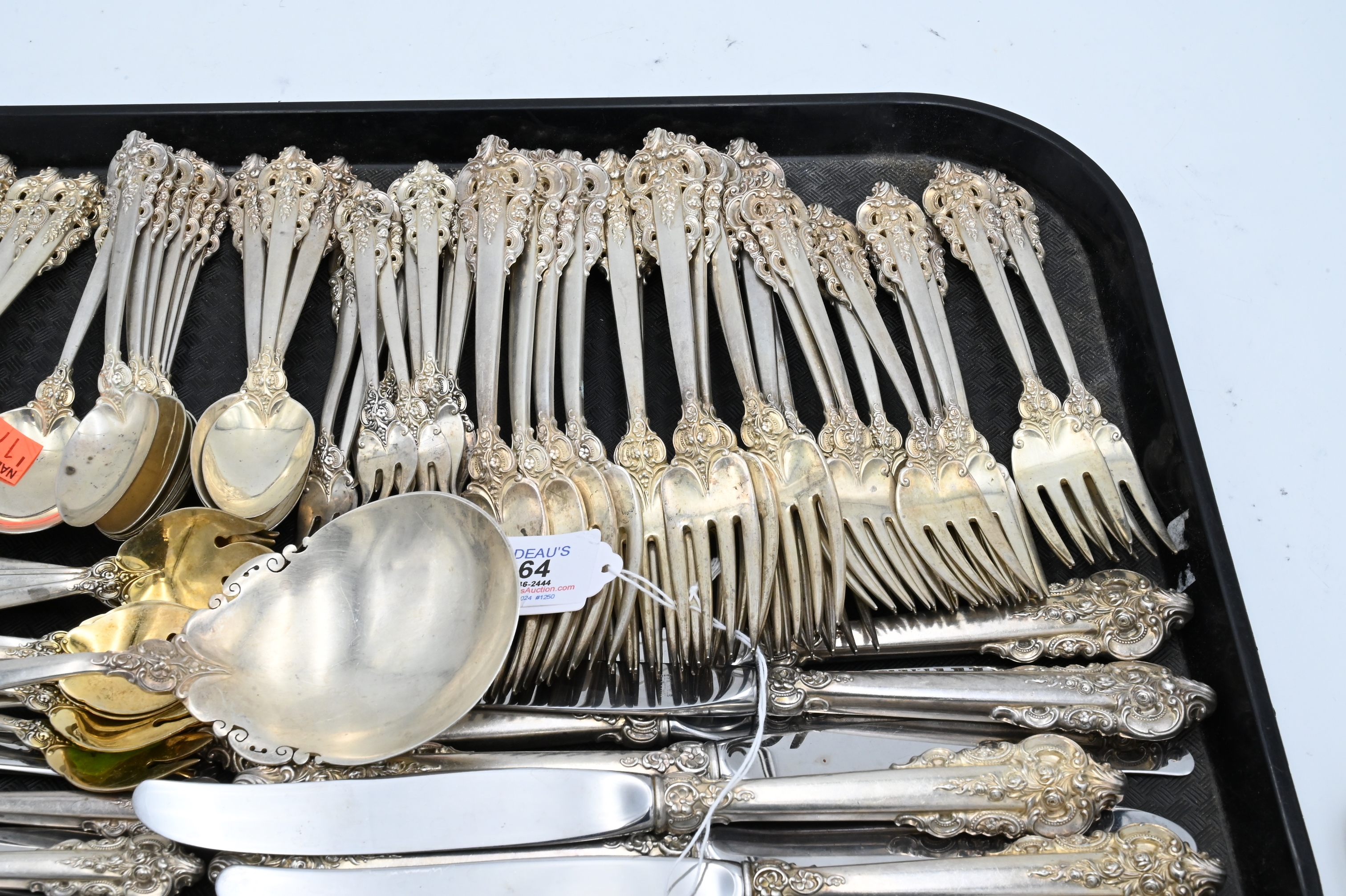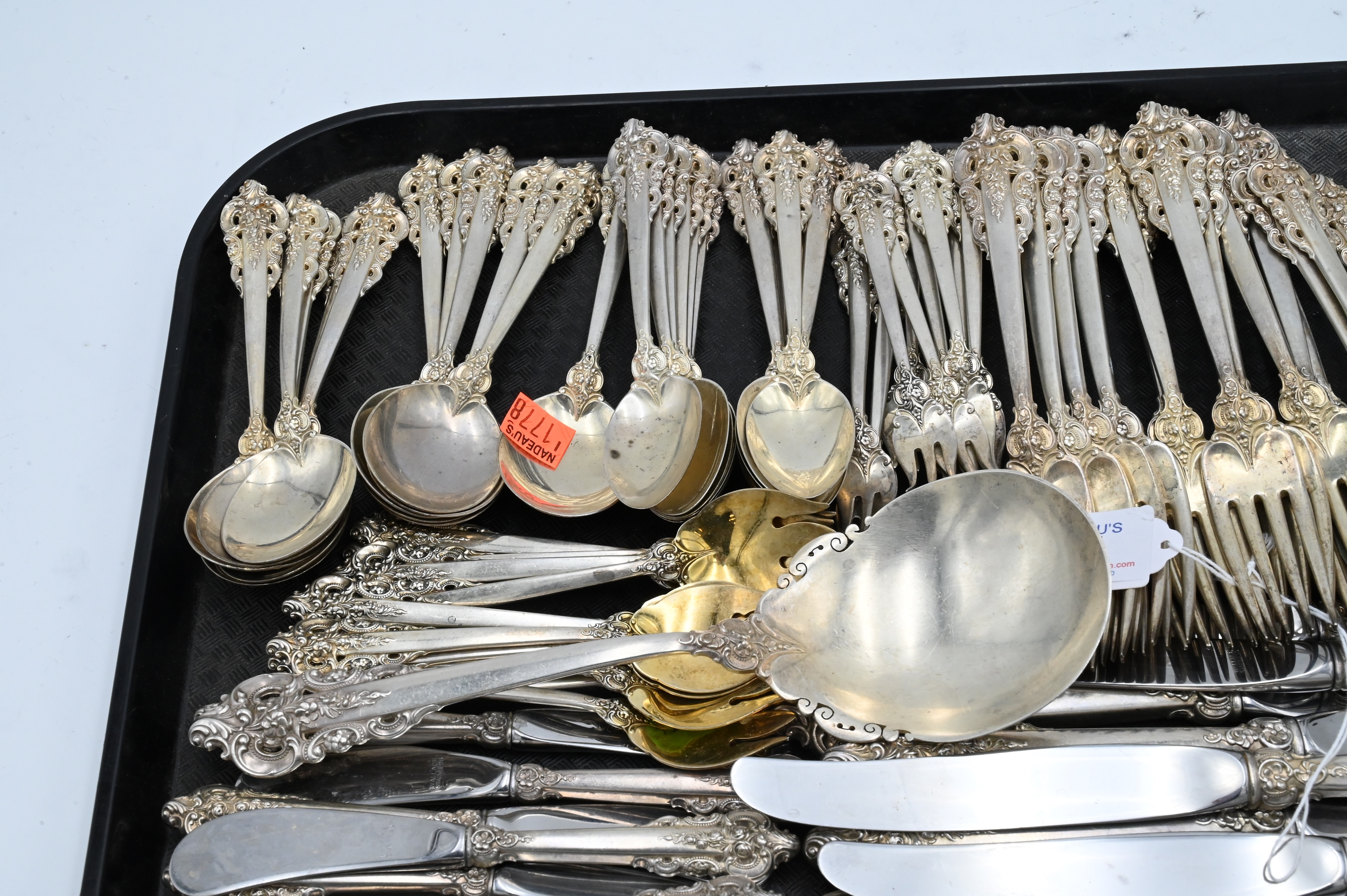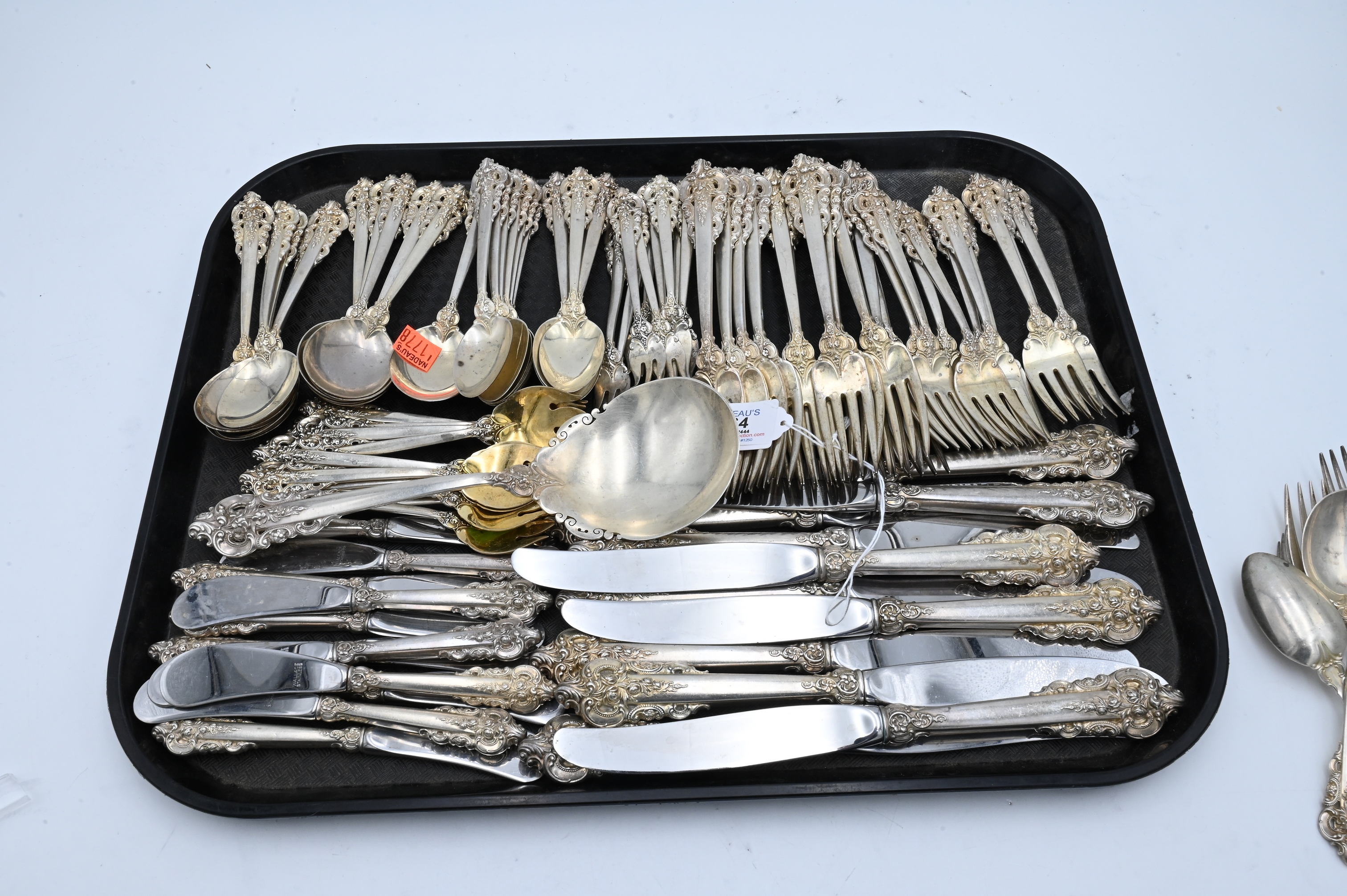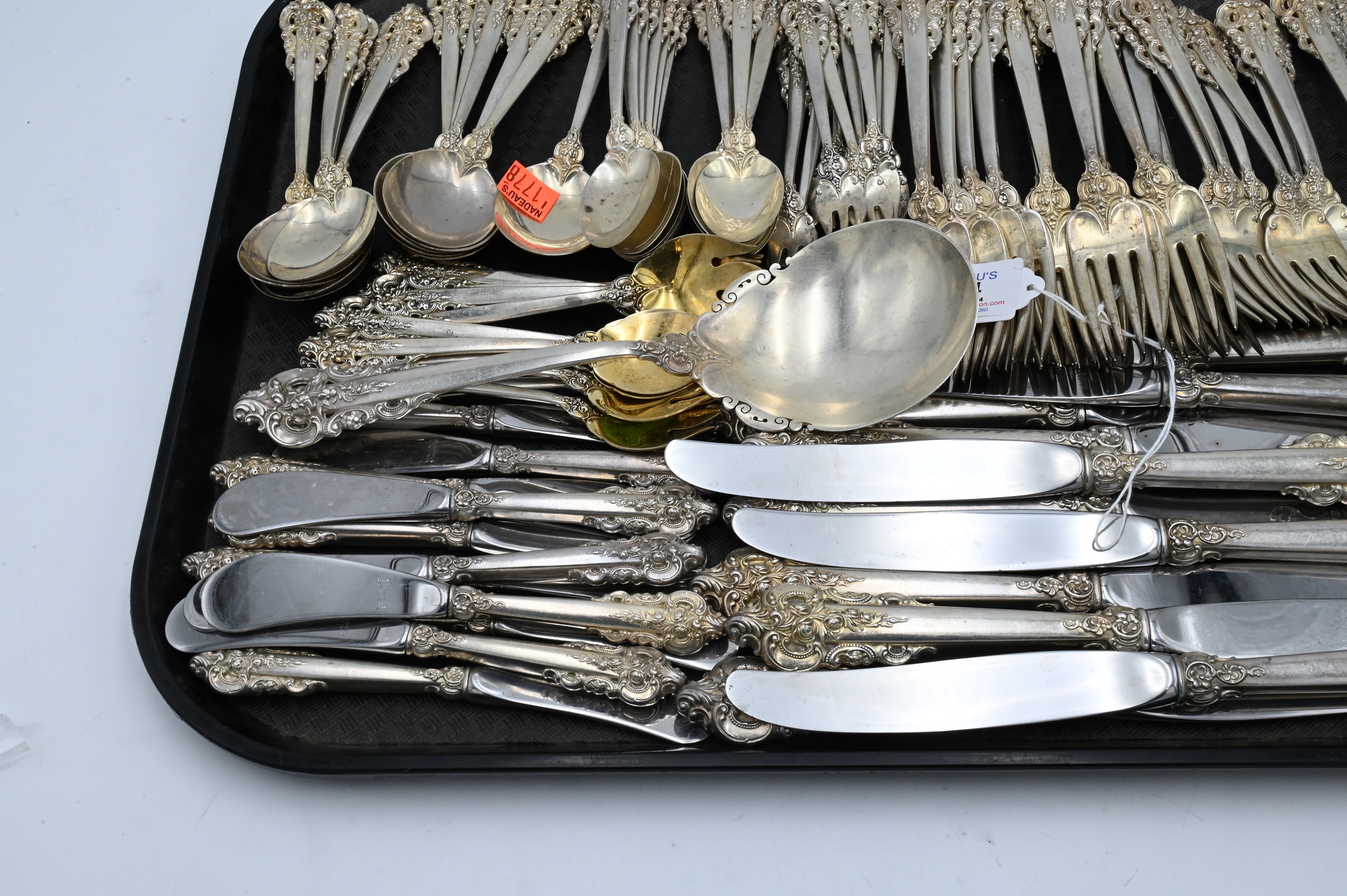 to include 12 dinner forks, 10 luncheon forks, 11 cocktail forks, 12 ice cream forks, 12 soup spoons, 12 teaspoons, 12 dinner knives, 12 butter knives, 1 serving spoon