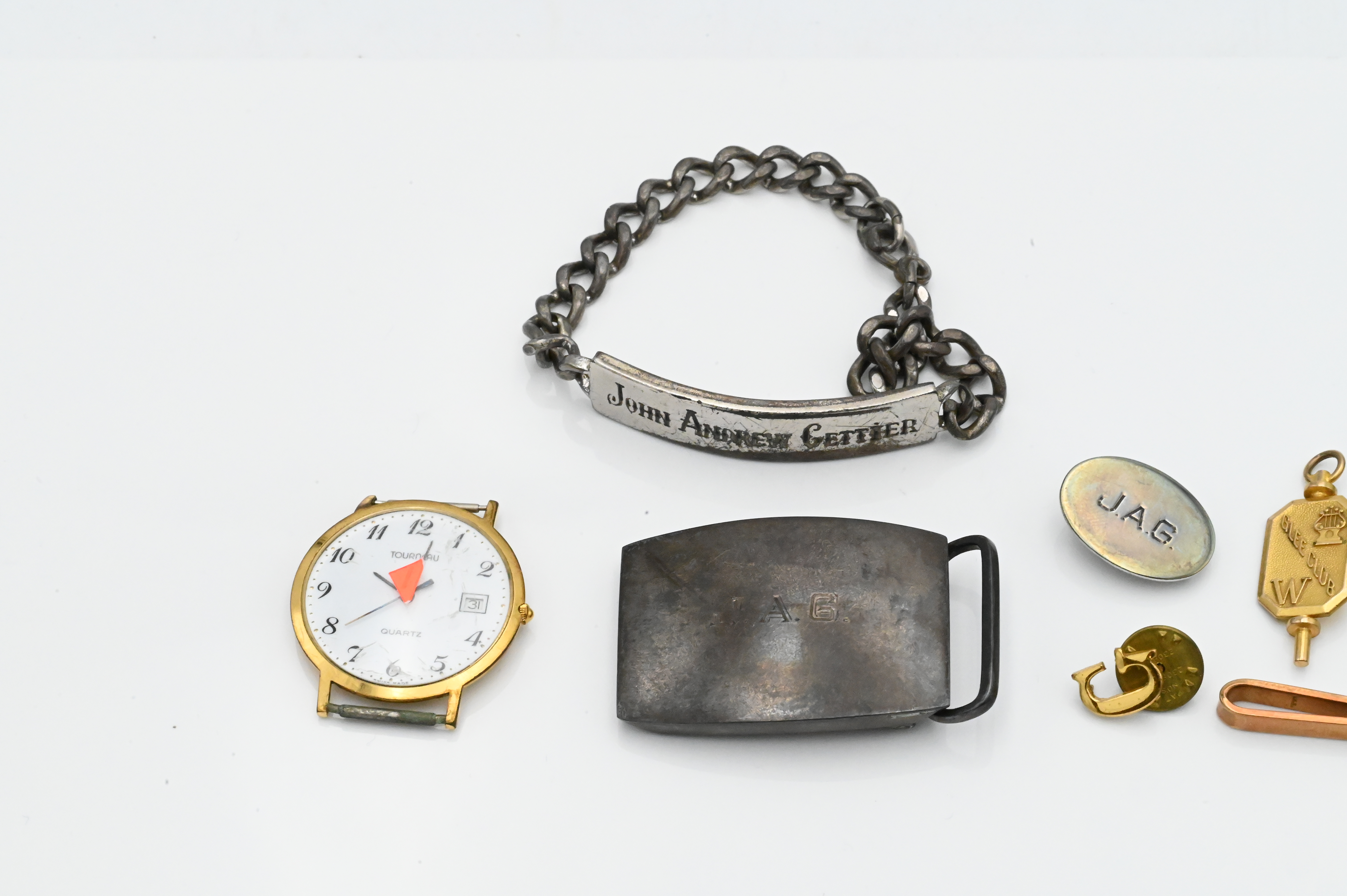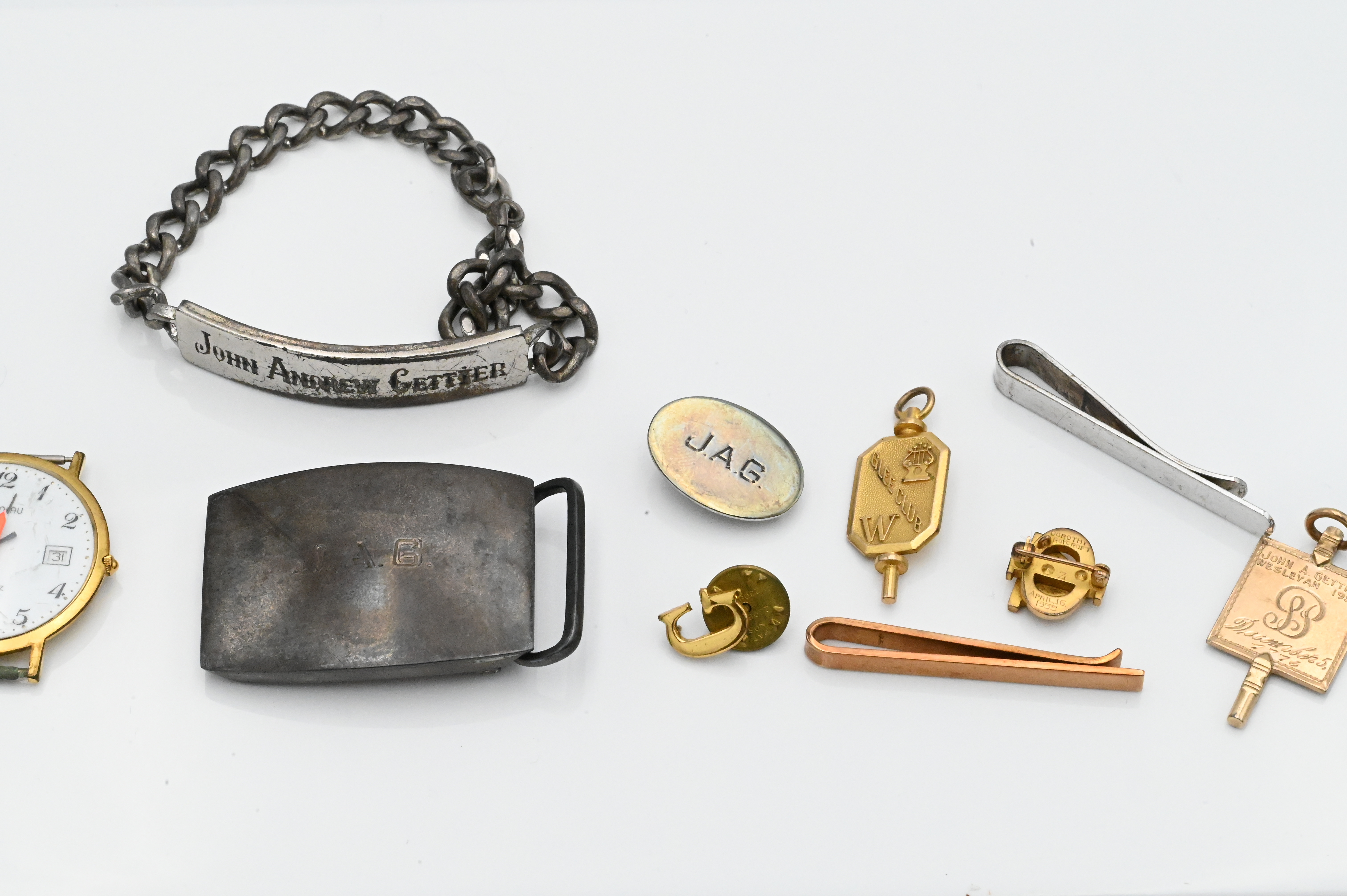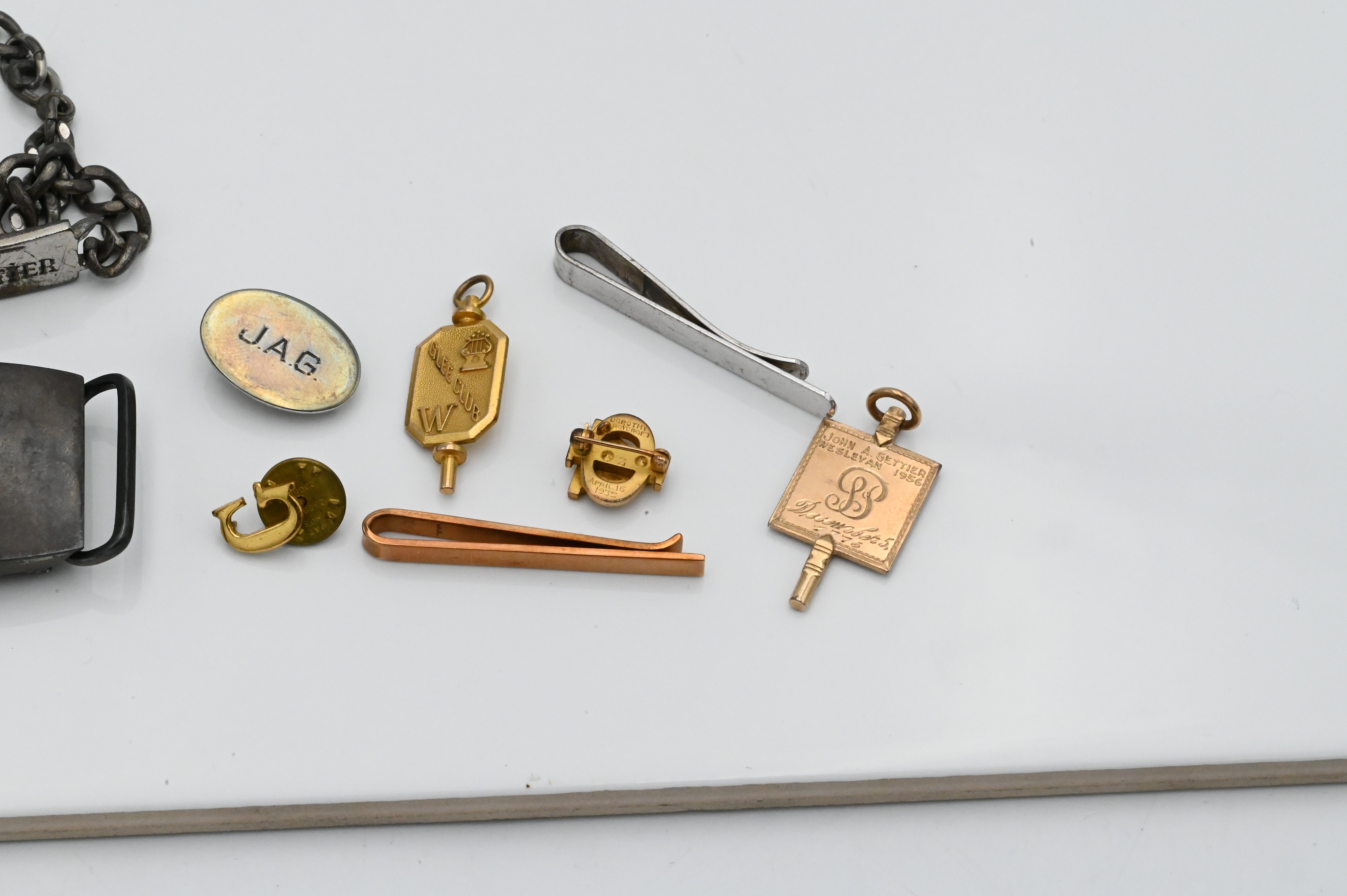 10 Karat Gold with Platinum Ring Lot, to include bracelet, pins, pair of cufflinks approximately 40 grams, along with sterling silver in Mark Cross jewelry box.