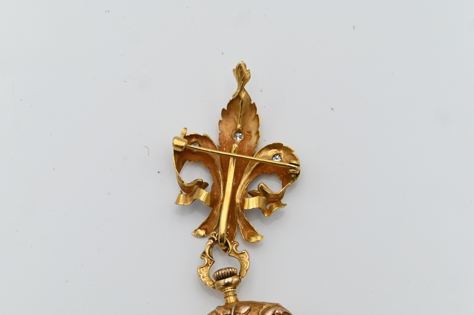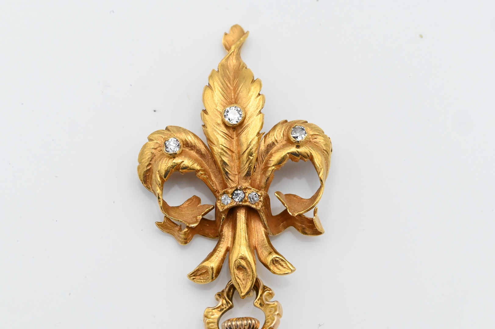 having fleur de-lis brooch mounted with six diamonds, back set with one diamond