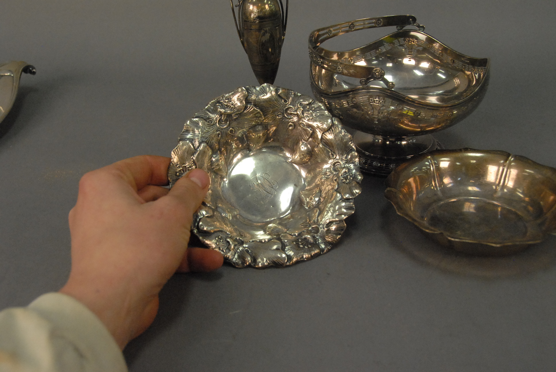 Lot 165: Four small sterling pieces, one basket by Spaulding, two bowls and an urn, 20.7 t oz.