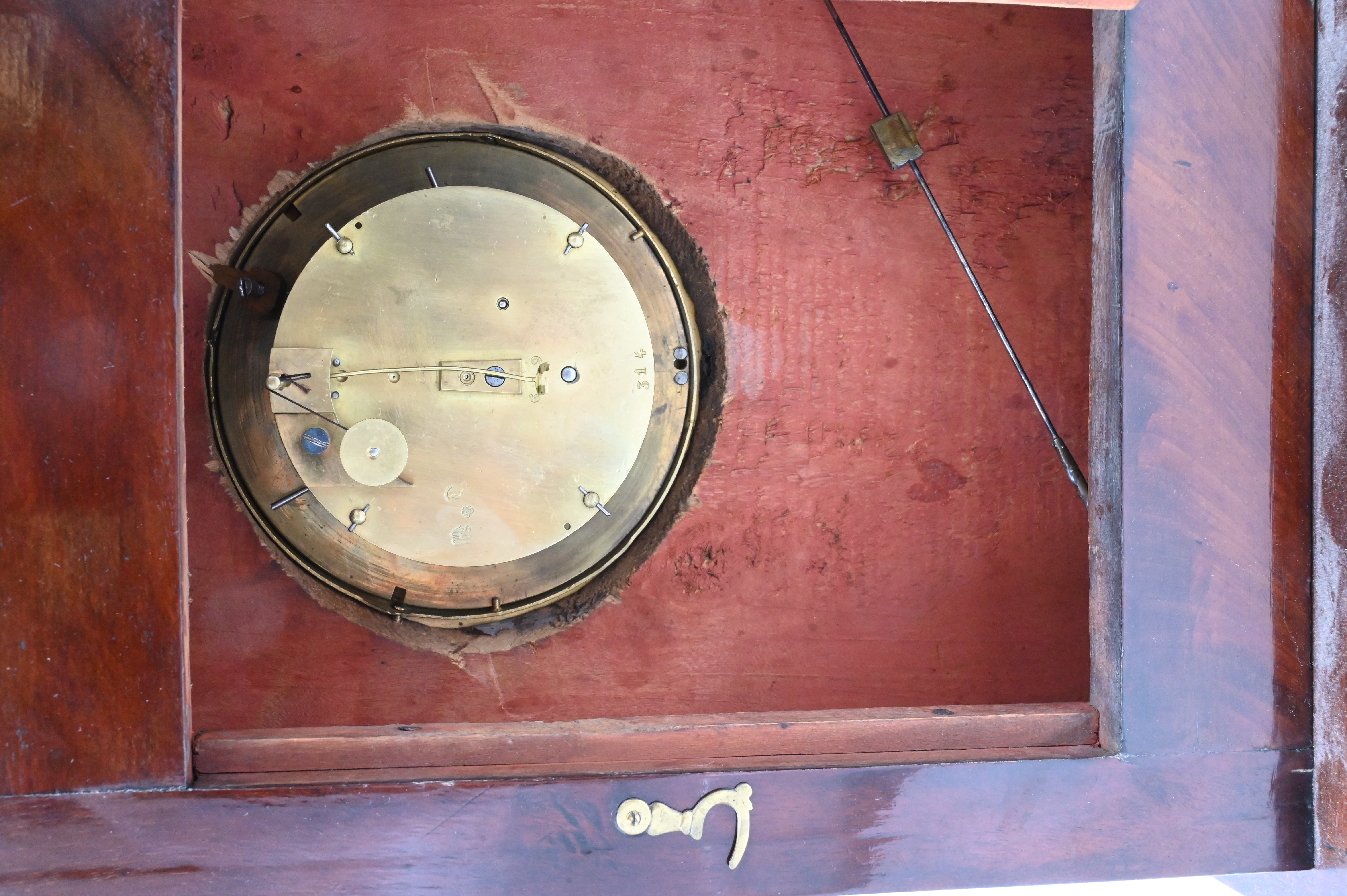 having ebonized and gilt Corinthian column supports mounted into a laquered wood case, surrounding ormolu and Roman numeral dial