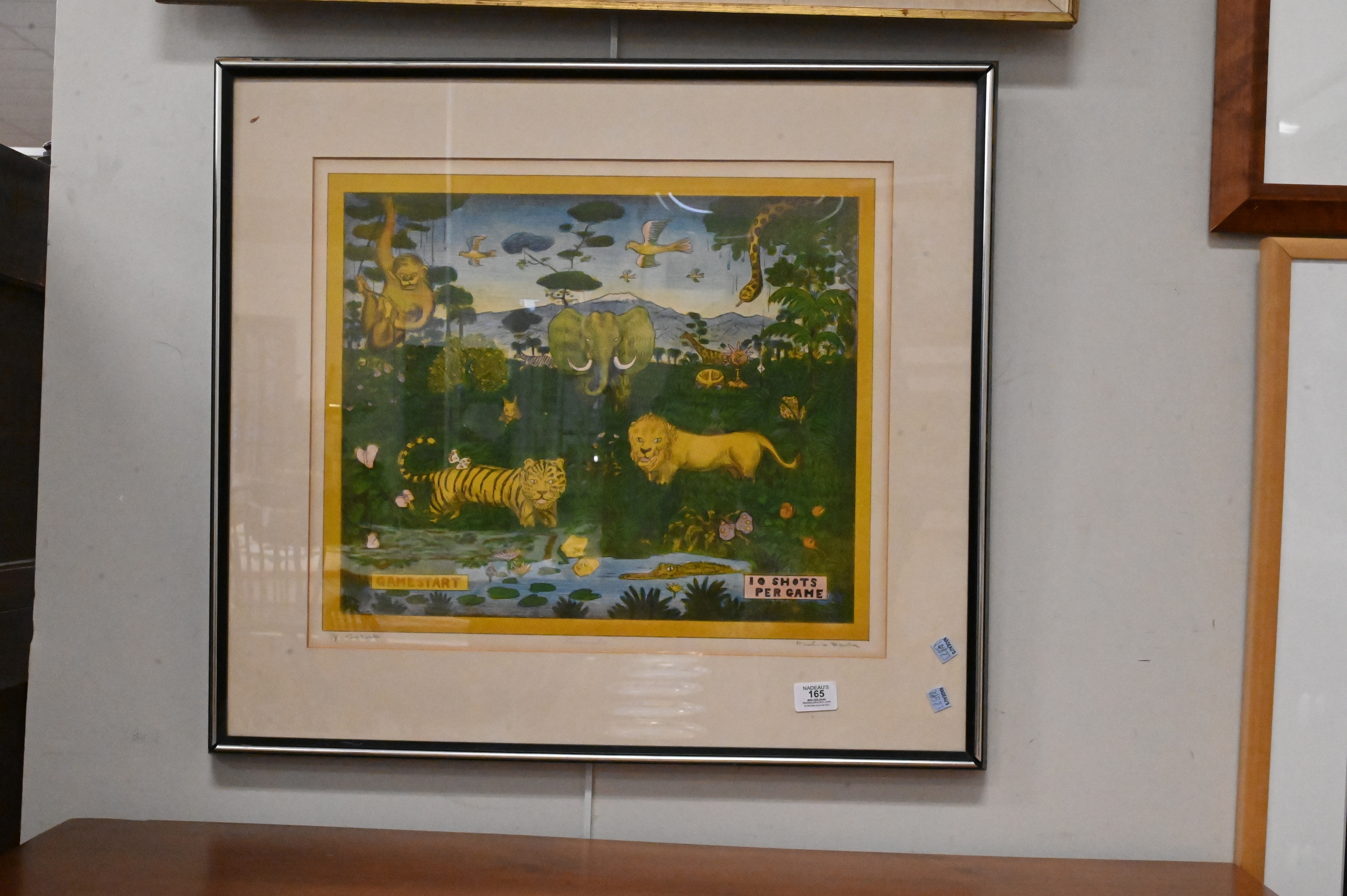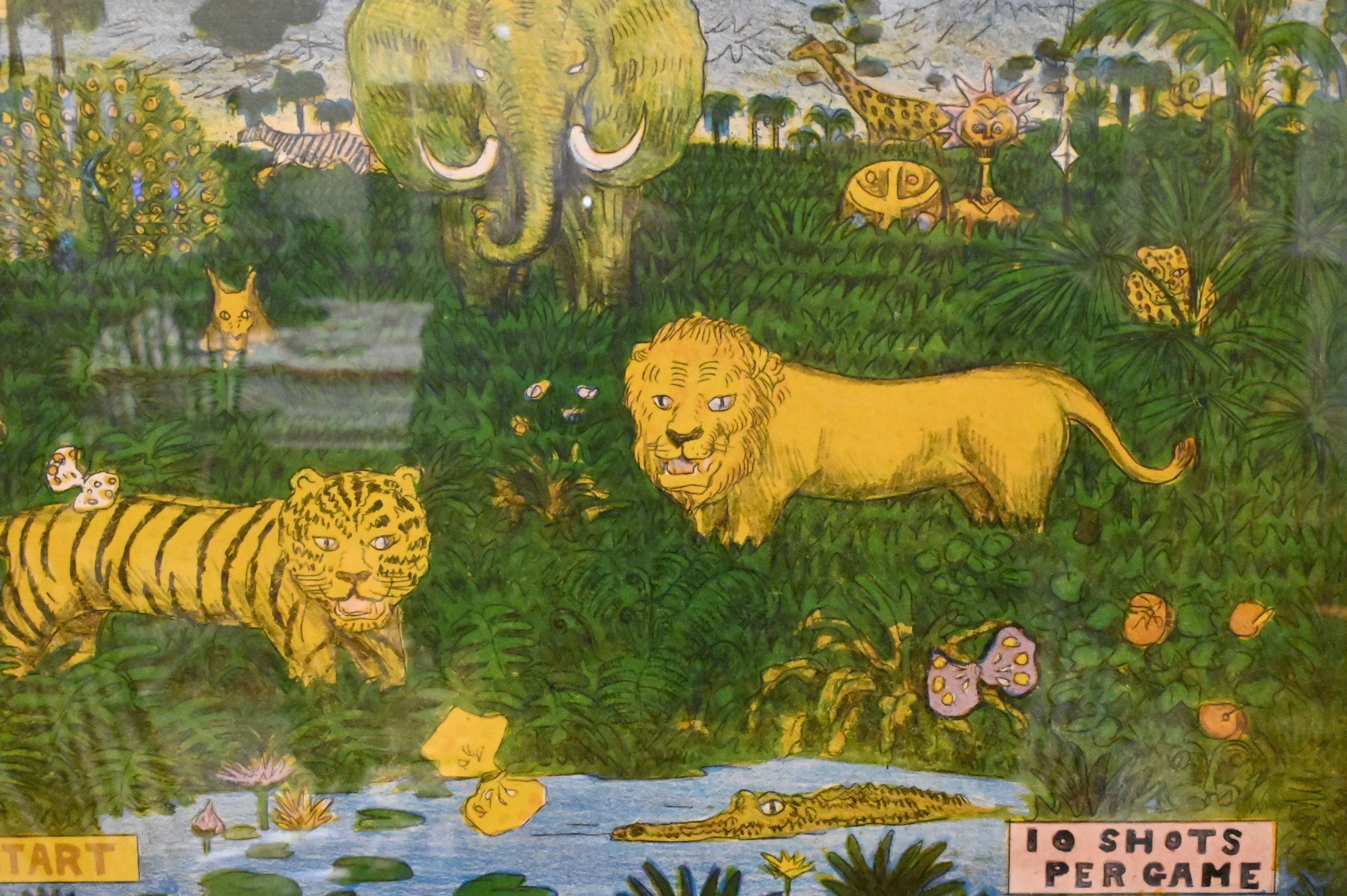 depicting a whimsical jungle scene with elephant, lion, tiger, monkey, giraffe, birds, and crocodile among lush foliage with humorous arcade-style elements reading “Game Start” and “10 Shots Per Game.”
