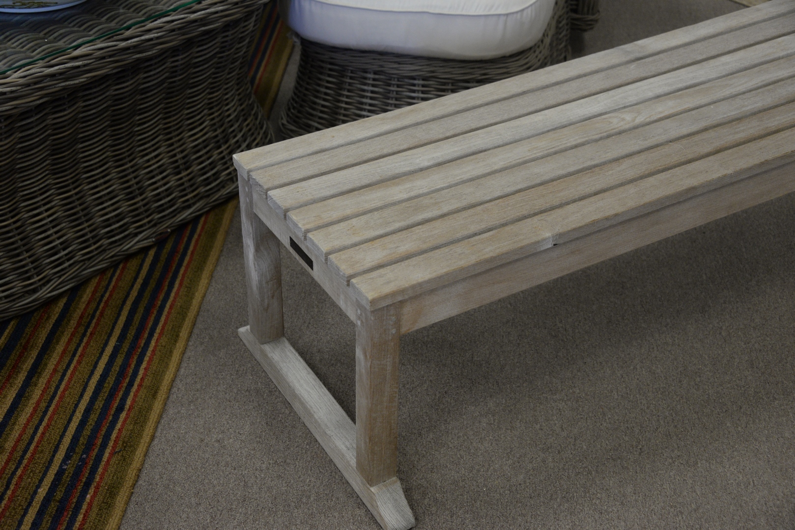 Kingsley Bate Teak Bench, height 16 1/2 inches, width 17 inches, length 71 1/2 inches.