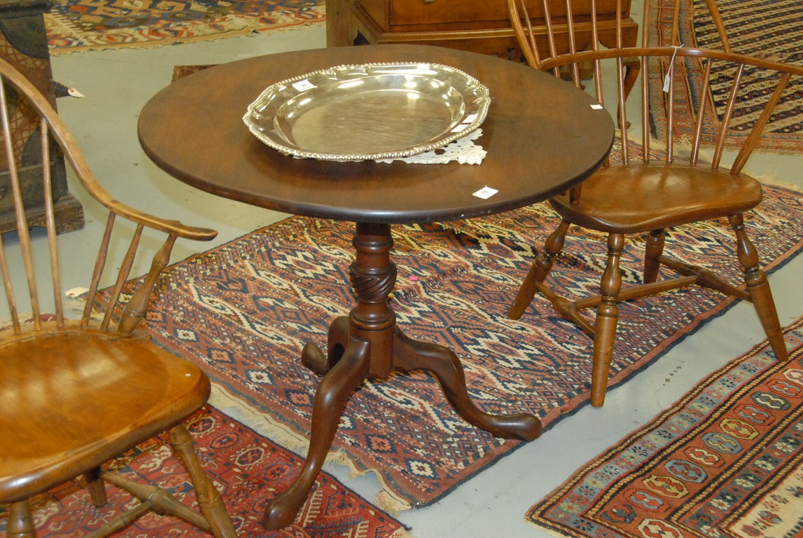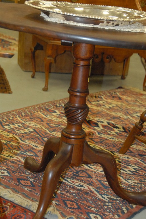 Mahogany tip table on spiral turned shaft on tripod base. ht. 28in. dia. 34in.