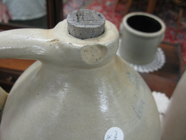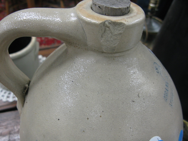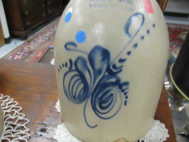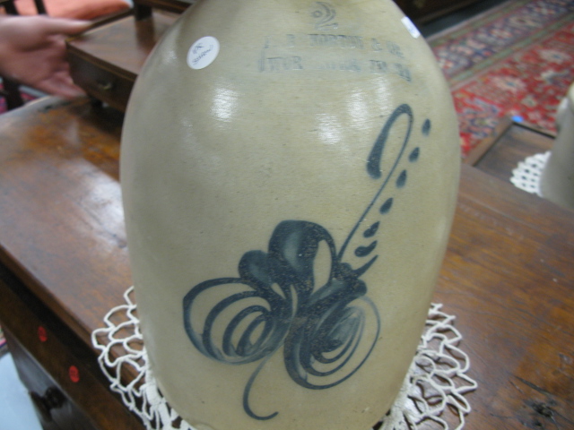 Near pair of two gallon stoneware jugs marked Norton with blue decoration