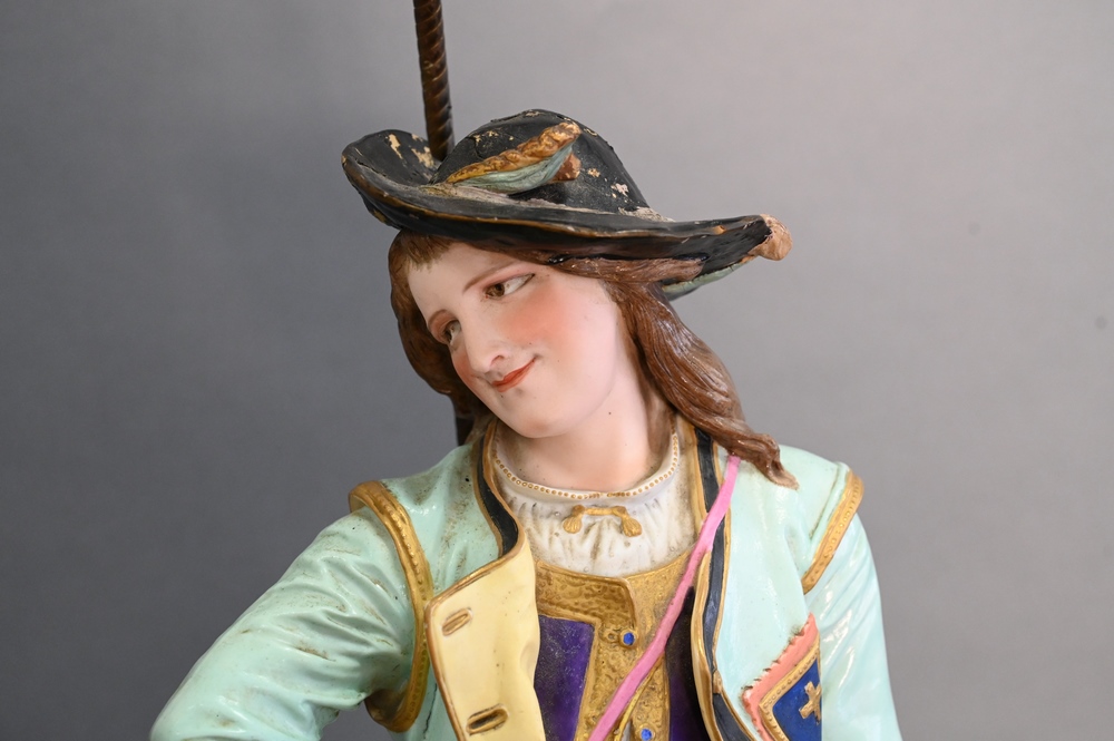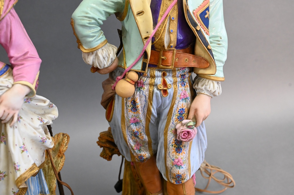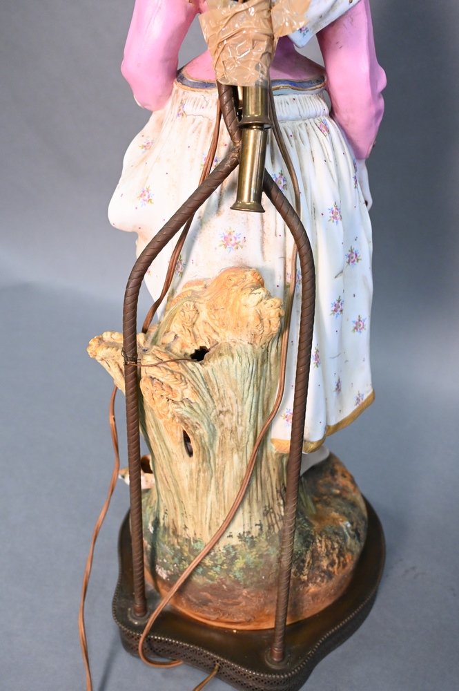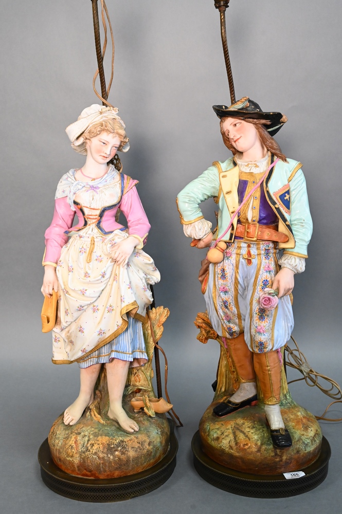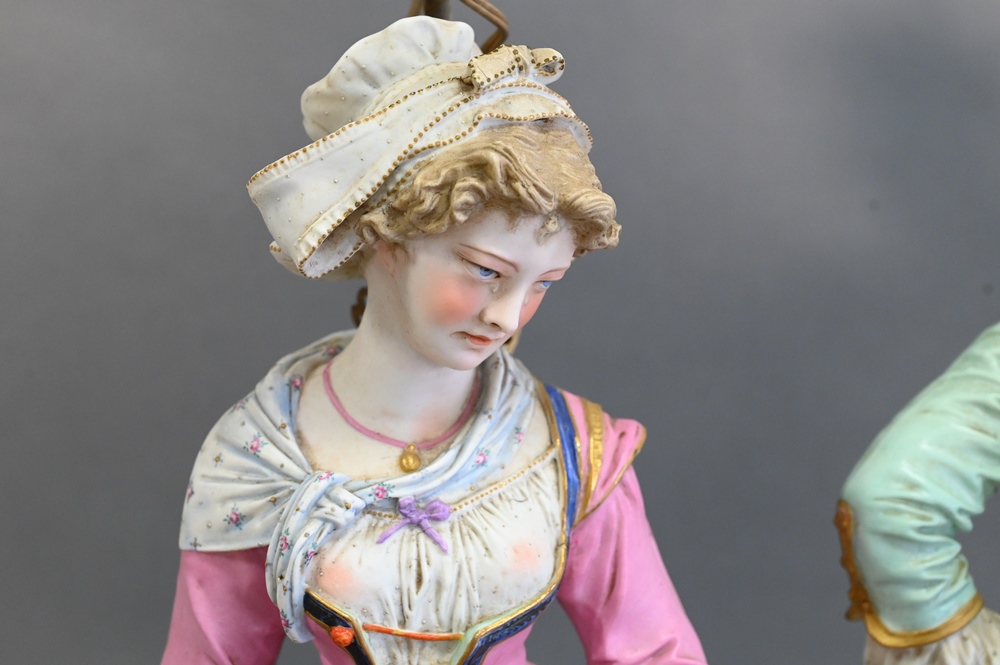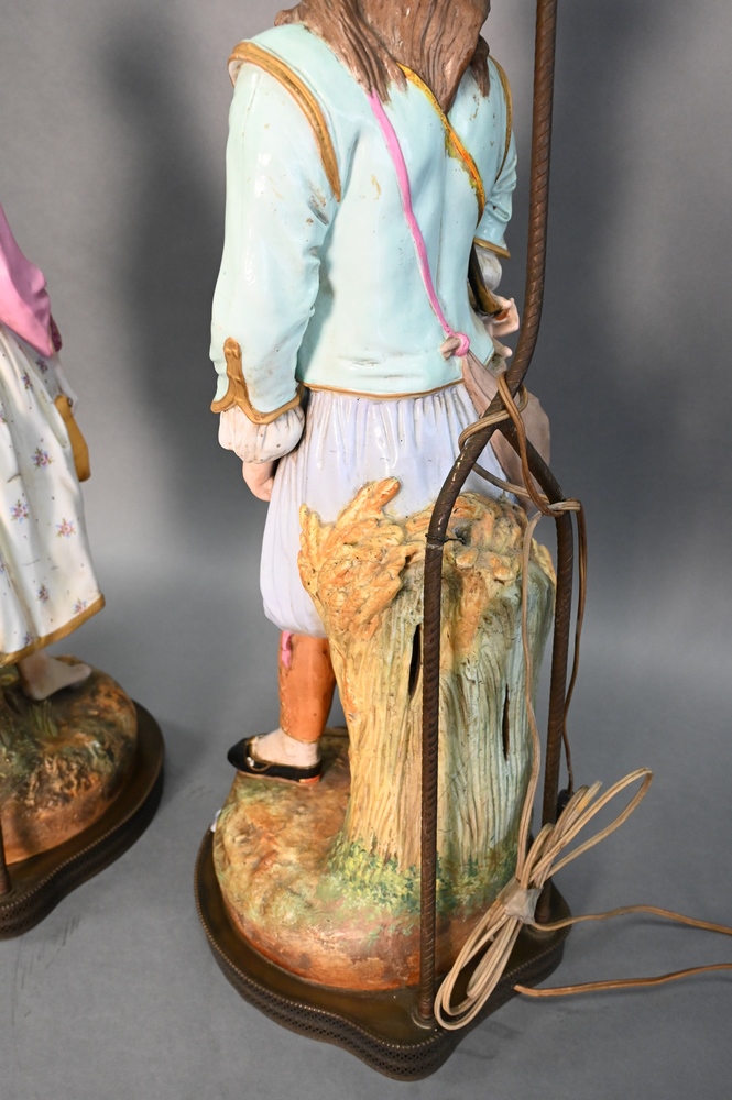 Pair of Bisque Figures Mounted as Lamps, probably French, 19th century, (hat repaired, chip at base, repair at feet), figure height 28 inches, total height 44 inches.