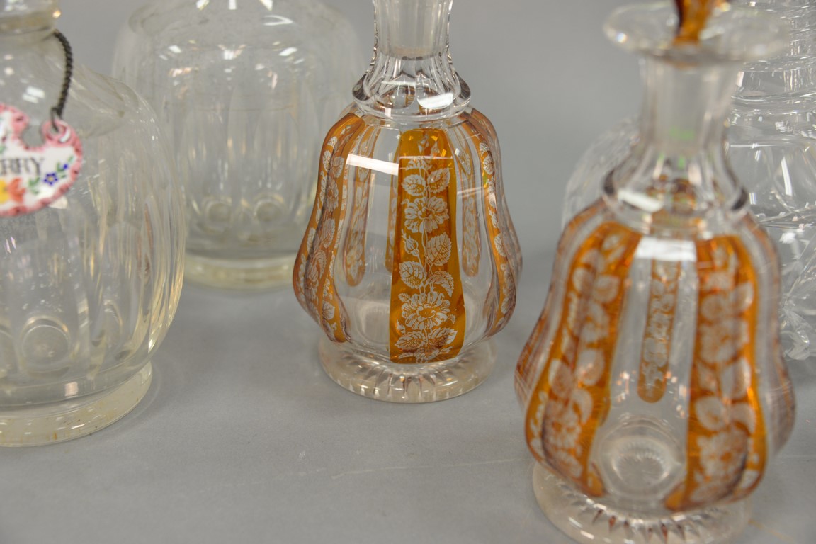 Seven crystal decanters including a set of three with twist glass necks and two pairs of decanters. ht. 7 1/2in. to 11 1/2in.