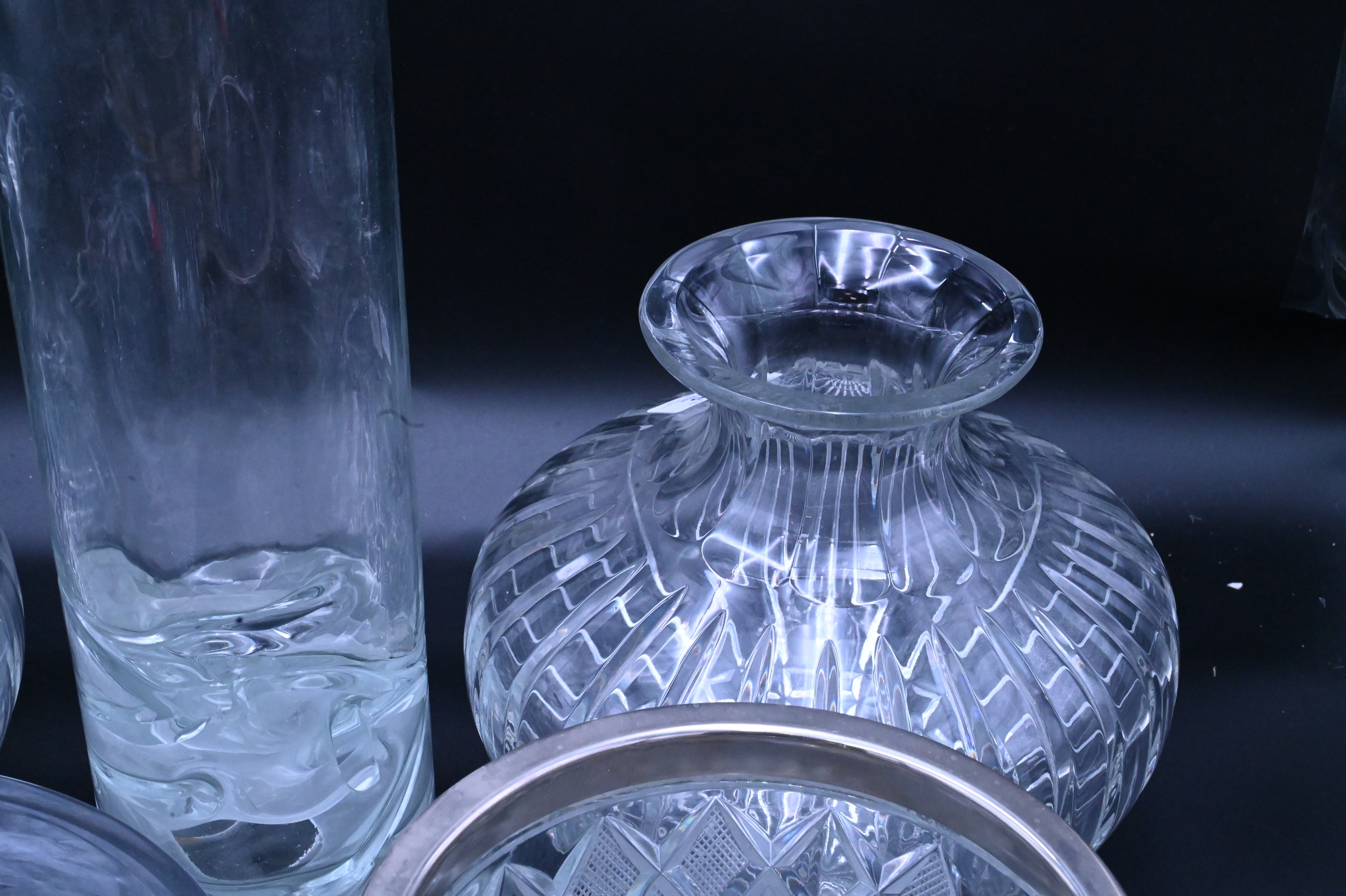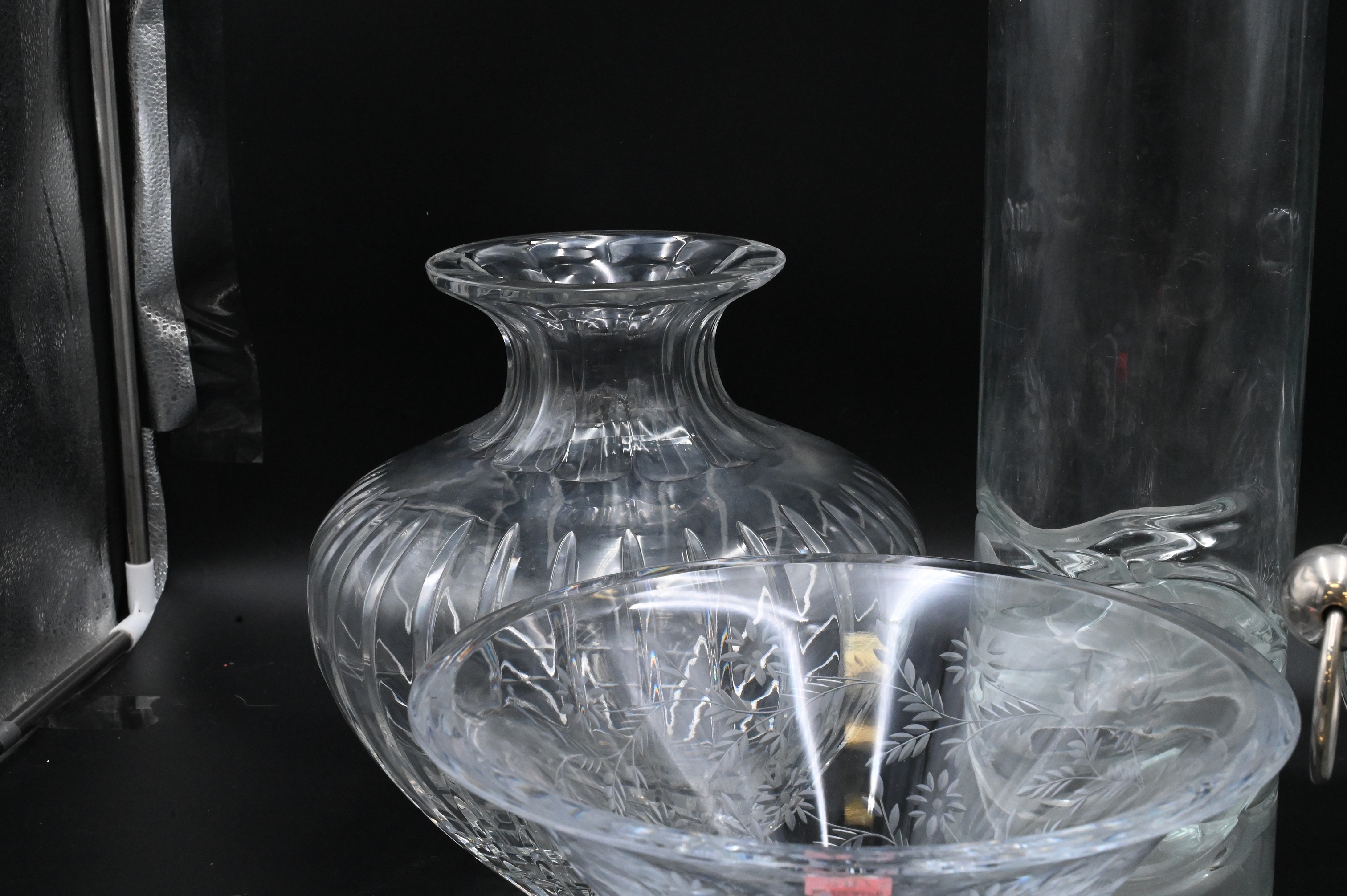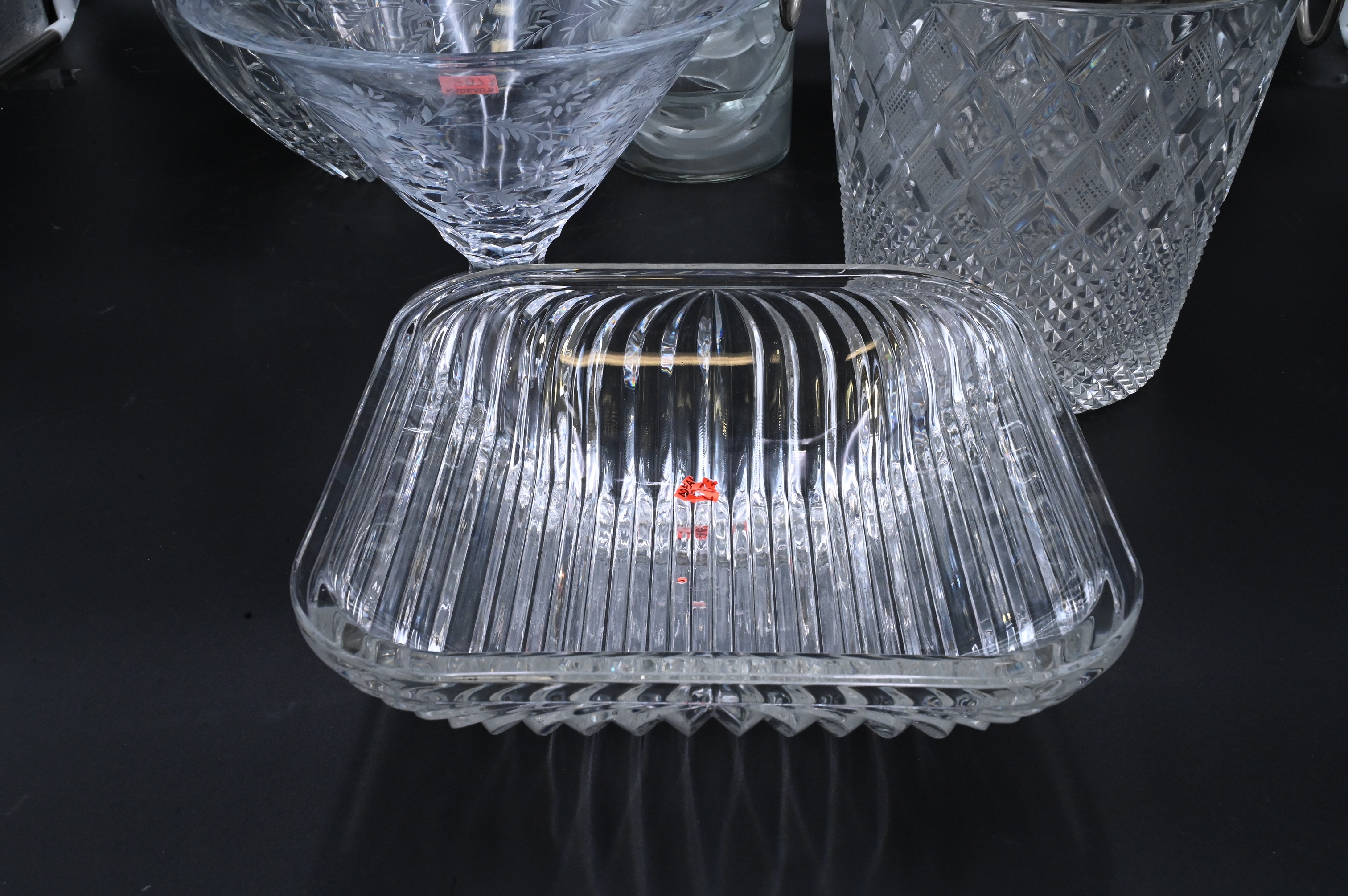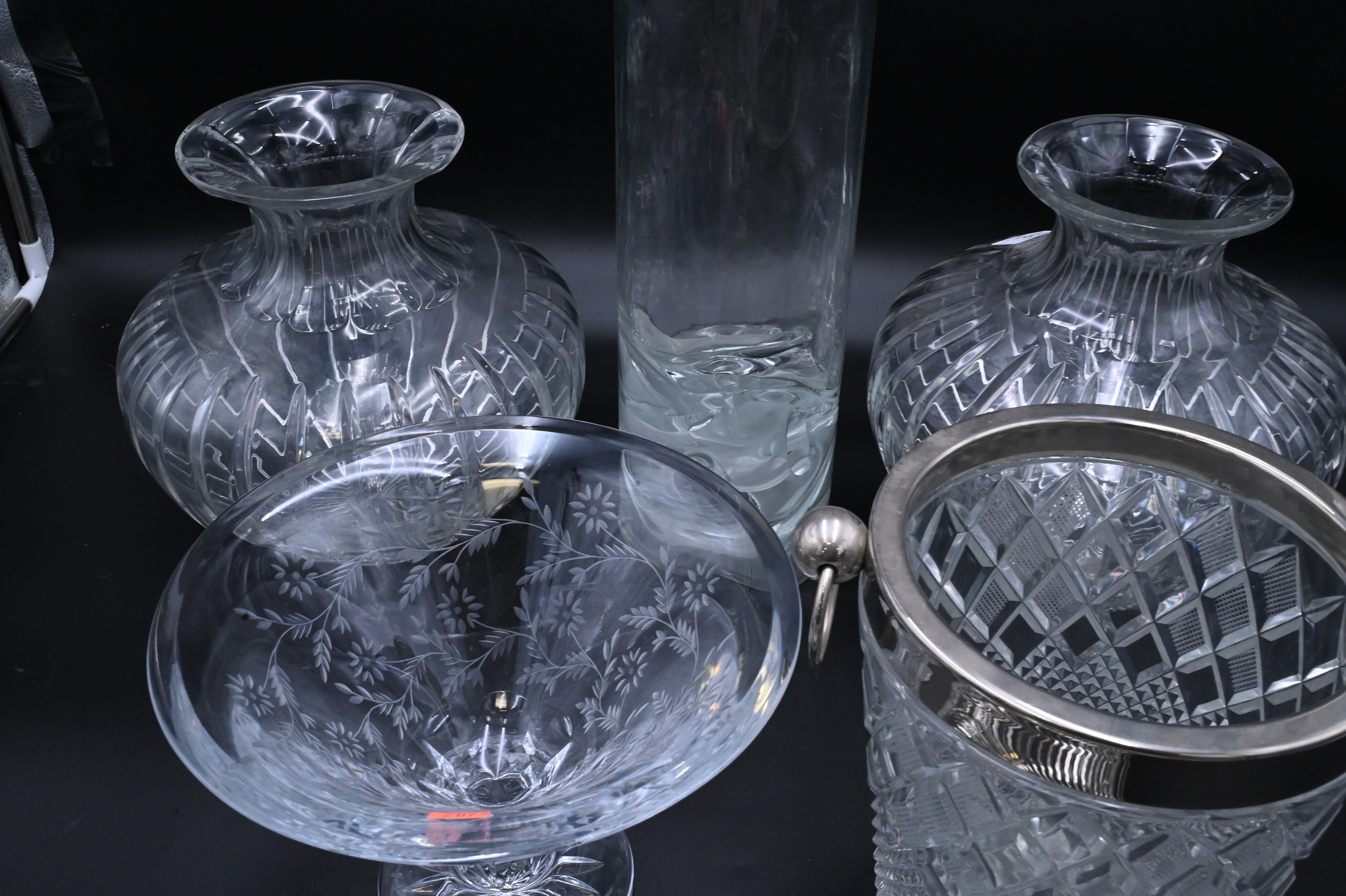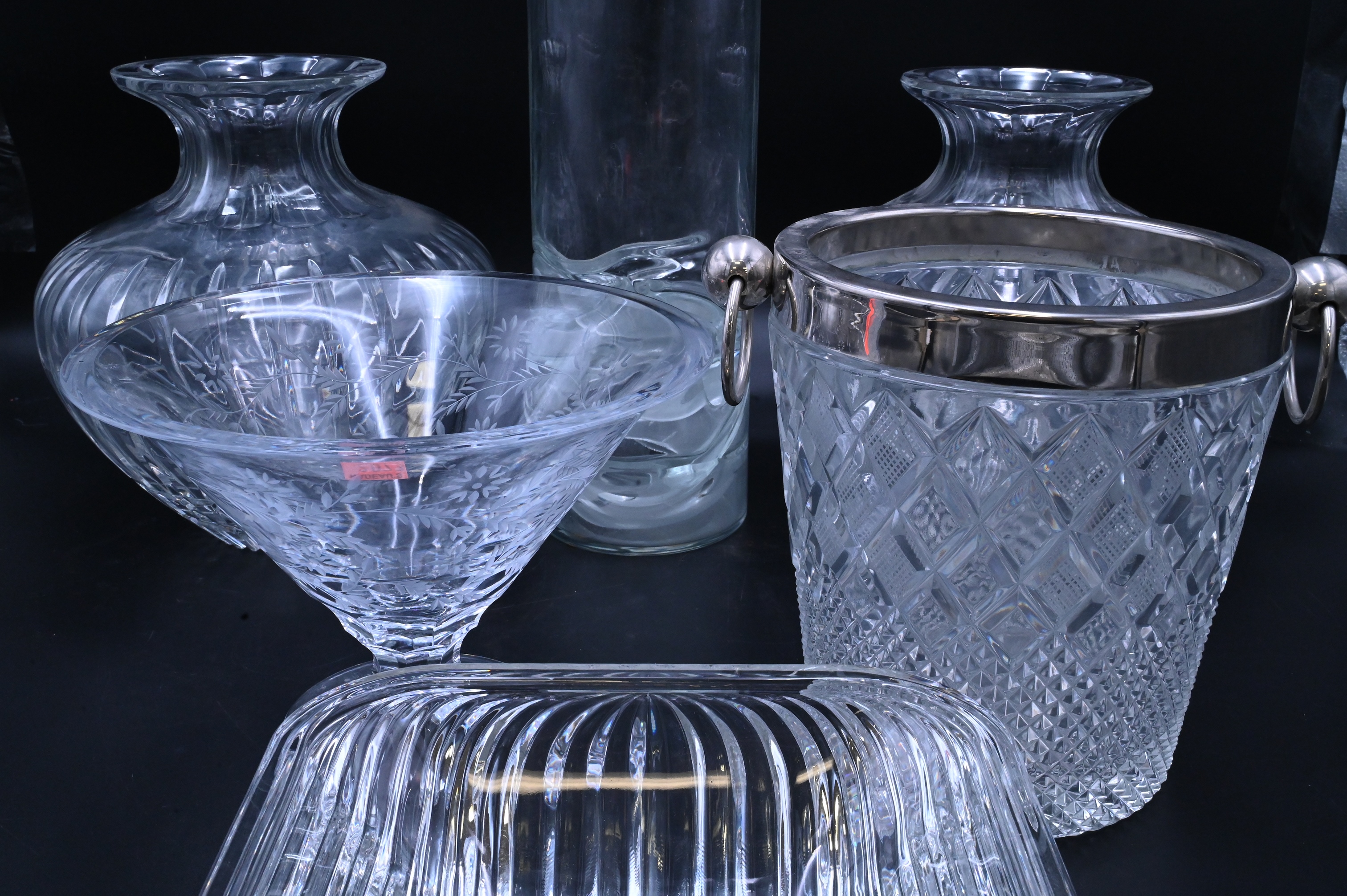 Six Piece Group of Glass, to include a large etched glass Waterford compote, a pair of vases, ice/wine bucket, a tall art glass vase, along with a square center dish, tallest 15 inches. Provenance: Estate of Dr. Vallo Benjamin E 57th St New York