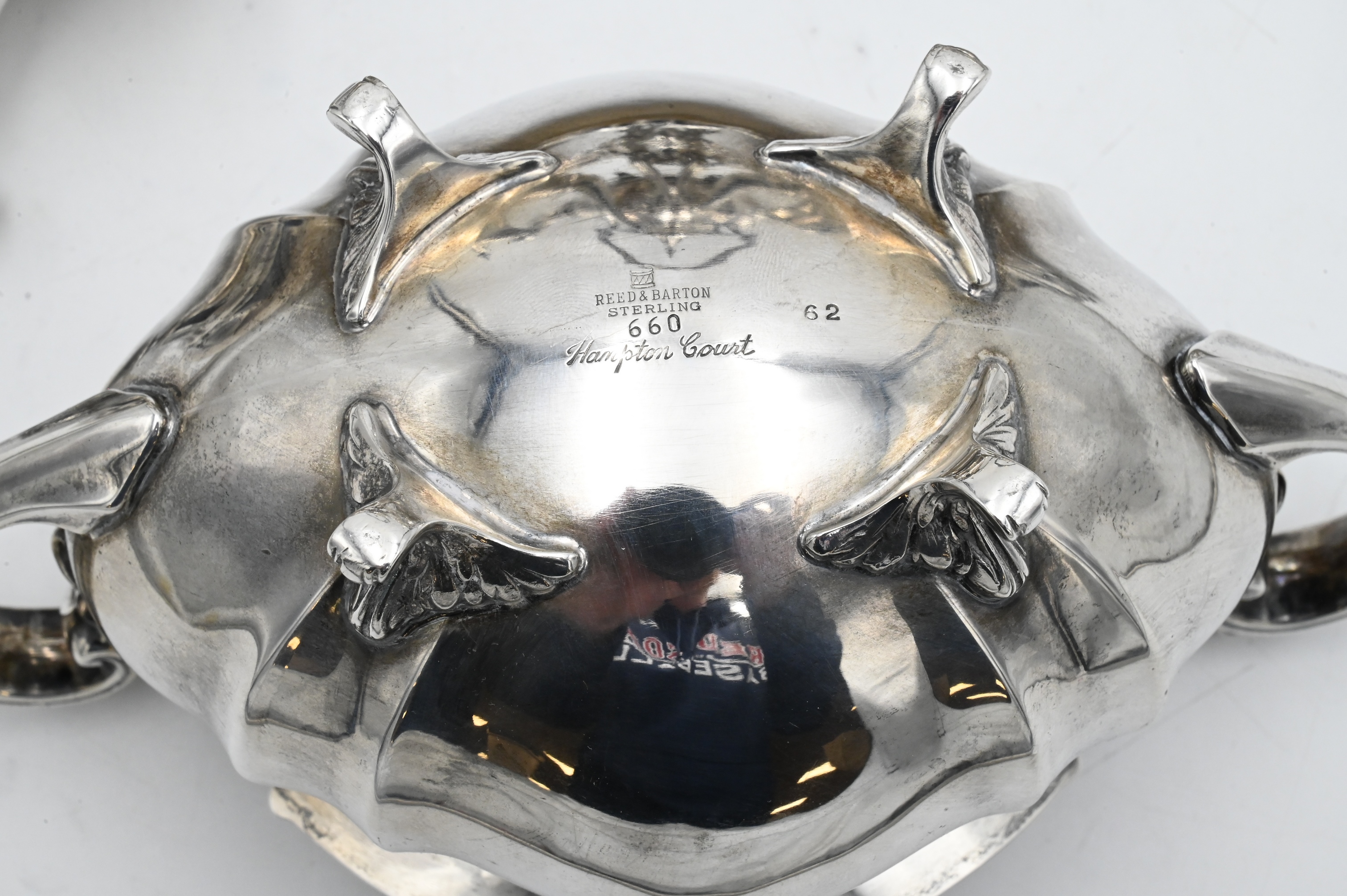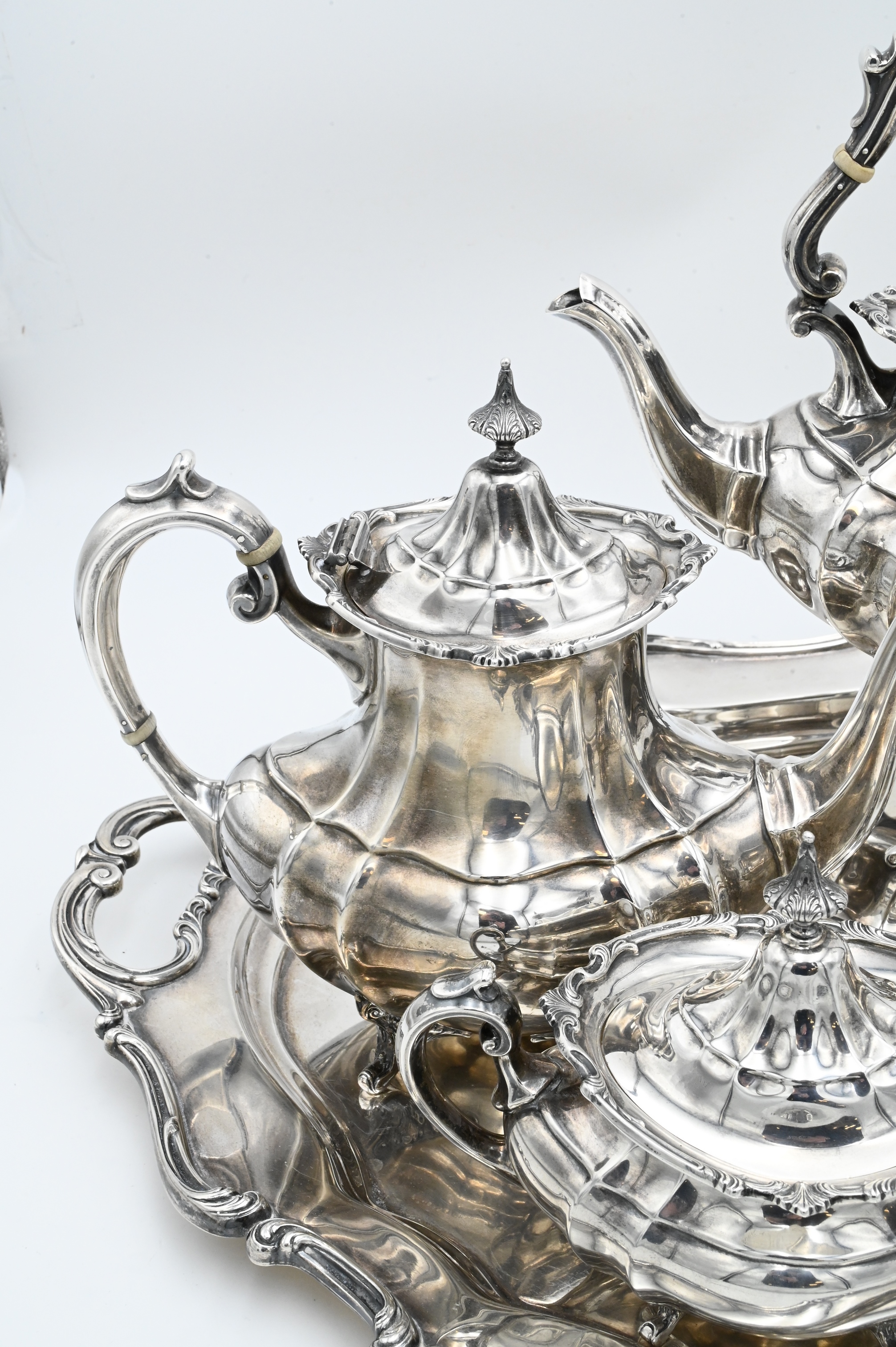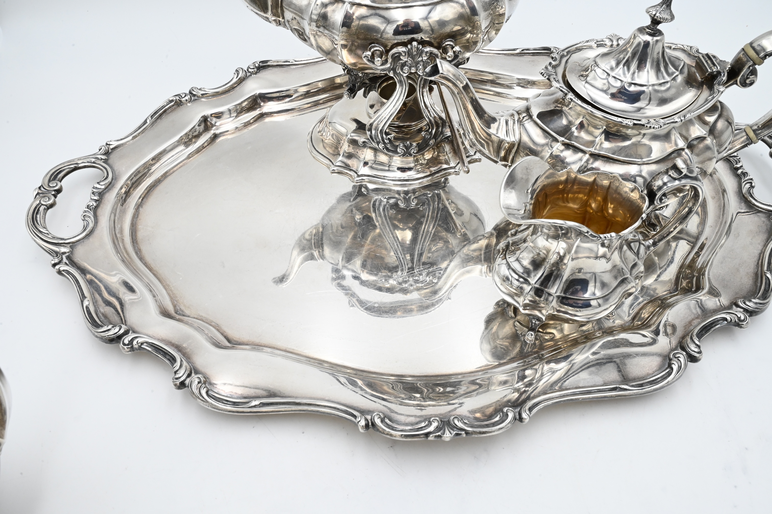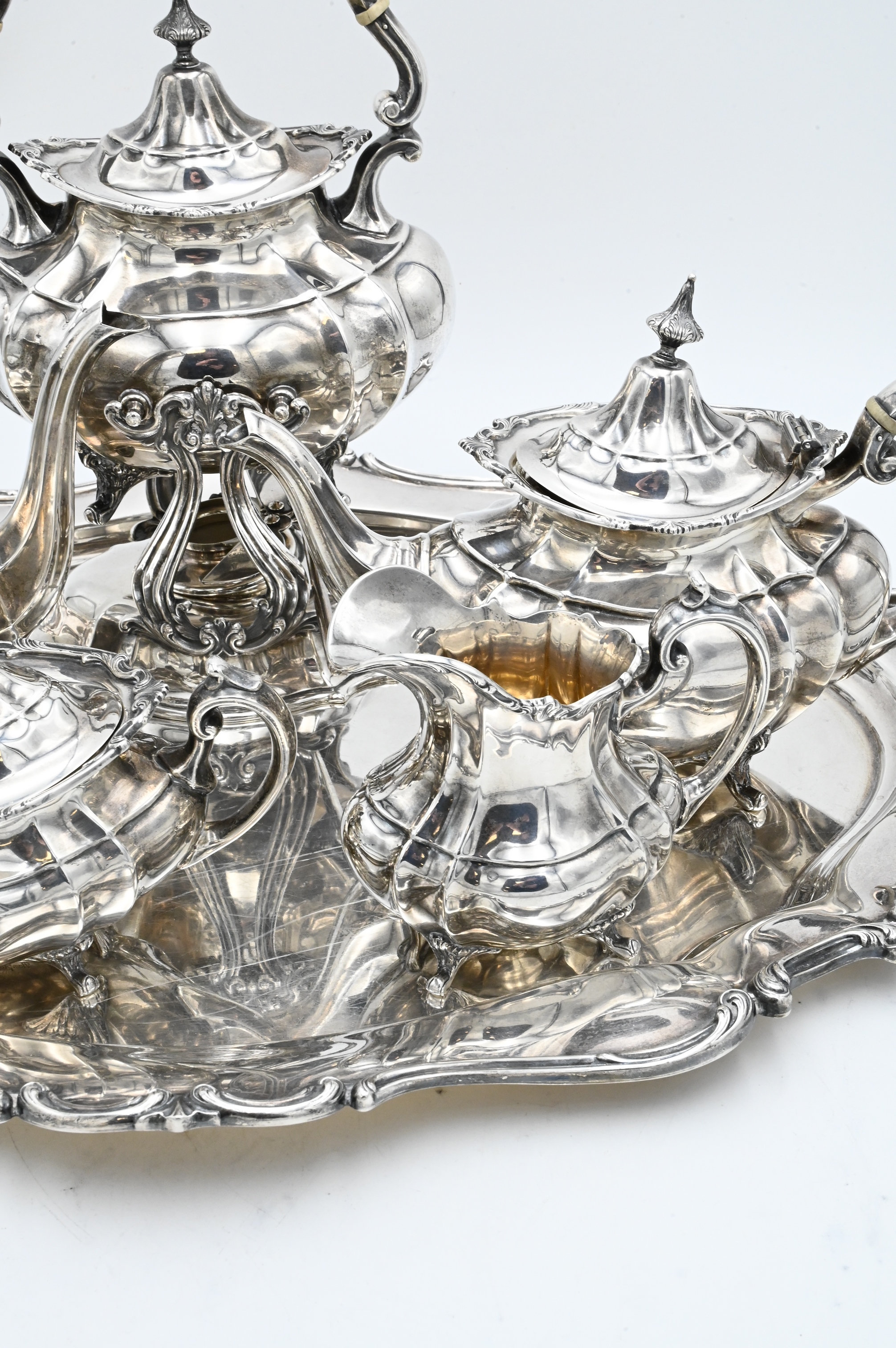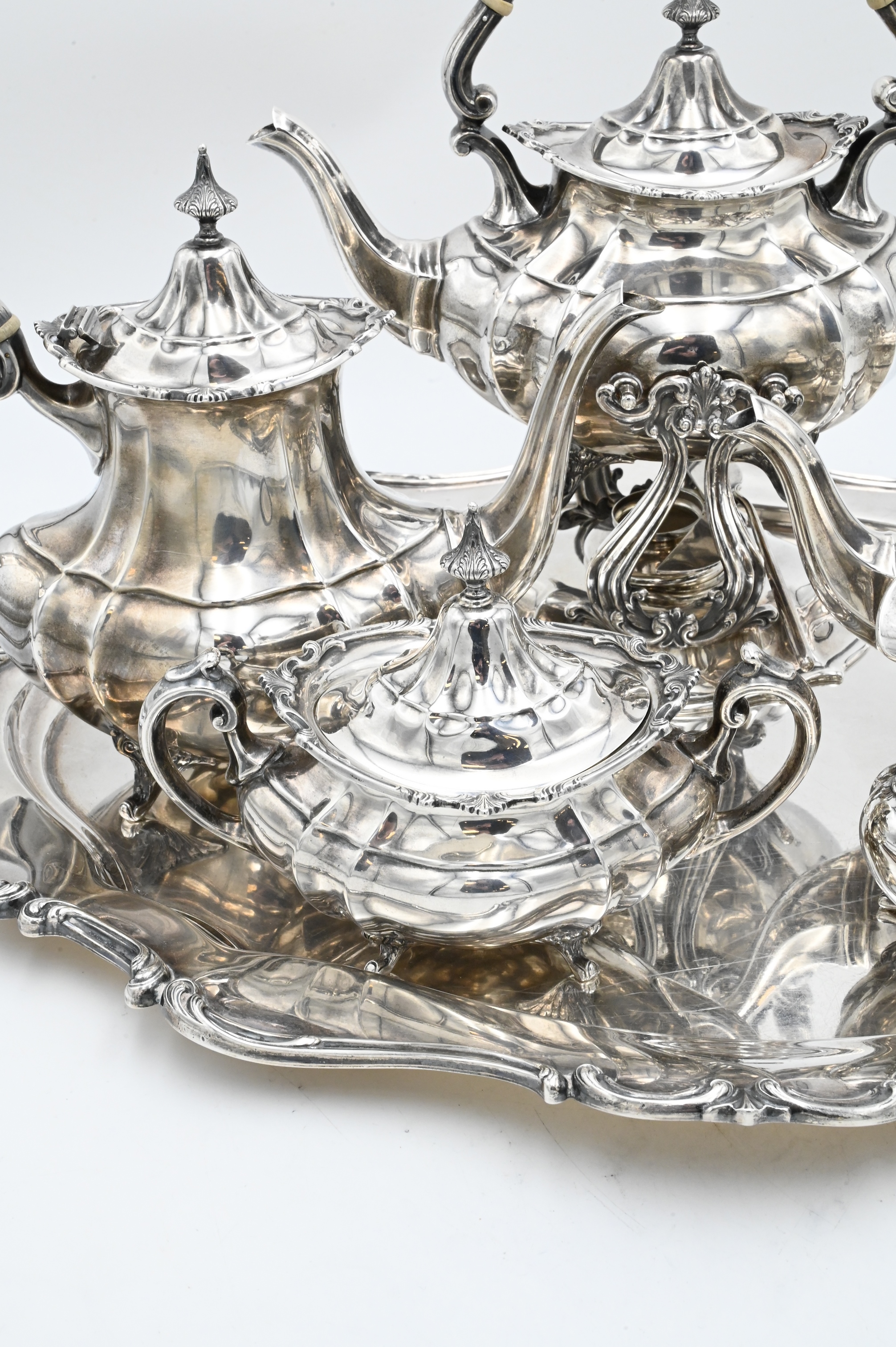 consisting of tilting pot, coffee pot, teapot, sugar, creamer and large tray with handles, “Hampton Court” pattern, marked Reed and Barton 661 and 660