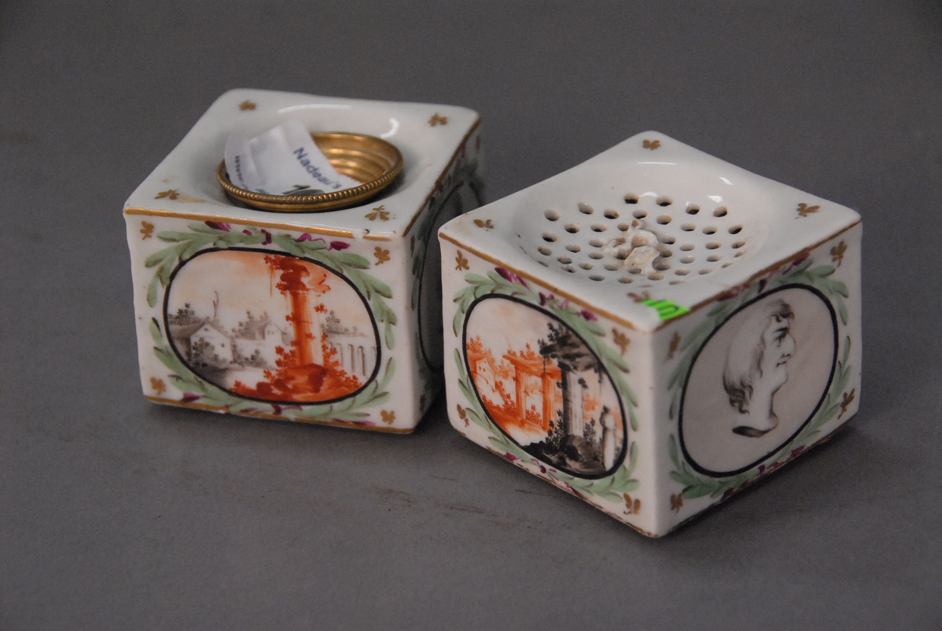 Lot 165: Square porcelain inkwell and sander having oval painted panels of landscapes and busts of men, ht. 2in.