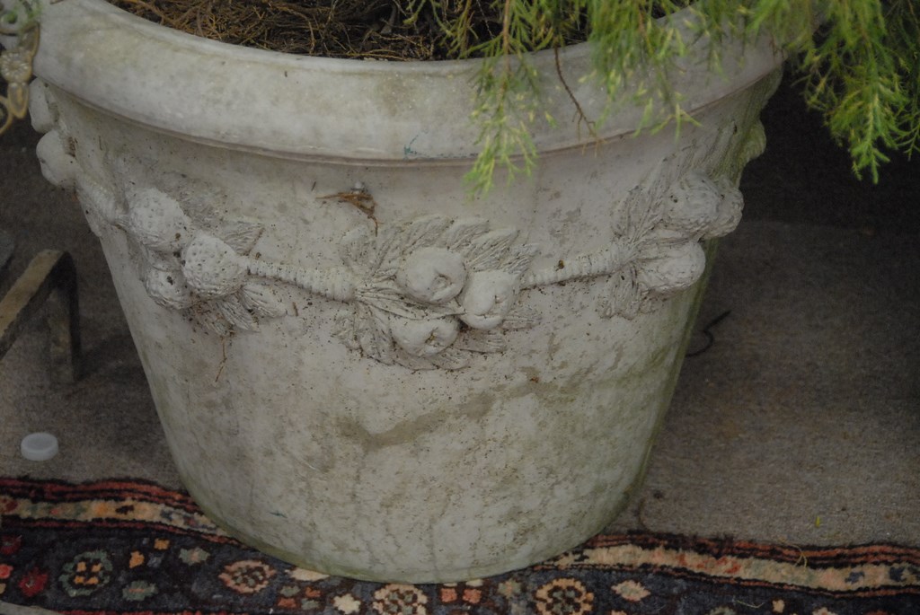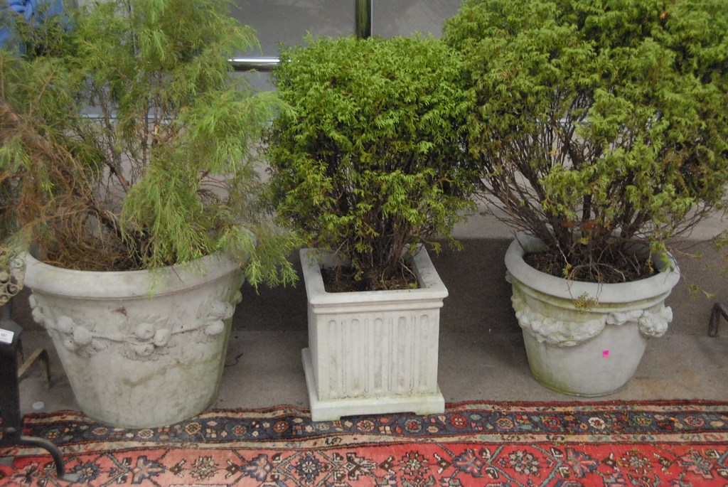 Three cement outdoor urns, ht. 14in., 16in. & 18in.