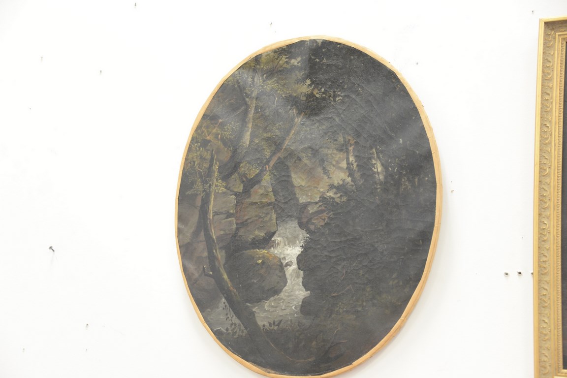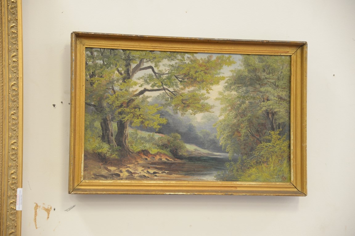 Three oil on canvas paintings including still life of flowers with crock and brass pail on table signed lower left M. Besunder, a small landscape with stream, and an oval landscape with stream. smallest: 9 1/2 x 16, largest: 20 x 27 1/2