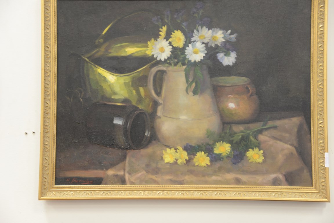 Lot 165: Three oil on canvas paintings including still life of flowers with crock and brass pail on table signed lower left M. Besunder, a sm…
