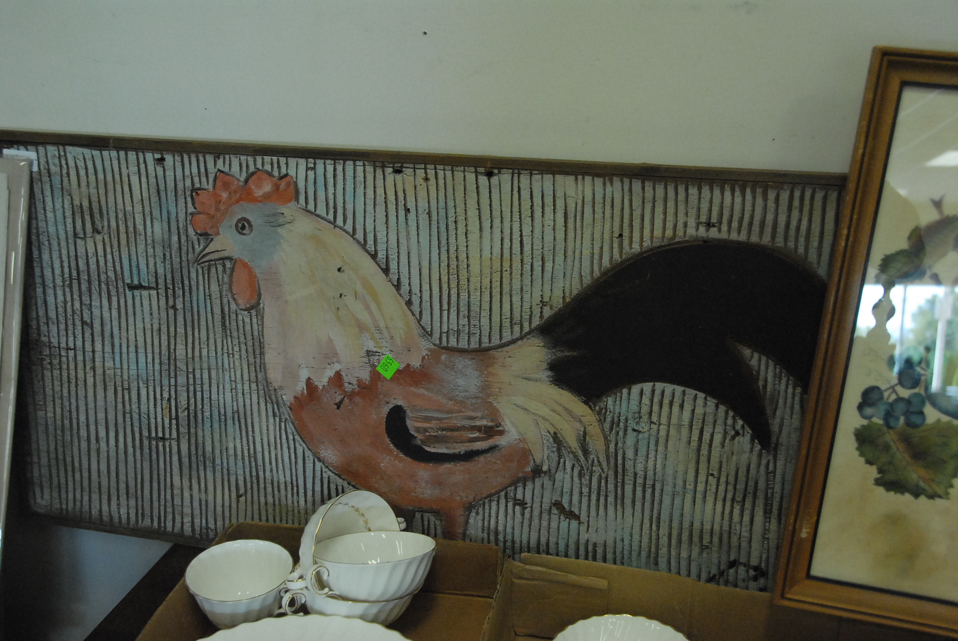 Three Ralph Eno carvings and paintings one of rooster and one of shore board, 16 1/2 x 37.
