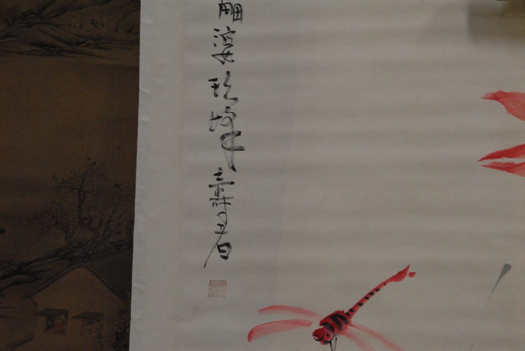 Two Oriental scrolls, both watercolors on paper one having blossoming tree with birds along stream 52 x 25 and blossoming flower with dragonfly 67 x 36.