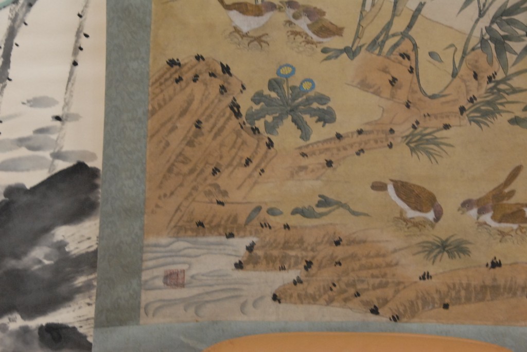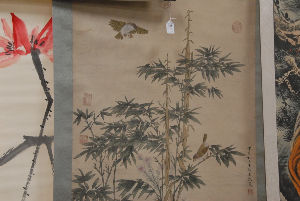 Lot 165: Two Oriental scrolls, both watercolors on paper one having blossoming tree with birds along stream 52 x 25 and blossoming flower …