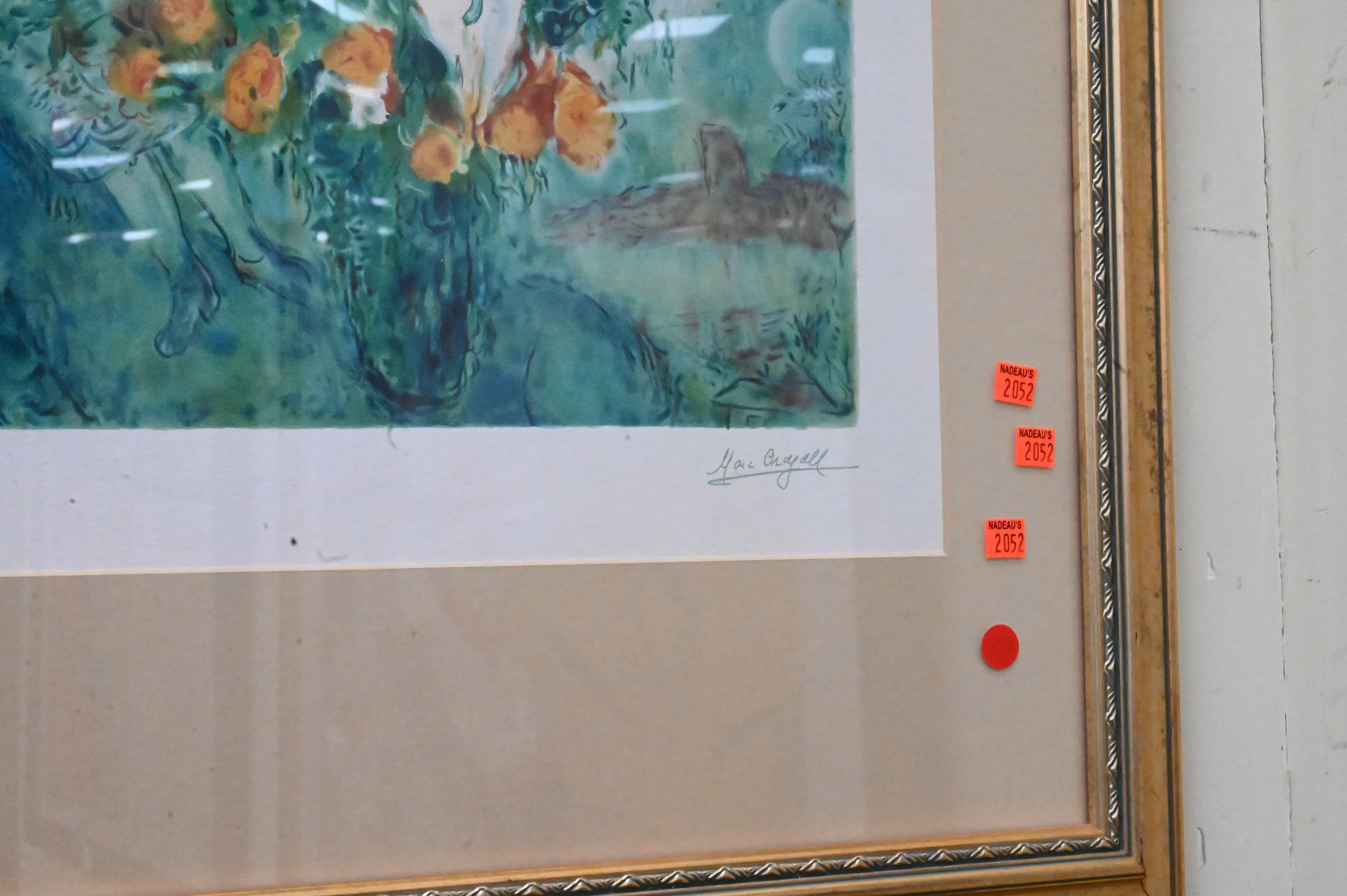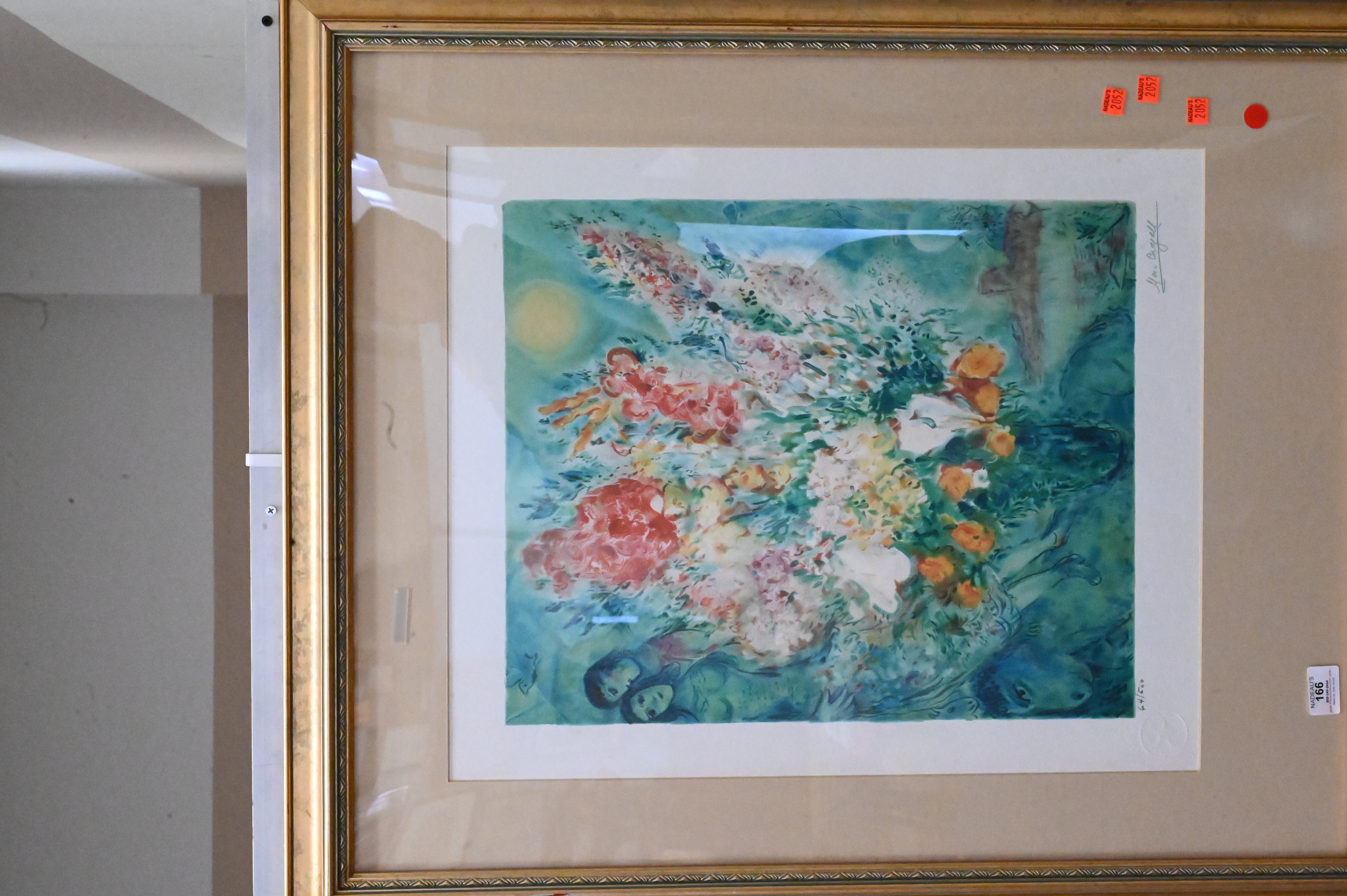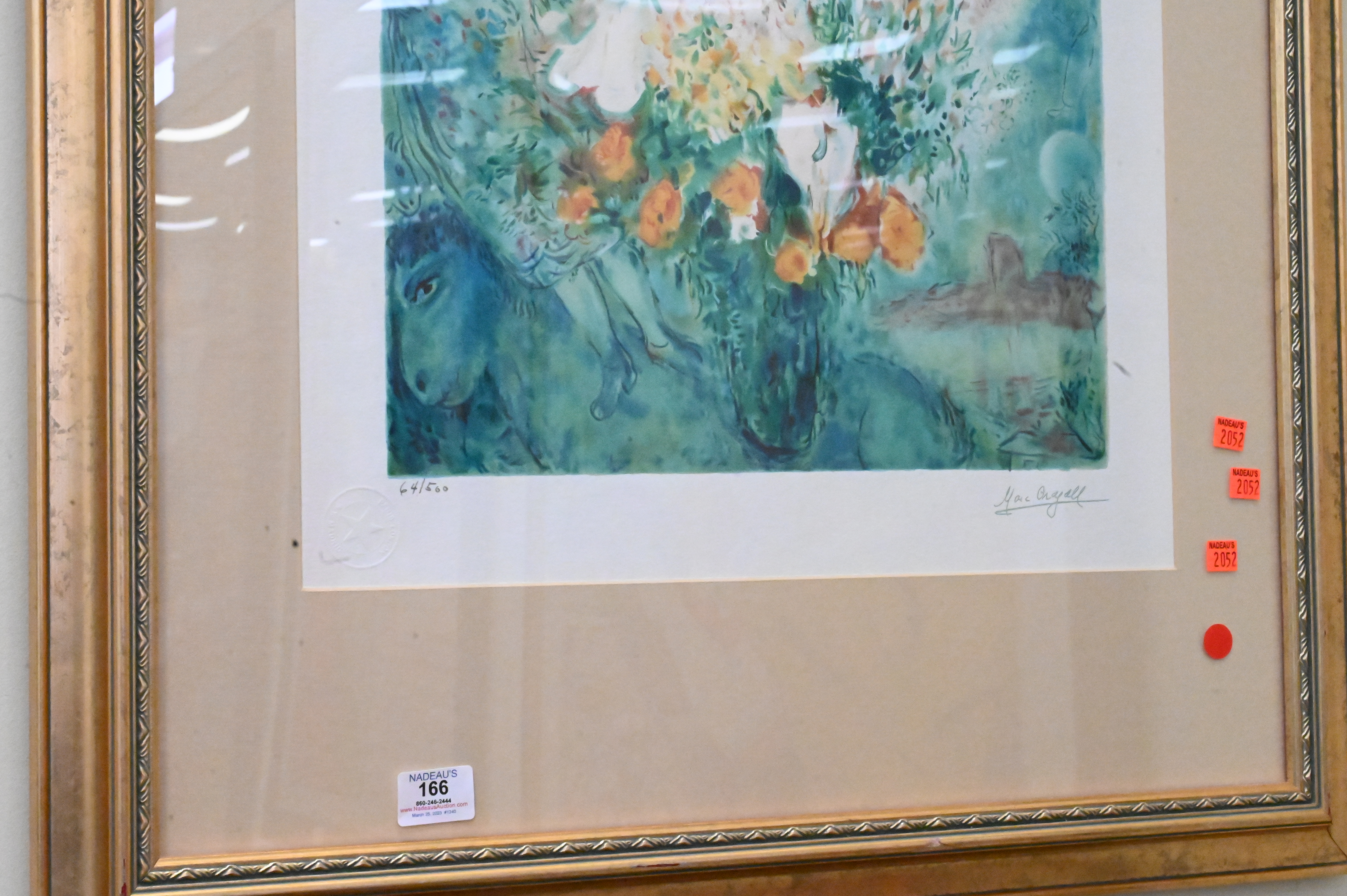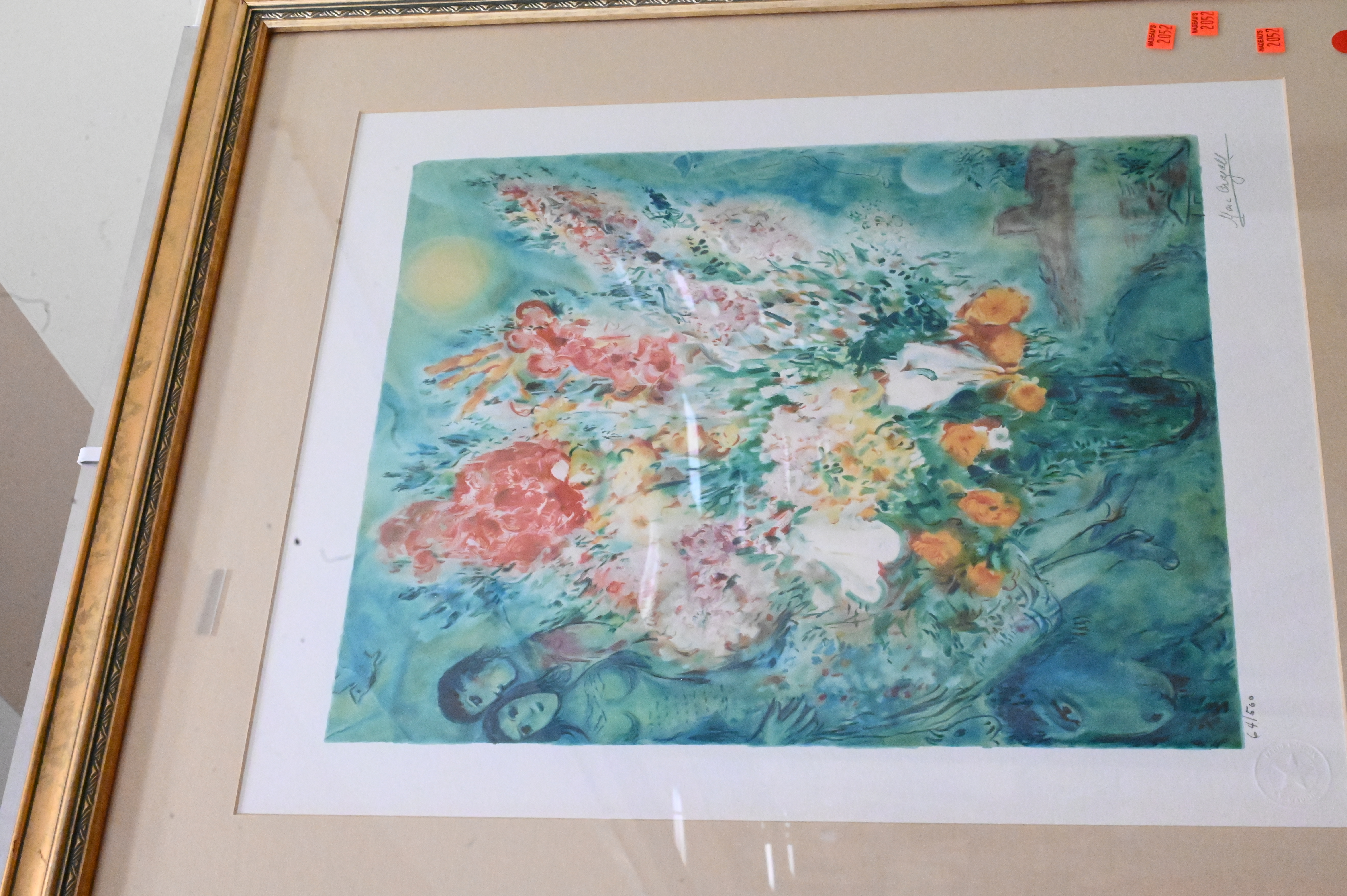 After Marc Chagall (1887 – 1985), “Blue Bouquet”, giclee on paper, editioned 64/500 in pencil with unidentifiable blind stamp in the lower margin, image size 19″ x 15 3/4″.