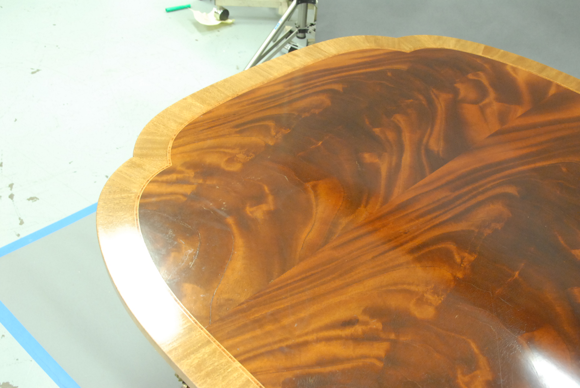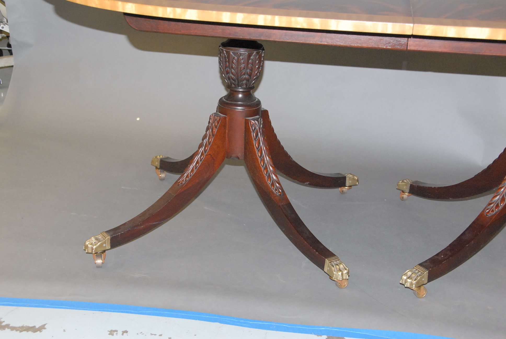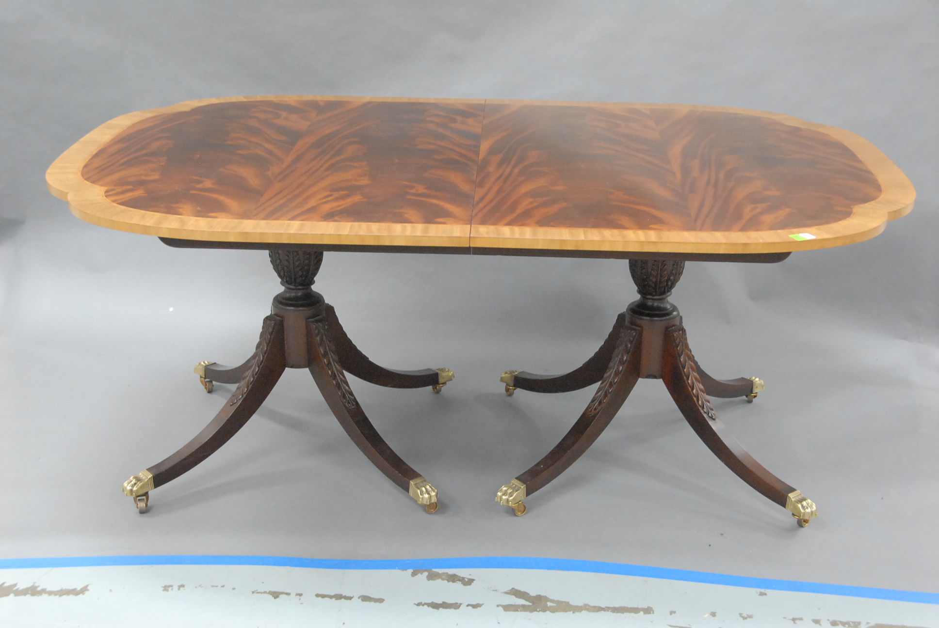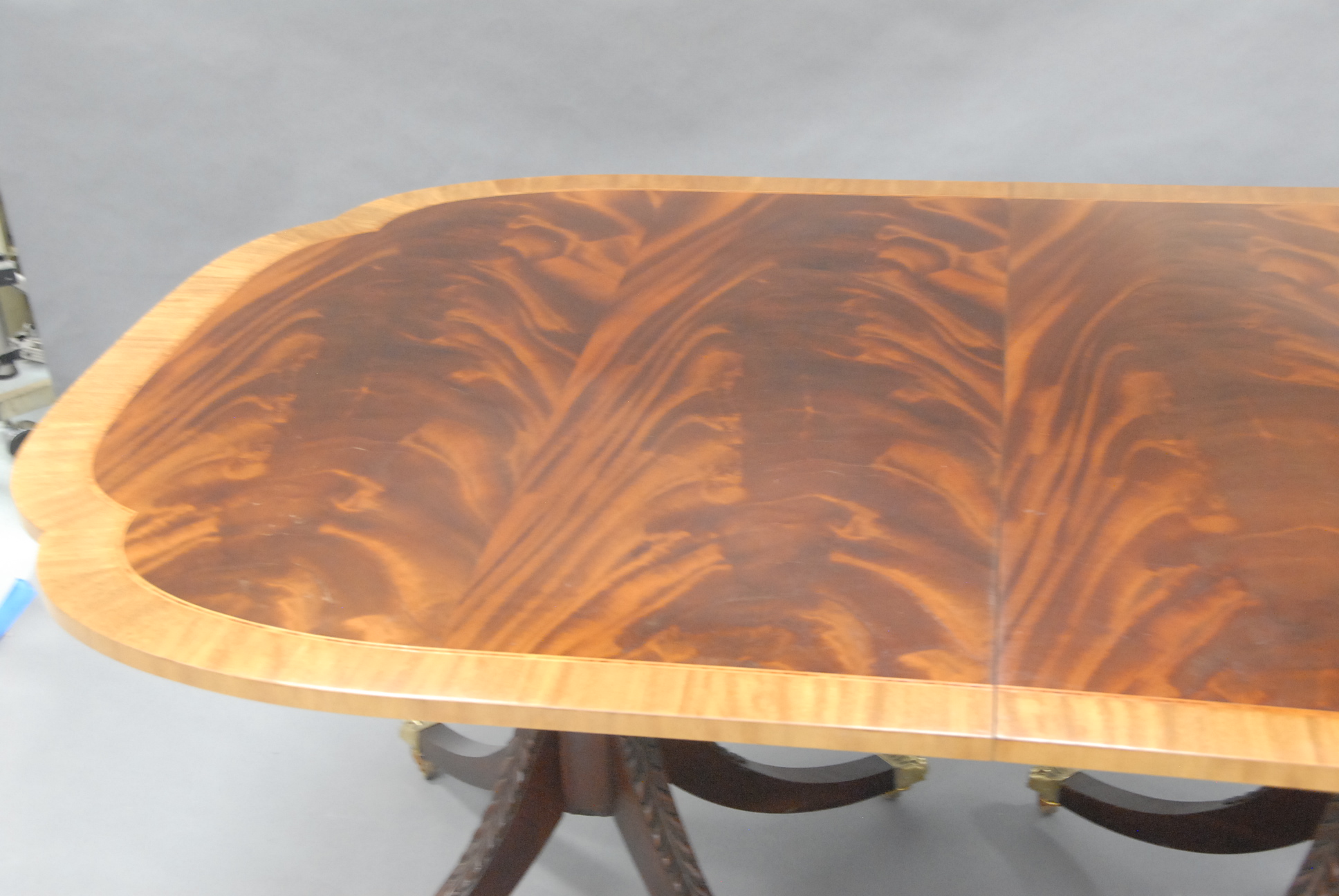 Baker Furniture shaped double pedestal dining table with banded inlaid top and edge, three skirted leaves and custom pads, with label that reads Baker Furniture Historic Charleston Reproductions.