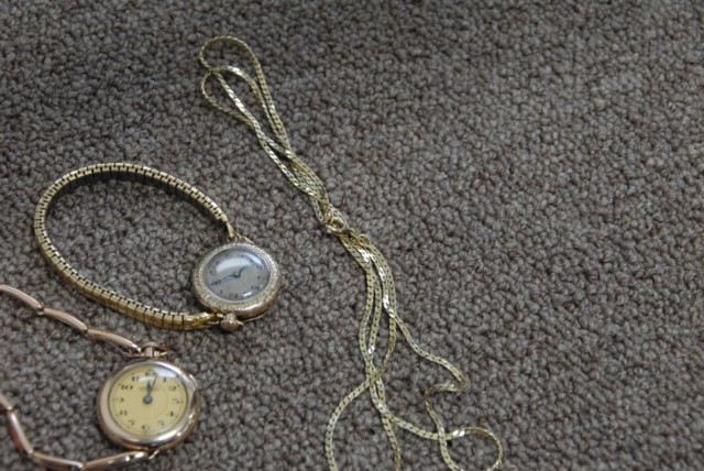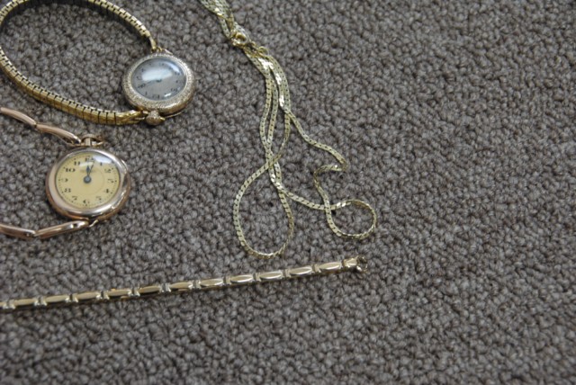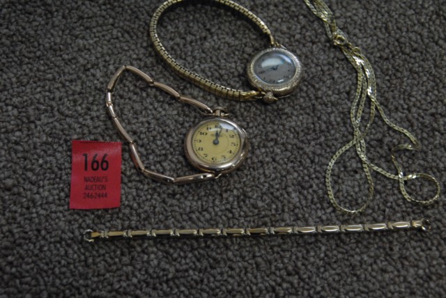 Box lot containing gold plated ladies wristwatches and gold plated chain.