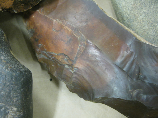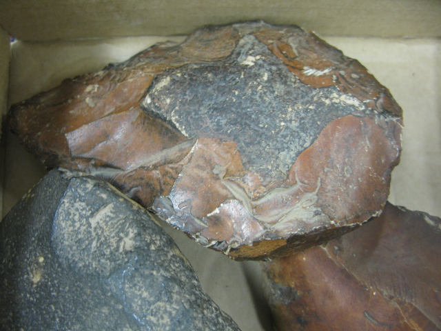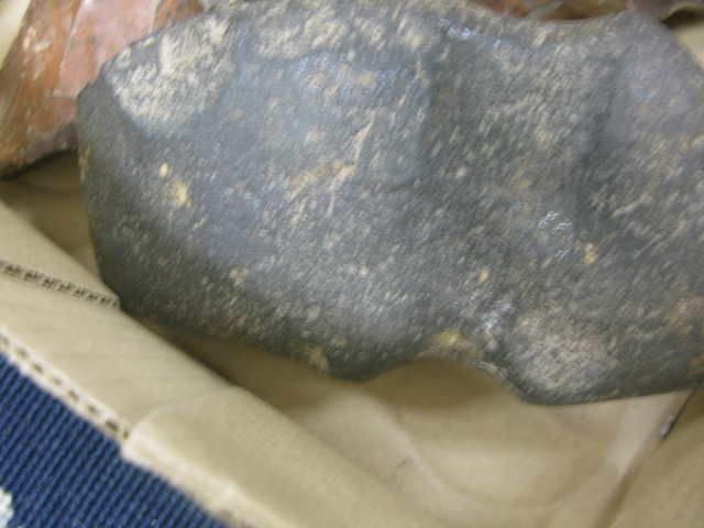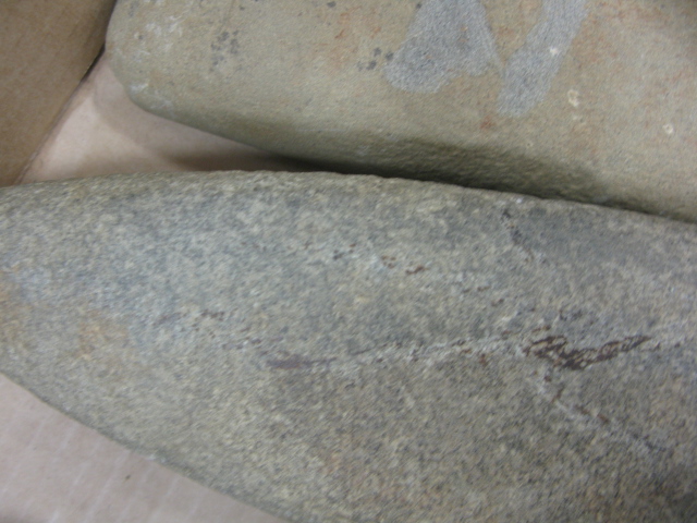 Box lot of Indian tools including tomahawk, spearhead and cutting tools, five pieces