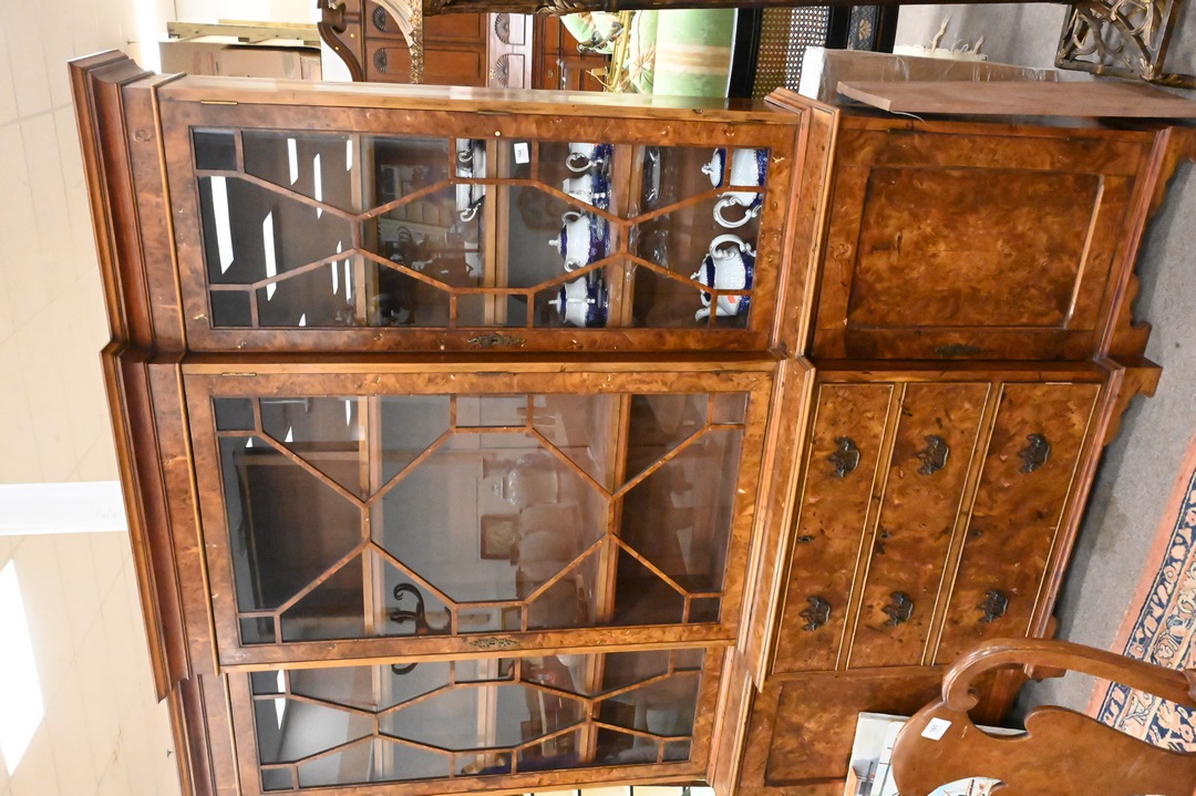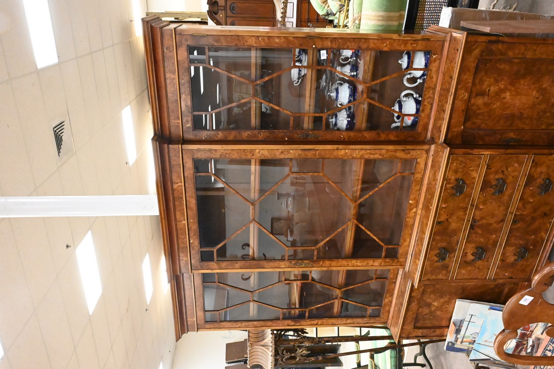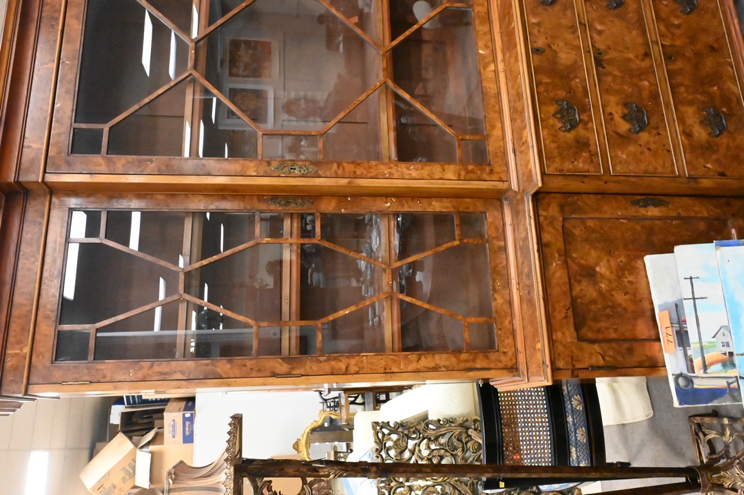 Burlwood Georgian Style Breakfront, in two parts, height 88 inches, width 75 inches, depth 14 inches.