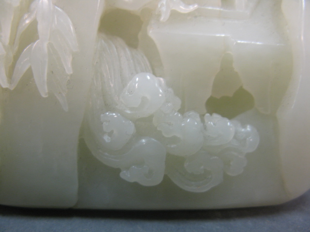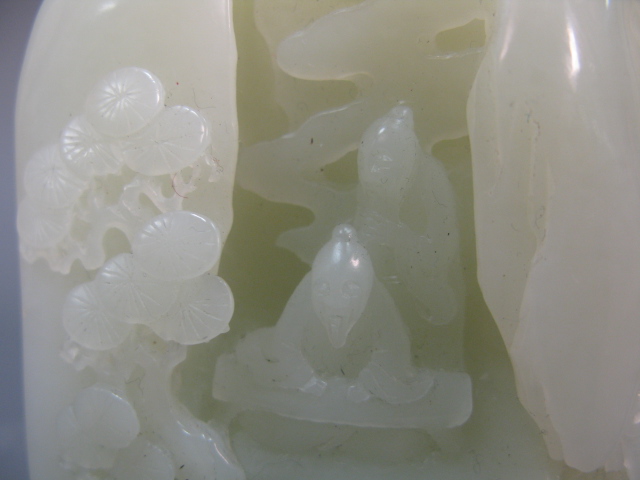 Celadon jade boulder carved in the form of a landscape with a house and trees.