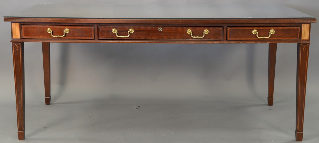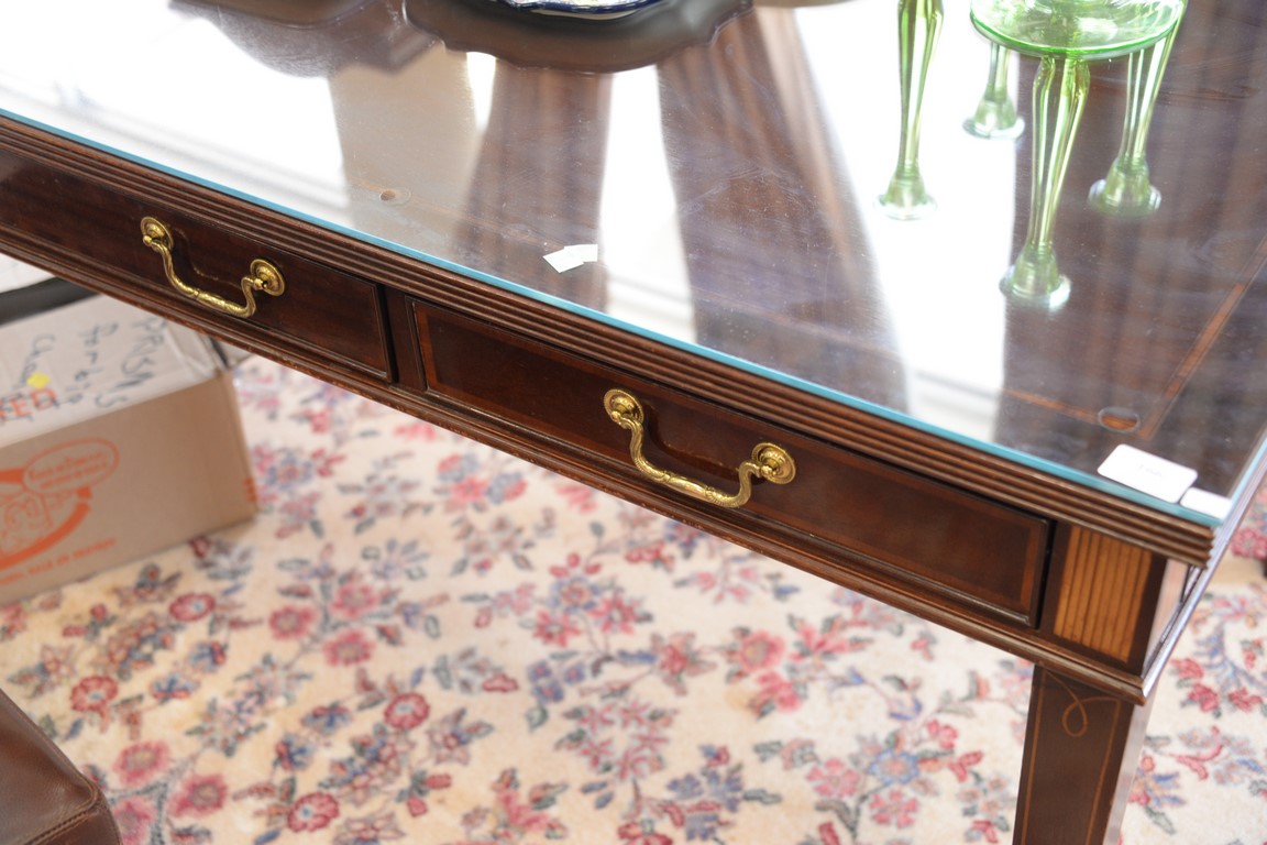 Councill mahogany inlaid computer/writing desk with glass top. ht. 30 1/2in., top: 36 x 72