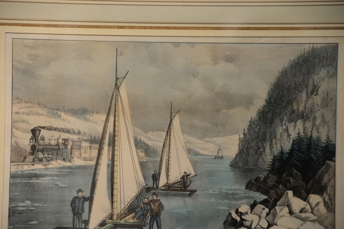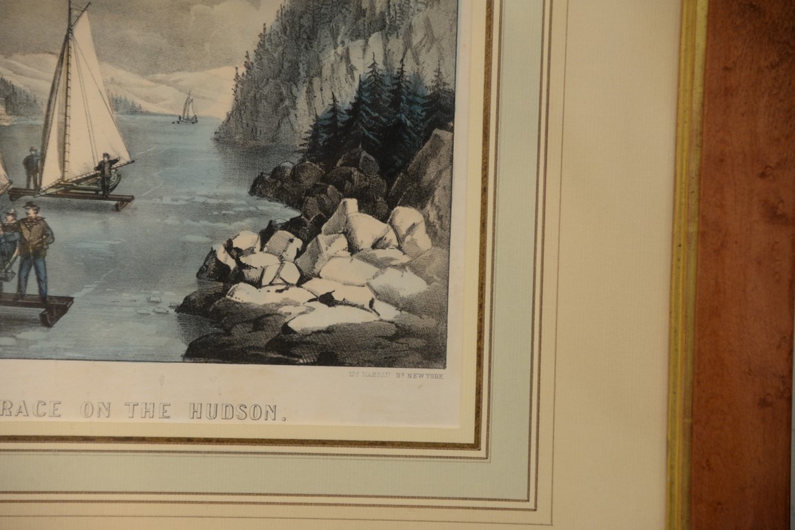 Lot 166: Currier & Ives, small folio hand colored lithograph, ICE BOAT RACE ON THE HUDSON, sight size 9 3/4 x 13 3/4 Provenance: Property f…