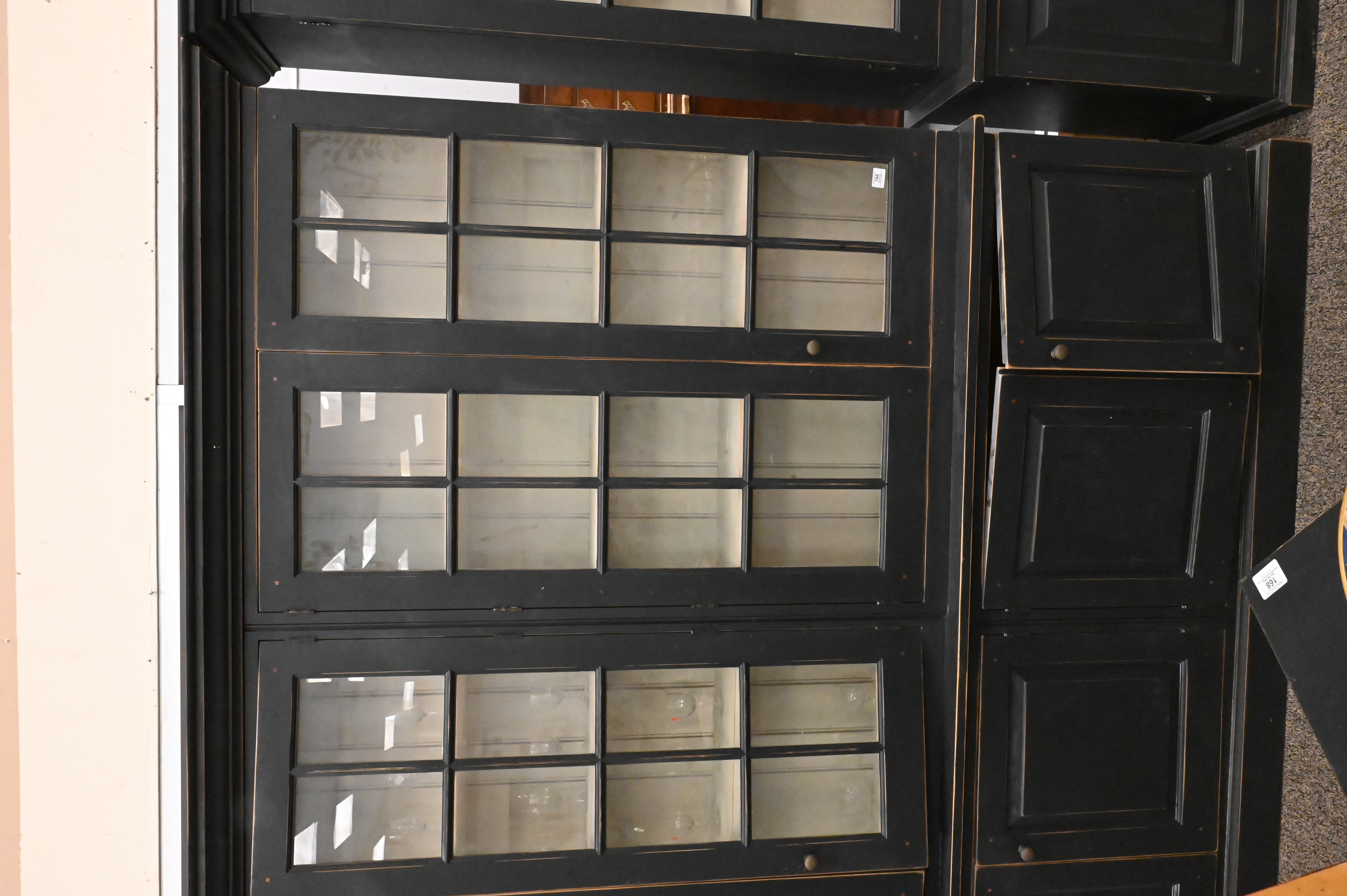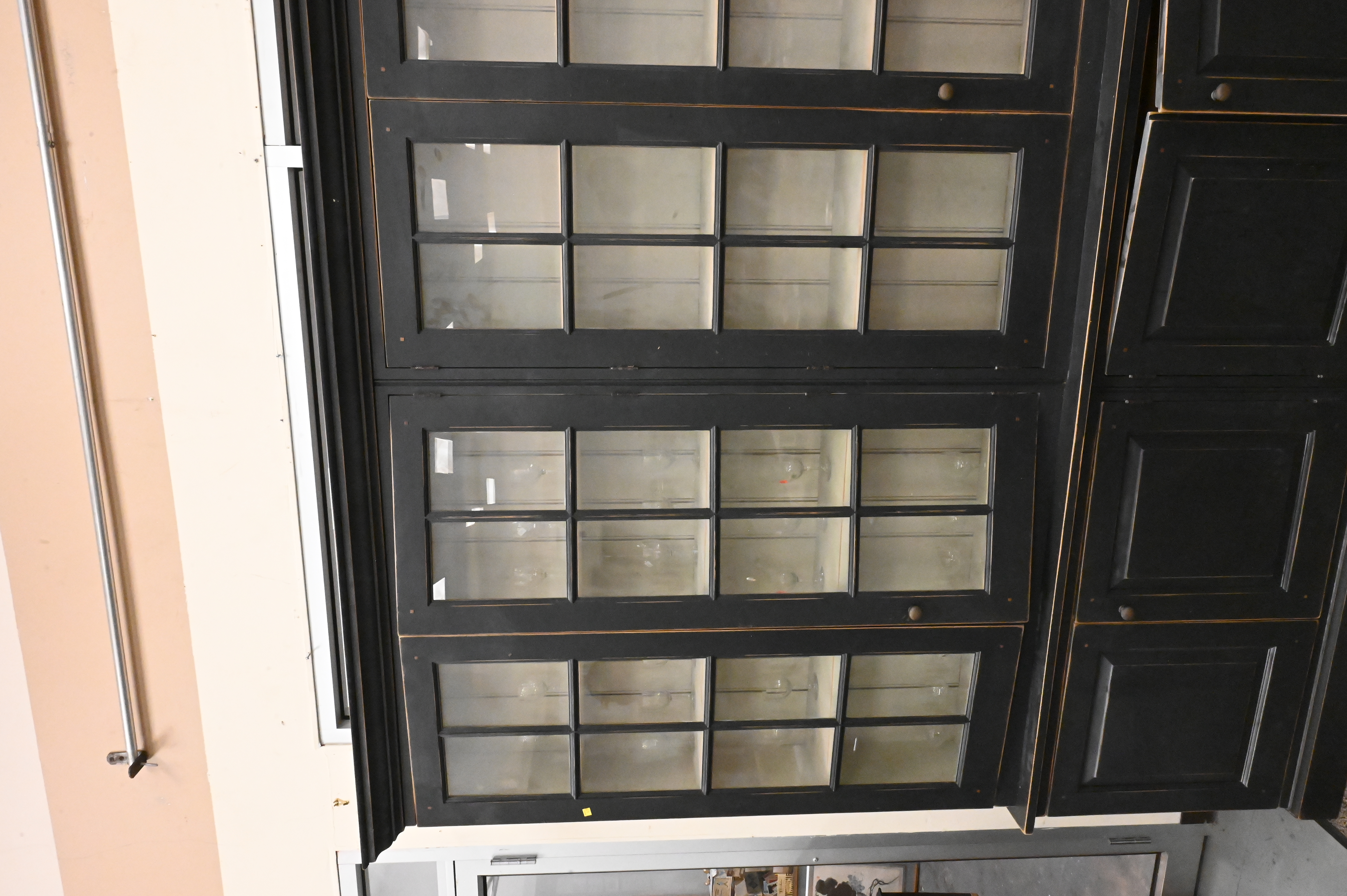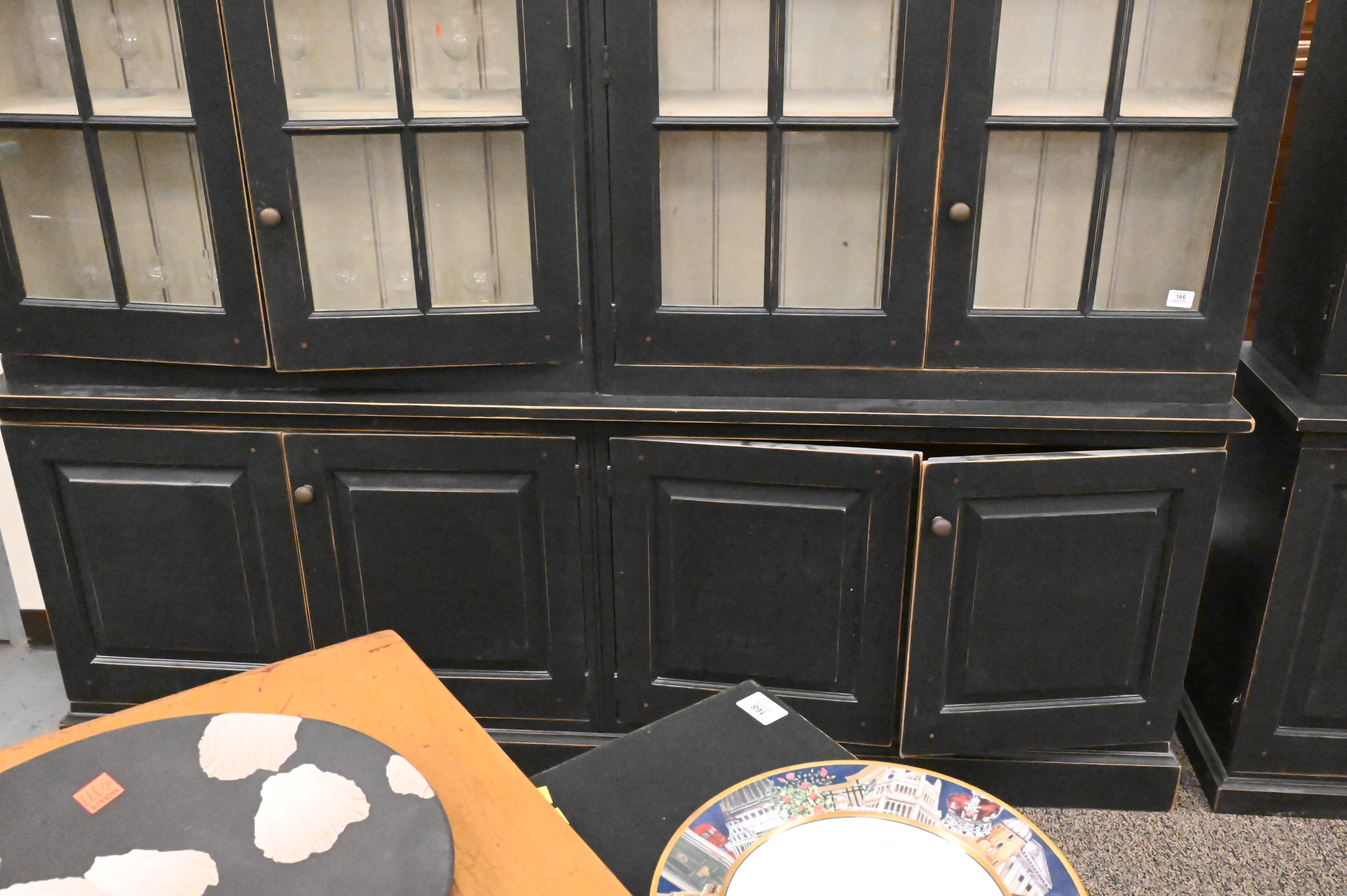 painted black, having four shelves behind double glazed glass over double panel doors