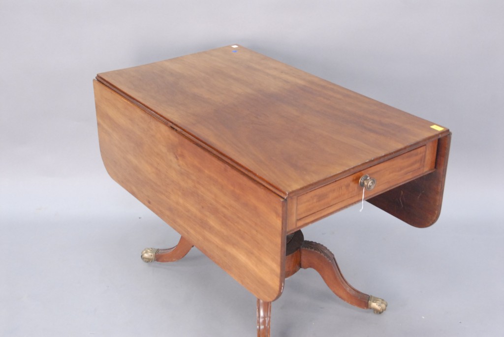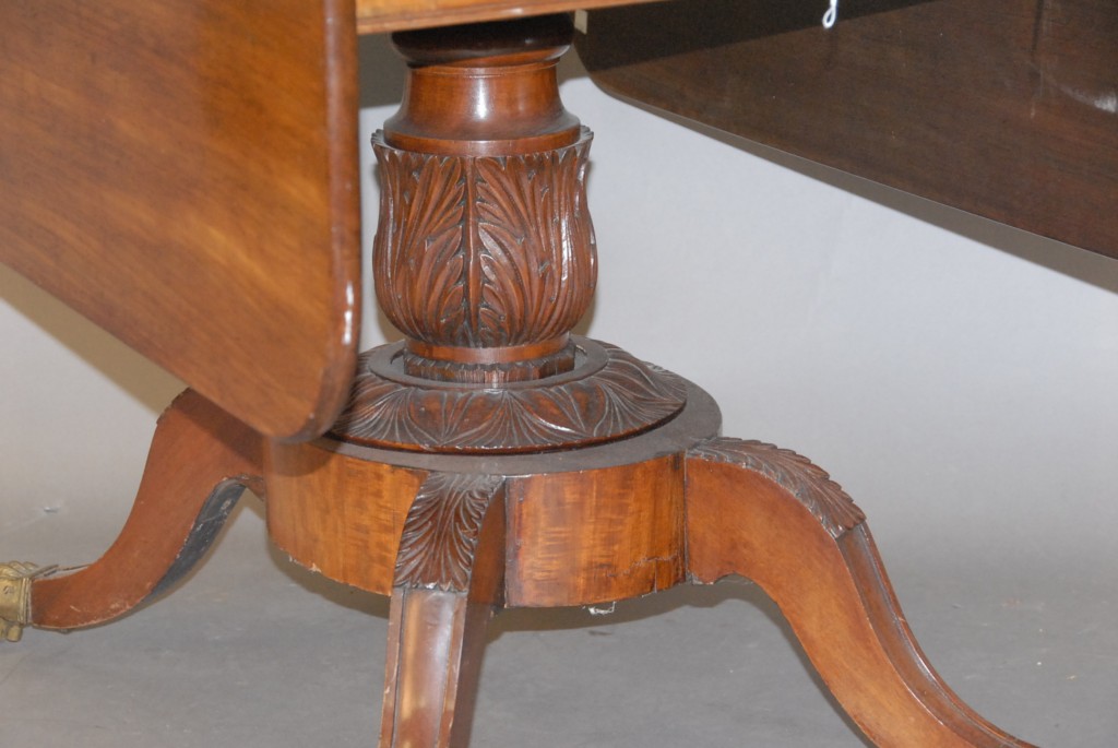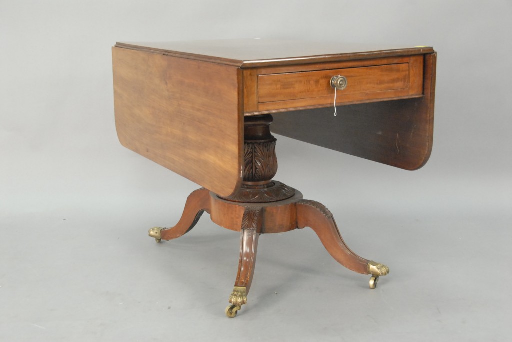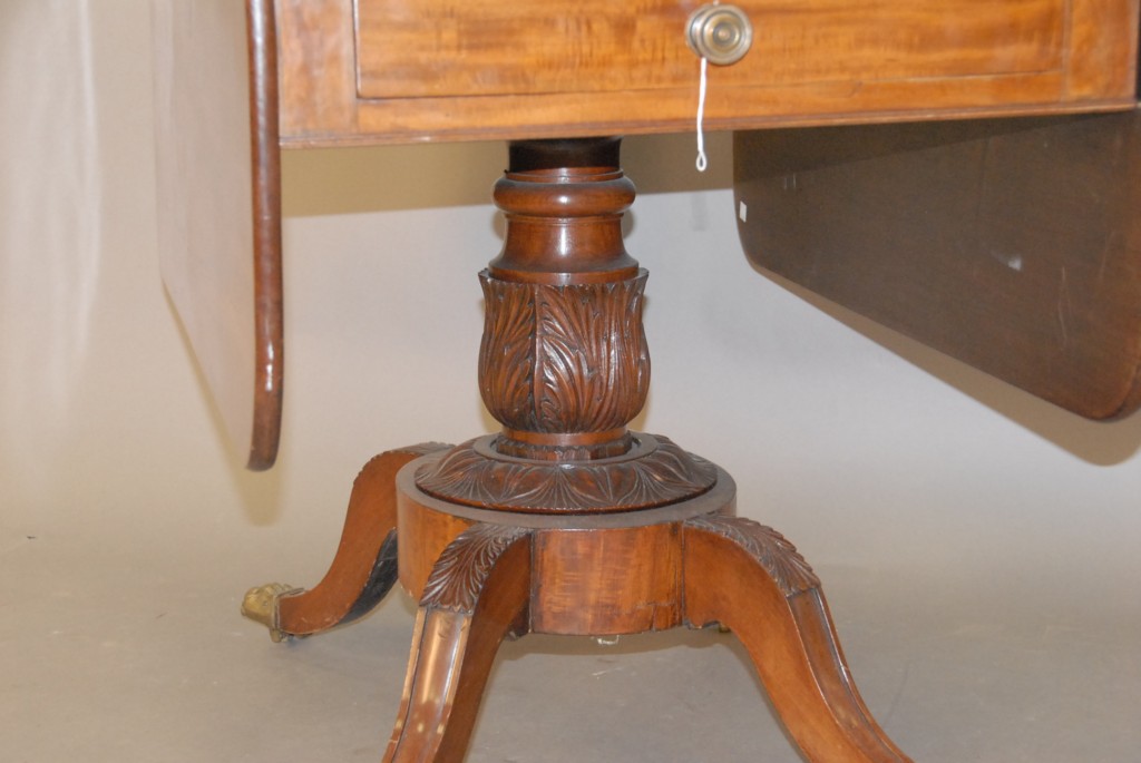 Duncan phyfe drop leaf table with carved base and drawer, circa 1840, ht. 28, lg. 40.