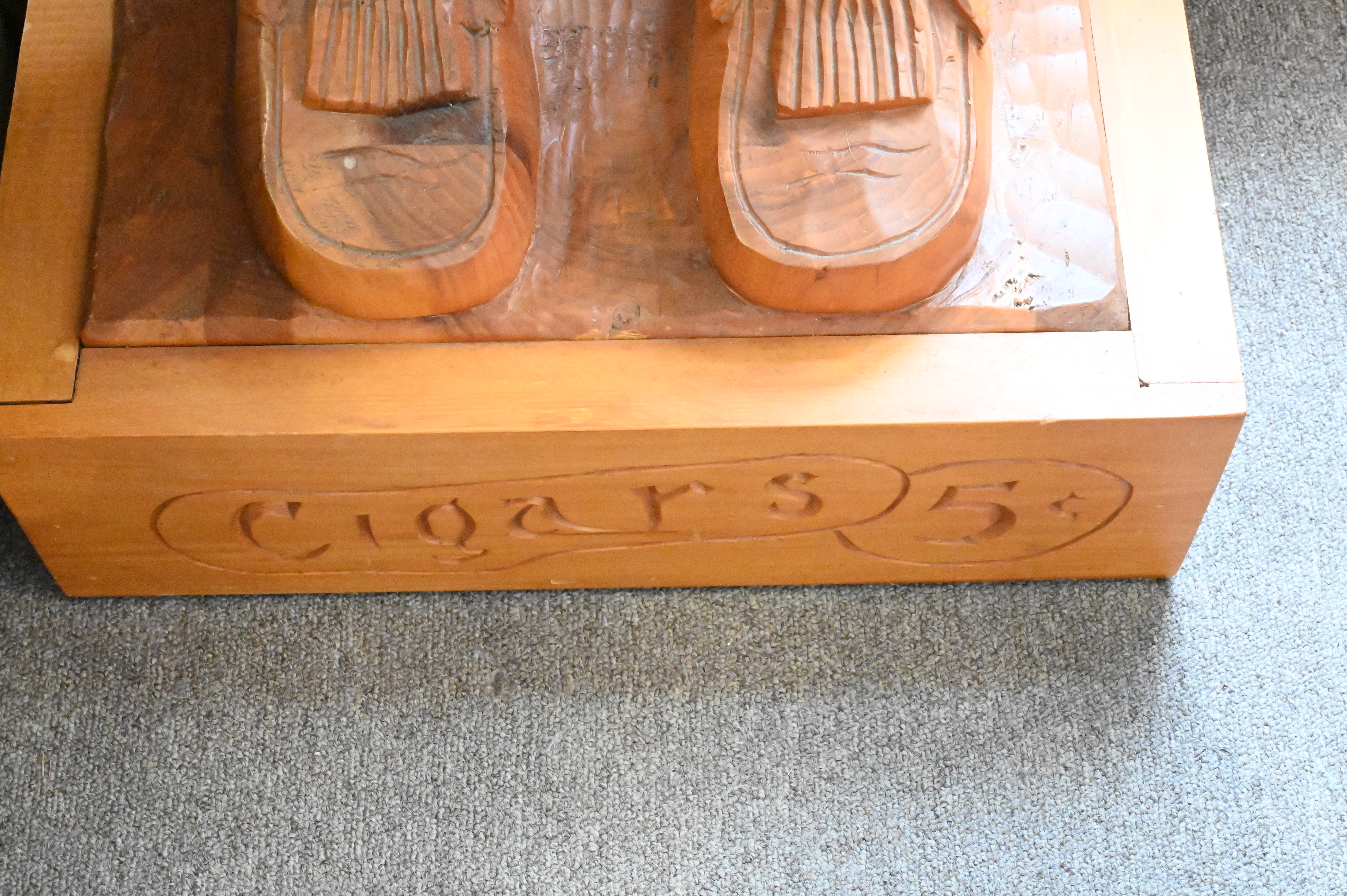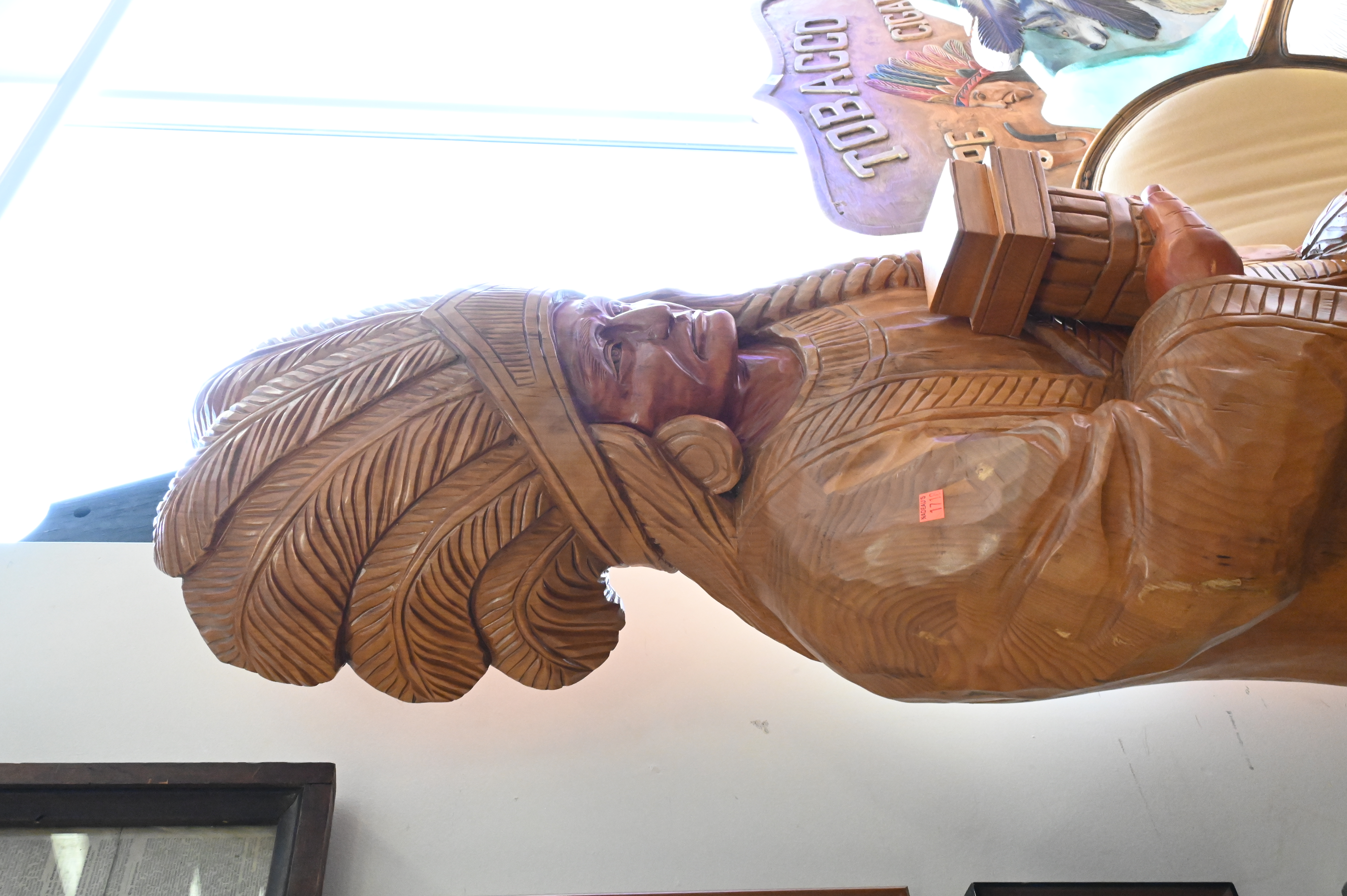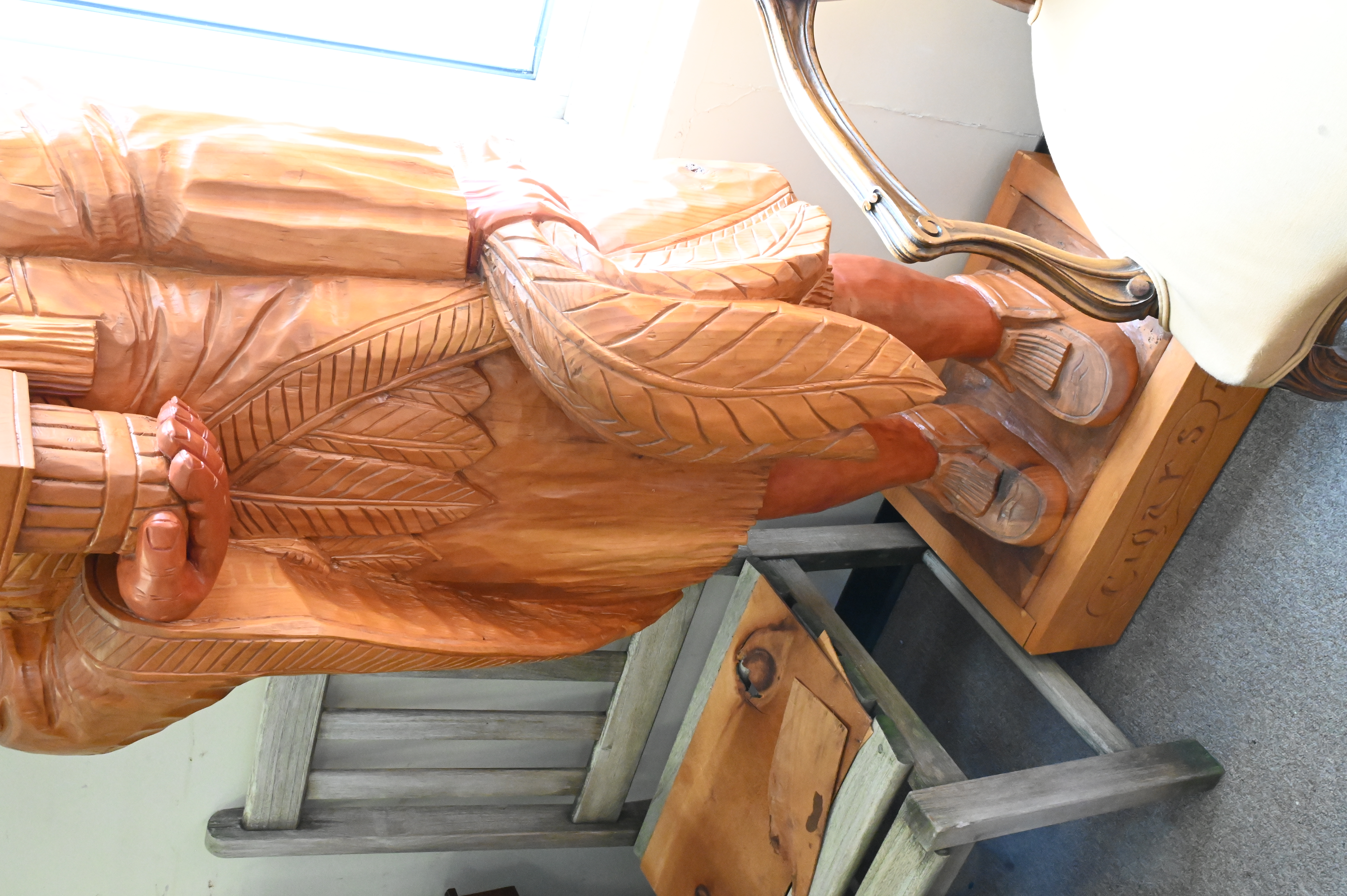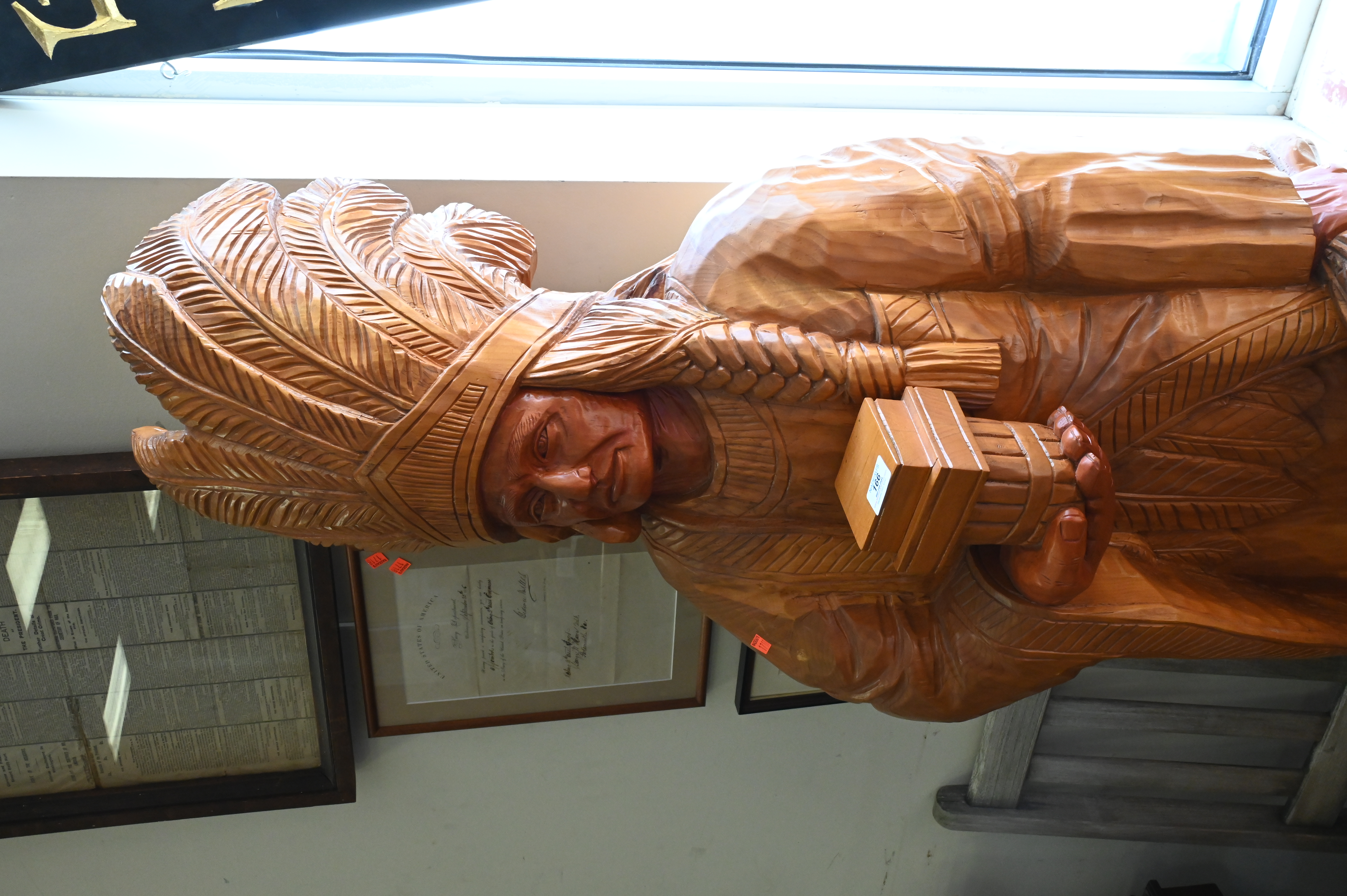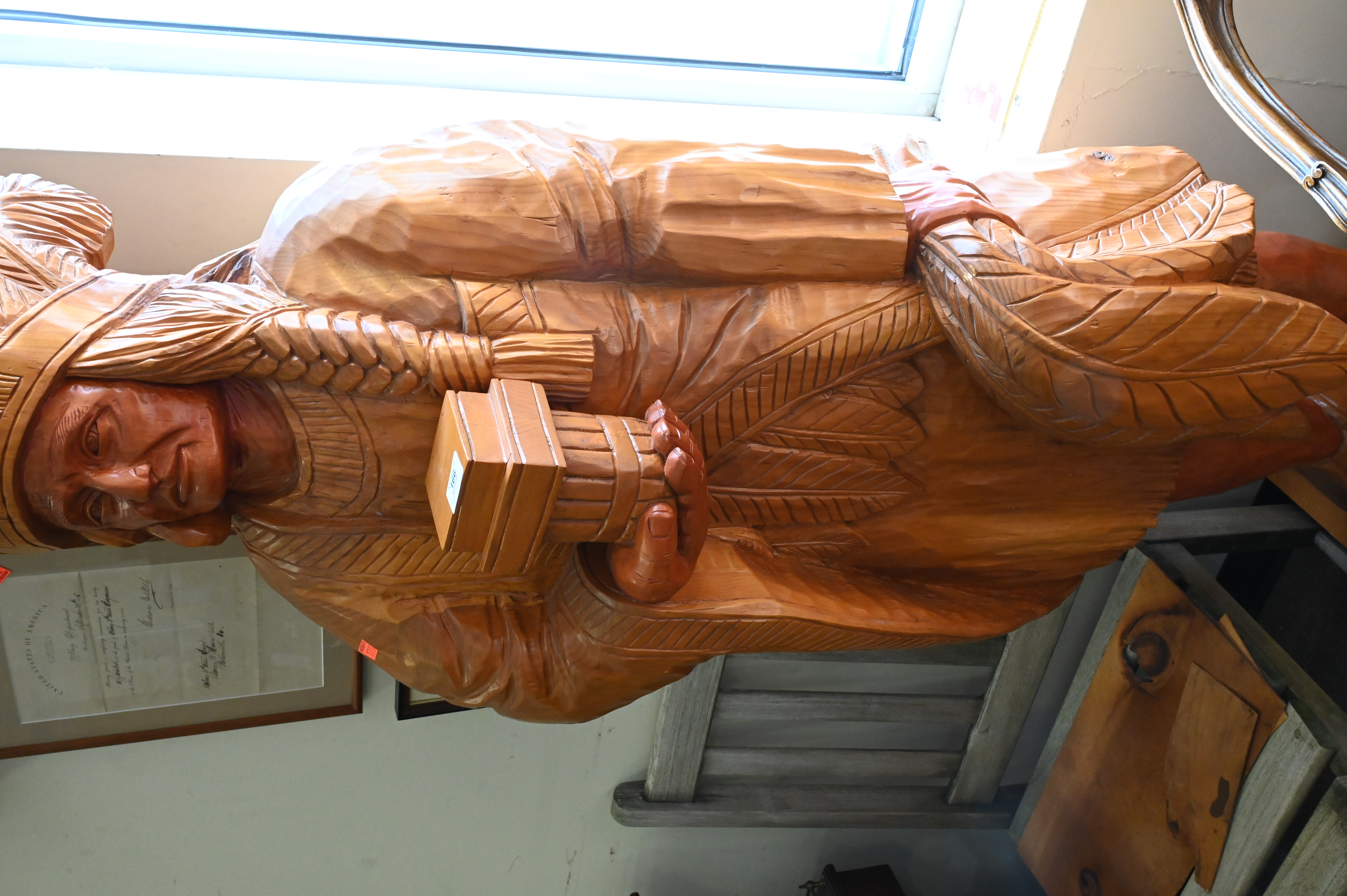 E.J. Boggs Cigar Store Indian Carved From Single Log, with original 1986 receipt, height 74 inches.