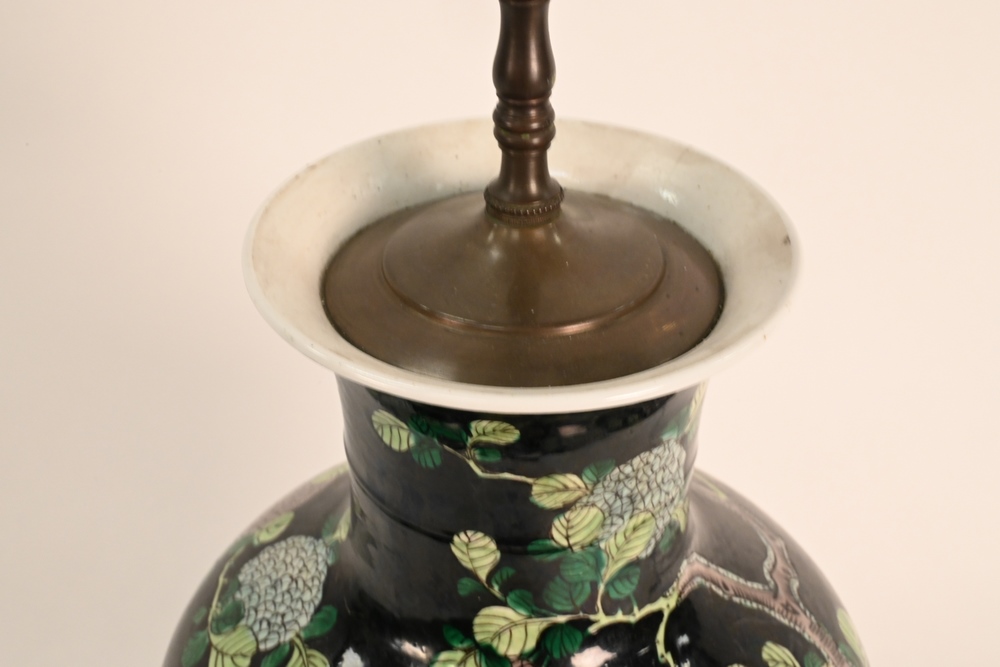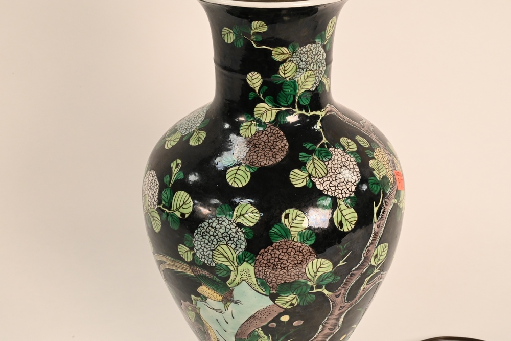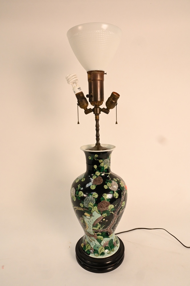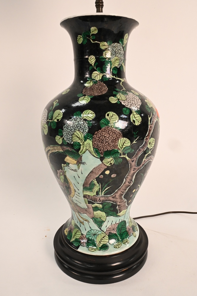 Lot 166: Famille Noire Chinese Porcelain Vase having phoenix bird and tree, made into a table lamp vase height 17 1/2 inches, total height 35 1/2 inches