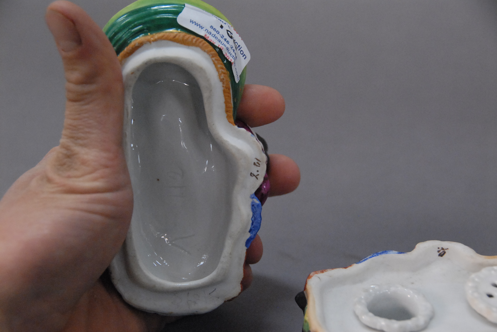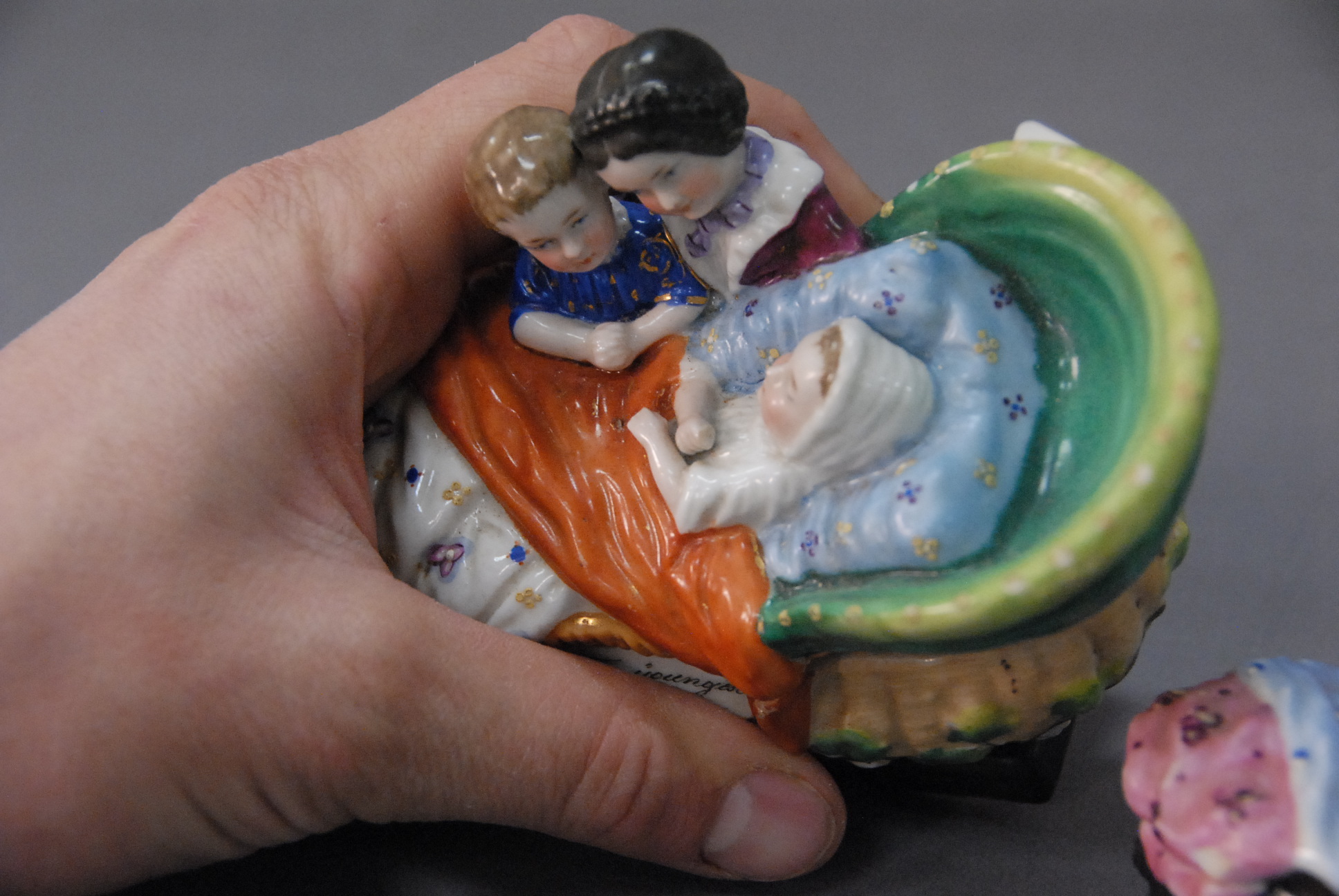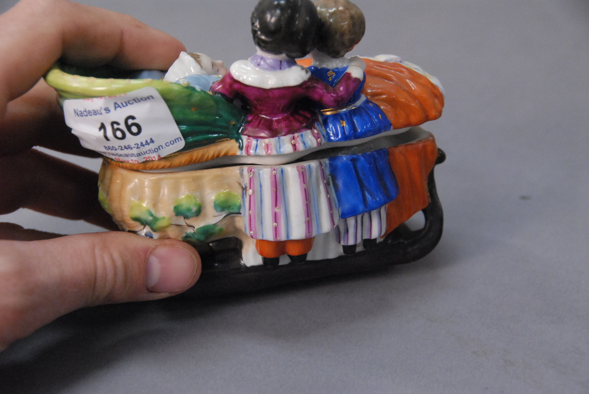 Lot 166: Figural porcelain inkwell, molded carriage with baby and two children watching him, top lifts to reveal ink pot and sander The Youn…