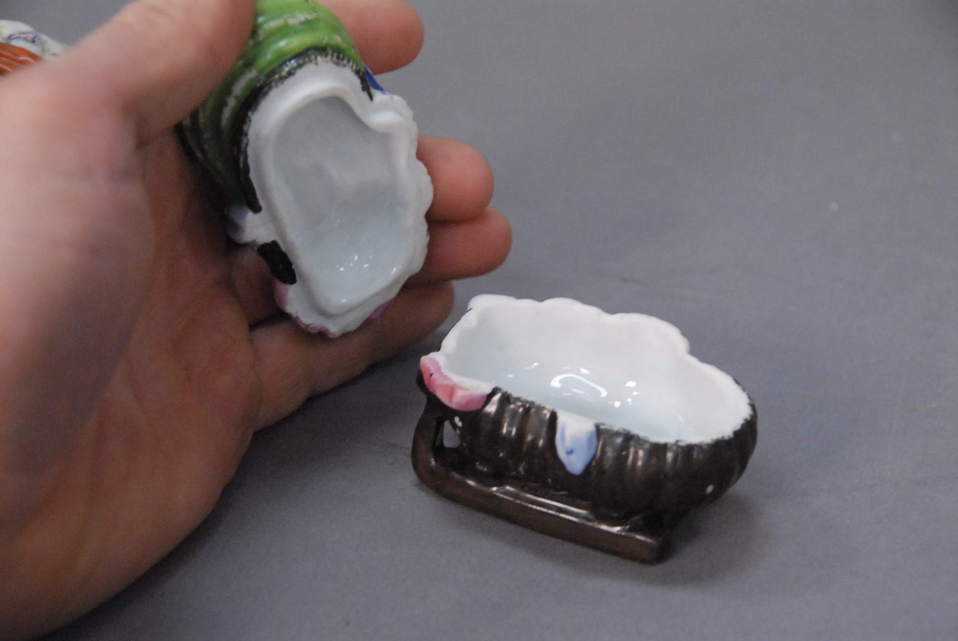 Figural porcelain inkwell, molded carriage with baby and two children watching him, top lifts to reveal ink pot and sander The Youngest Brother ht. 4in. lg. 5in. along with matching box.one hand chipped ht. 2 1/2in. lg. 3in.