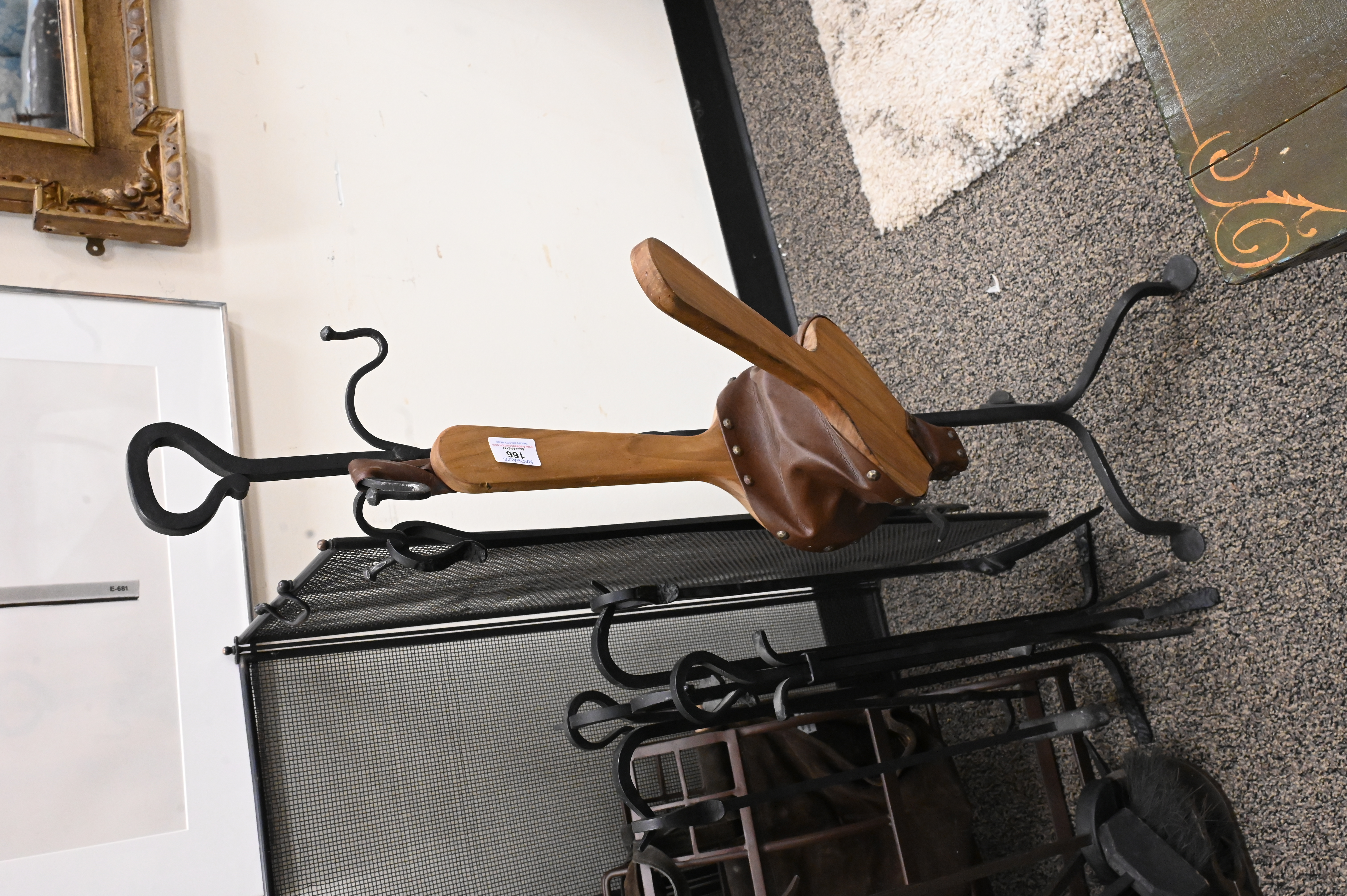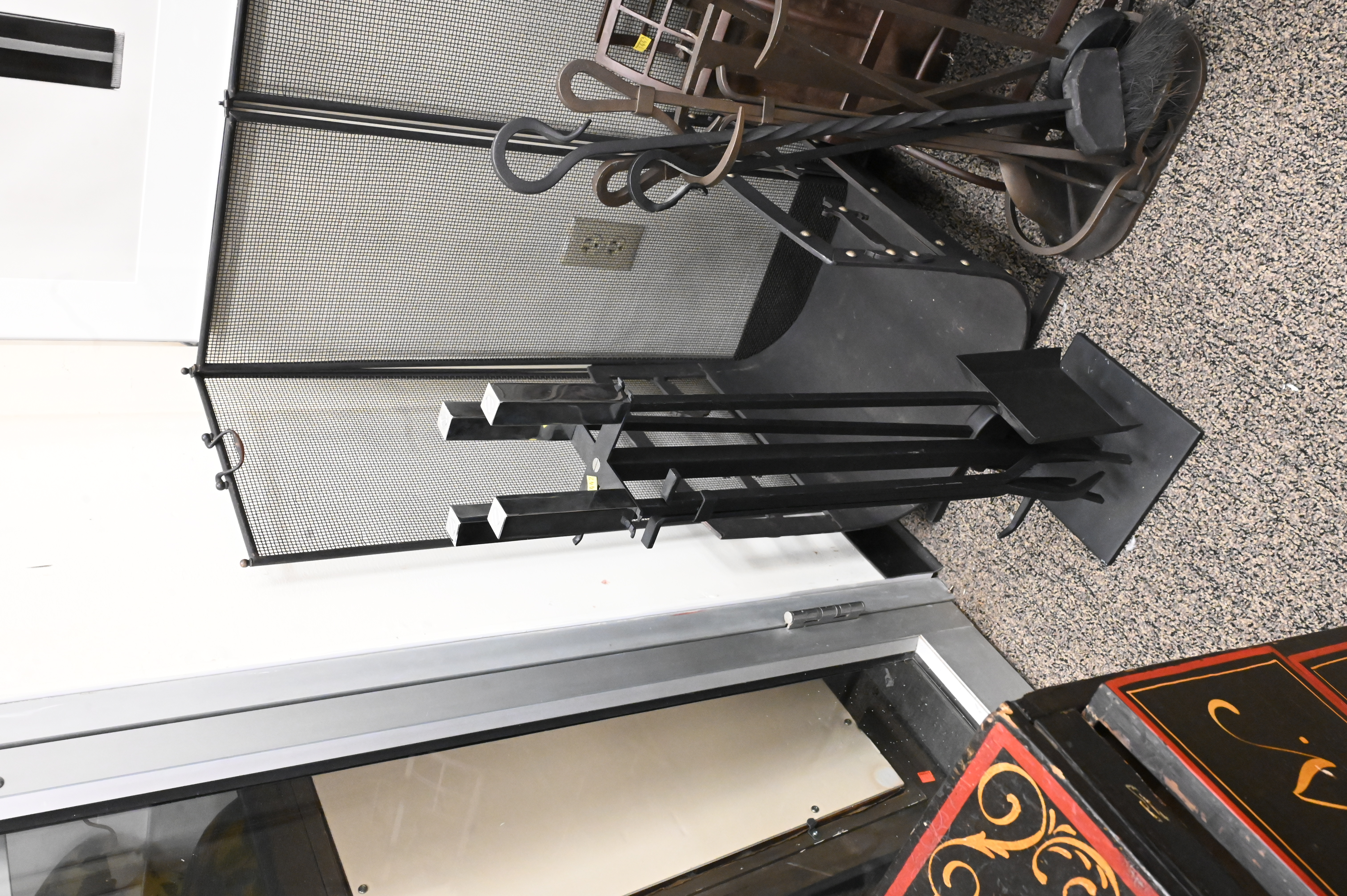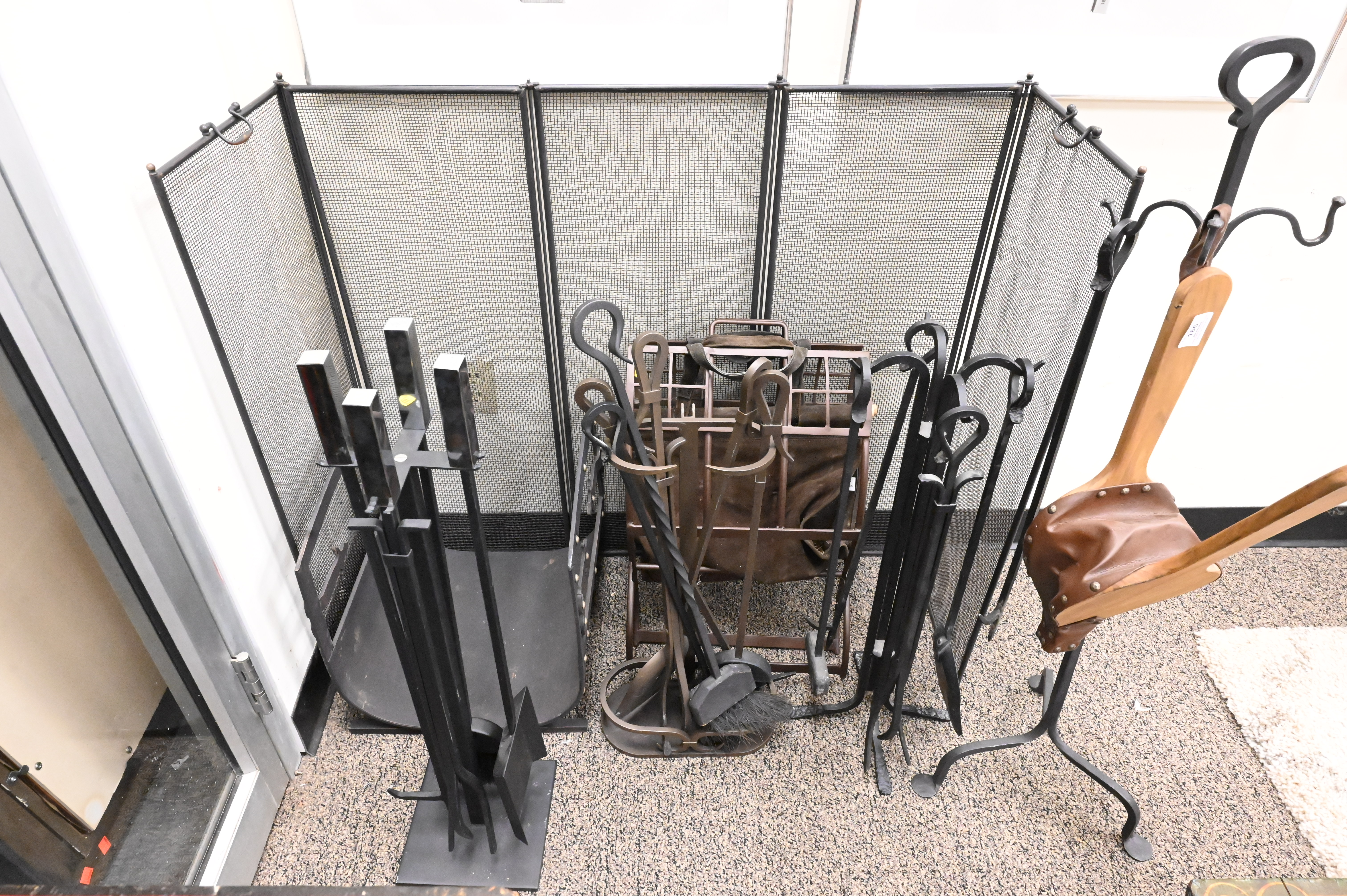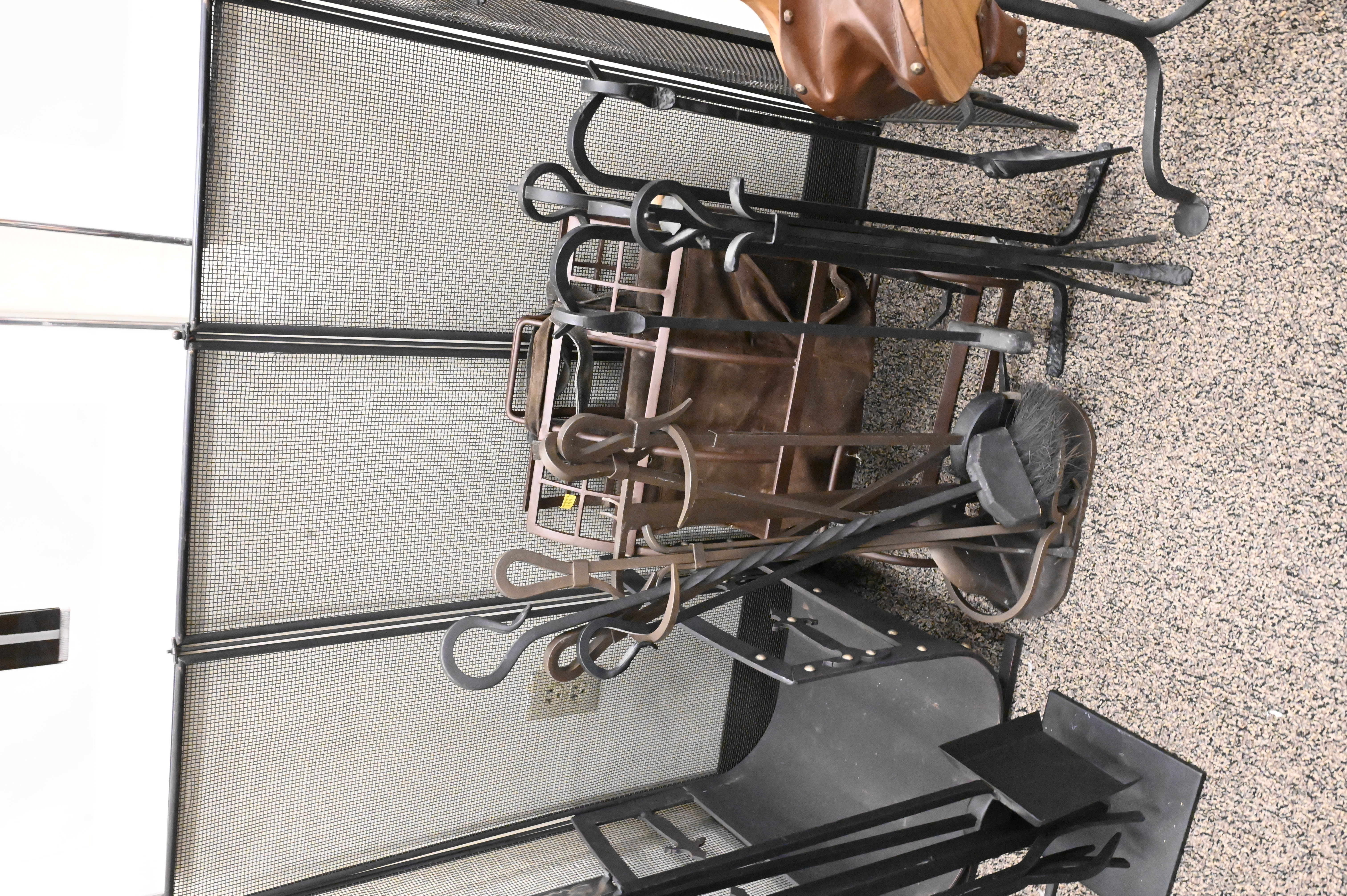 Fireplace Equipment, to include two log holders, four tool holders, along with one screen, length 64 inches.