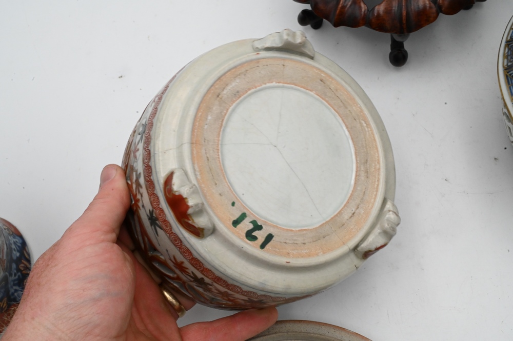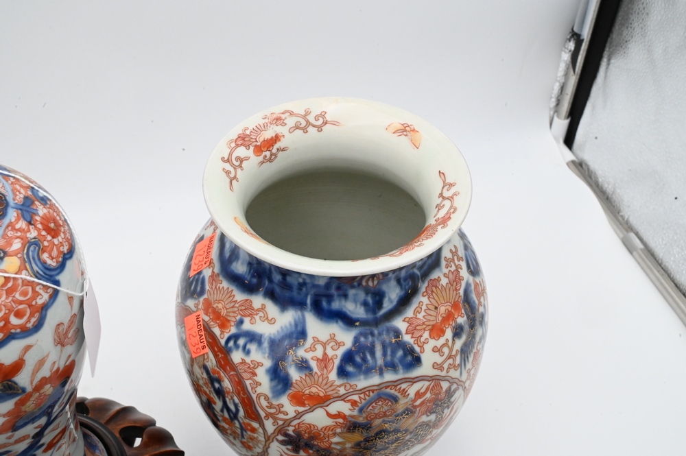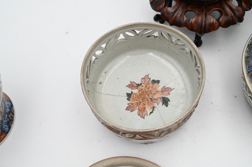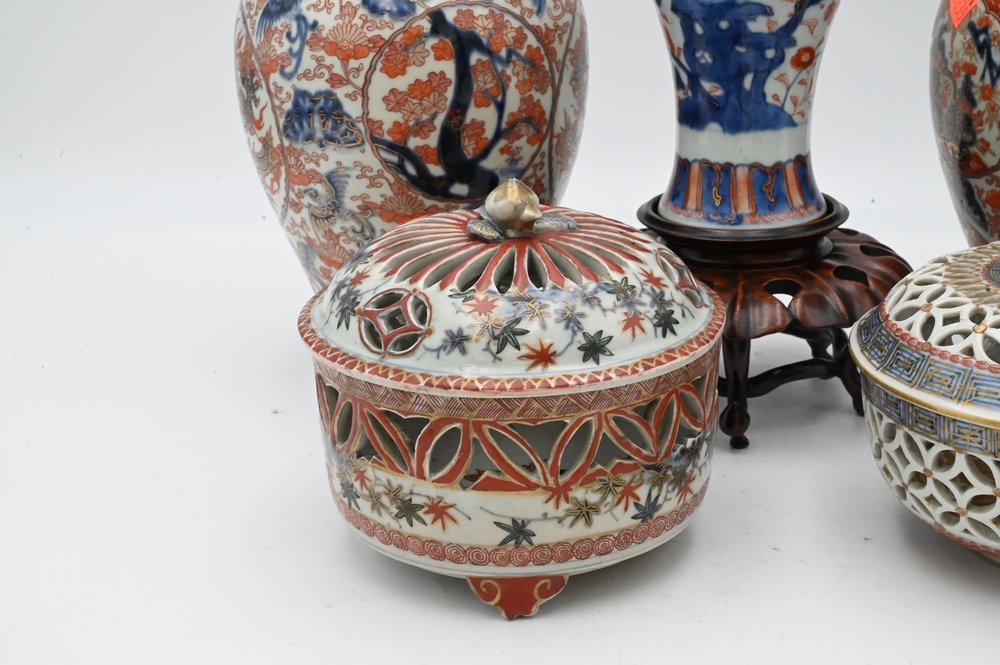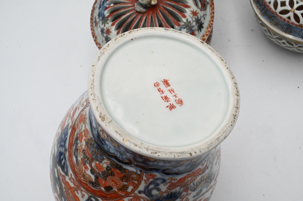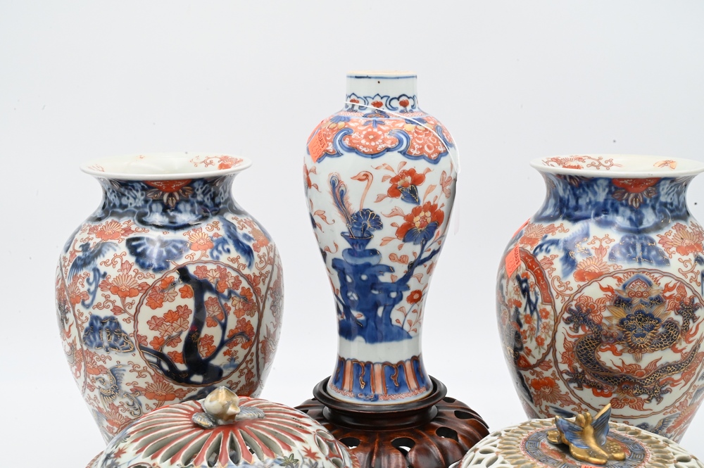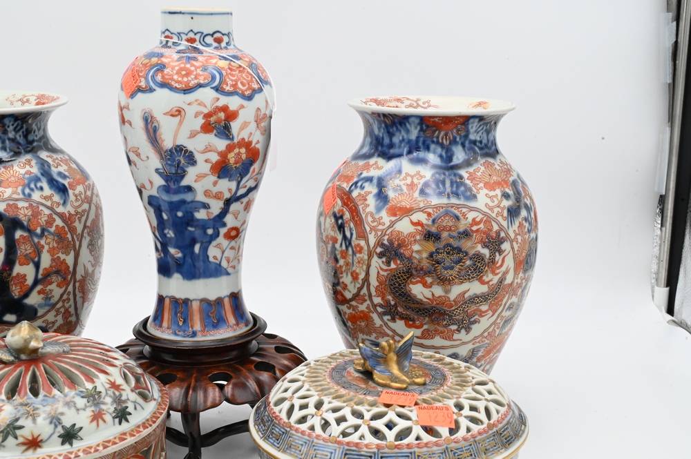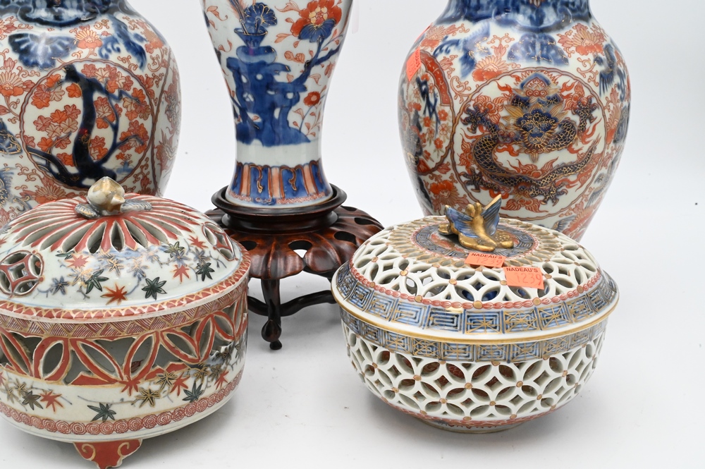 Five Piece Group of Imari Porcelain, to include two reticulated covered boxes; a pair of vases, height 10 inches; along with a vase on carved stand.