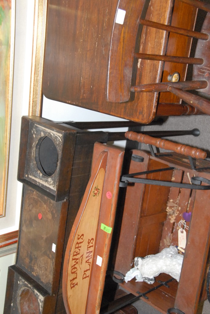 Group lot doll’s wicker carriage, flower cart, youth chair, one drawer stand, and plant stand.